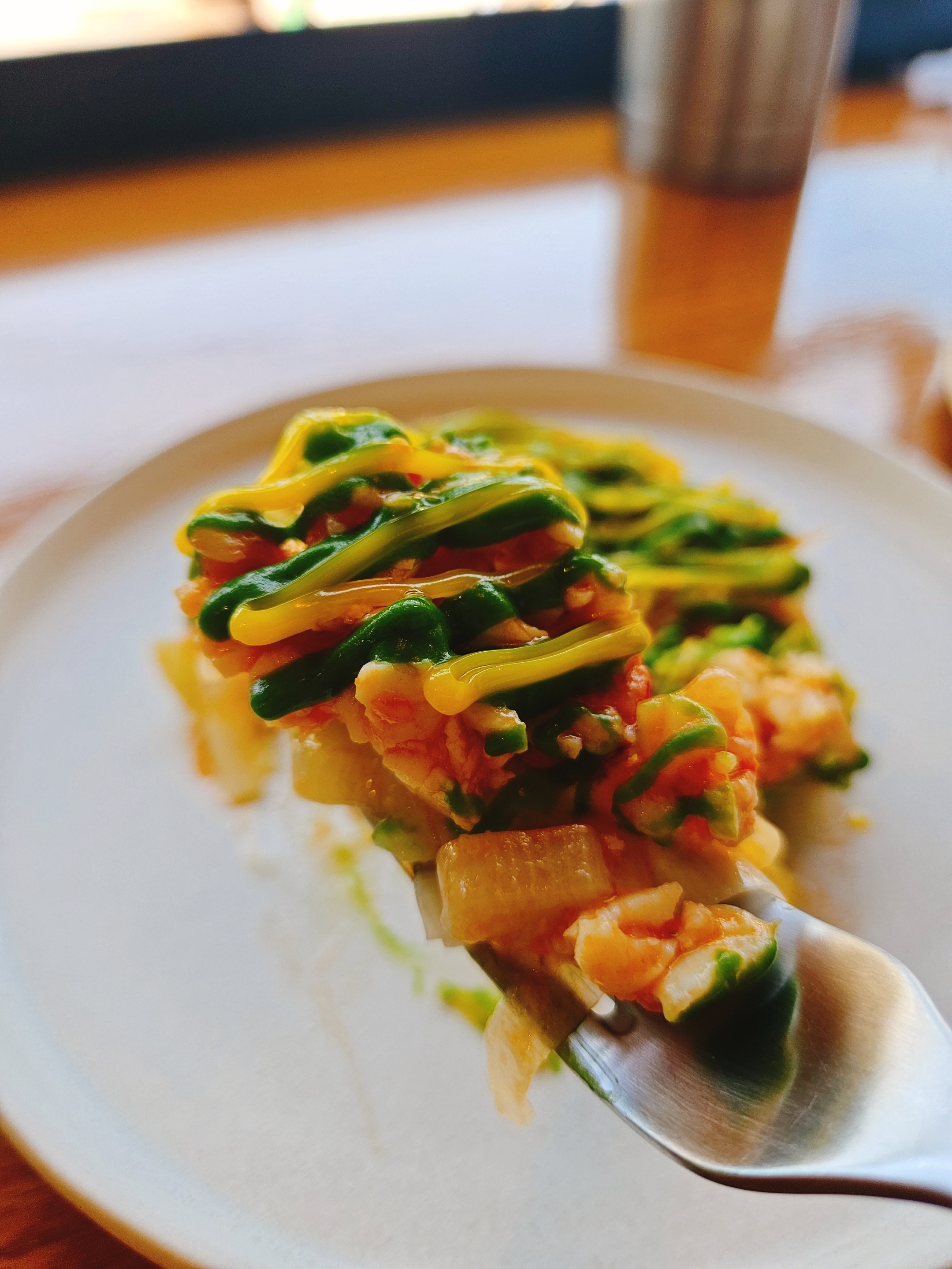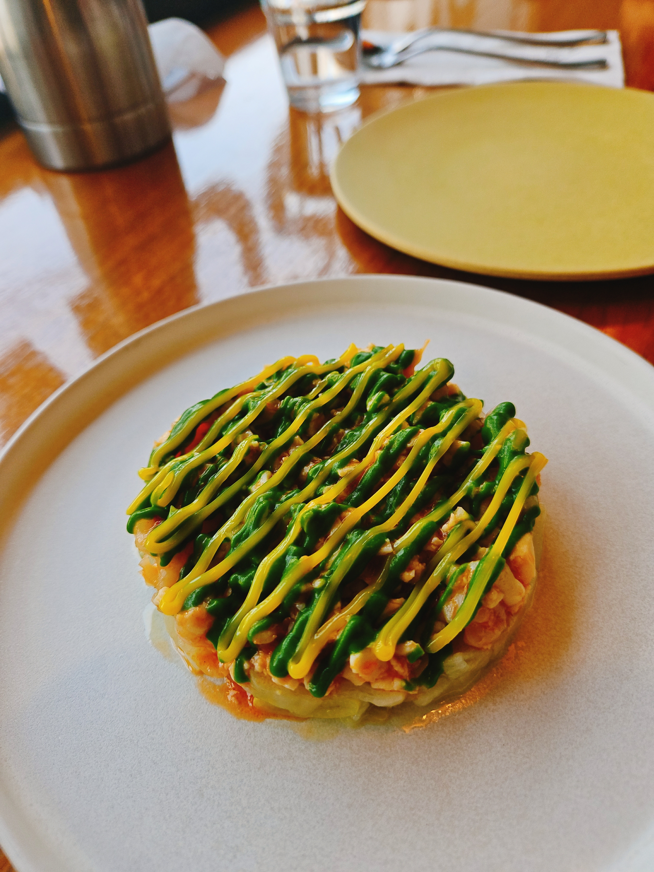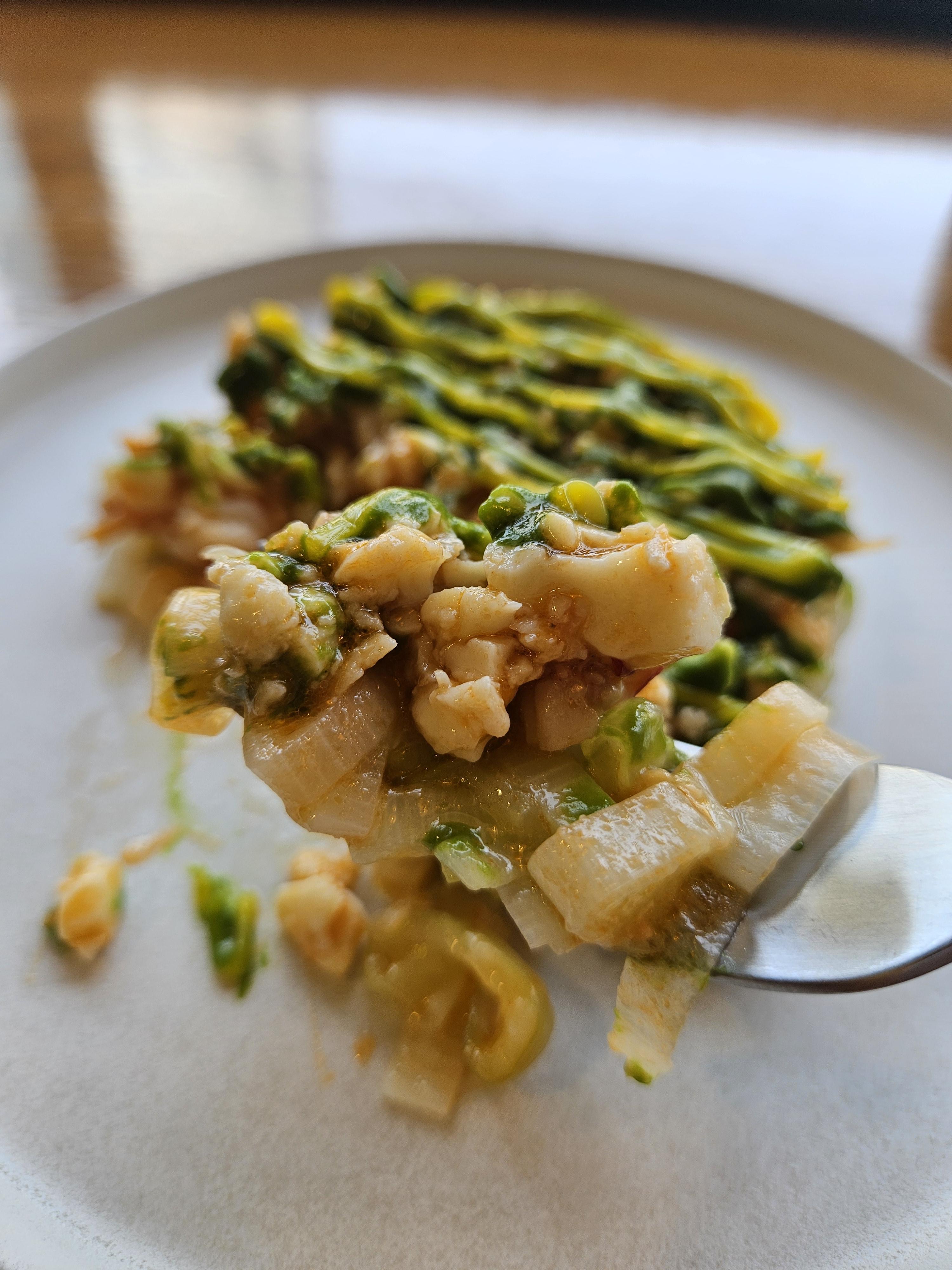 스몰 디쉬먼저 제공됐고 맵지 않게 손질한 대파와 매콤 짭조름한 새우살에 계란 노른자와 파 소스를 뿌려 둥글 납작하게 담아낸 요리로 아래서부터 떠먹으면 된다고 함.
