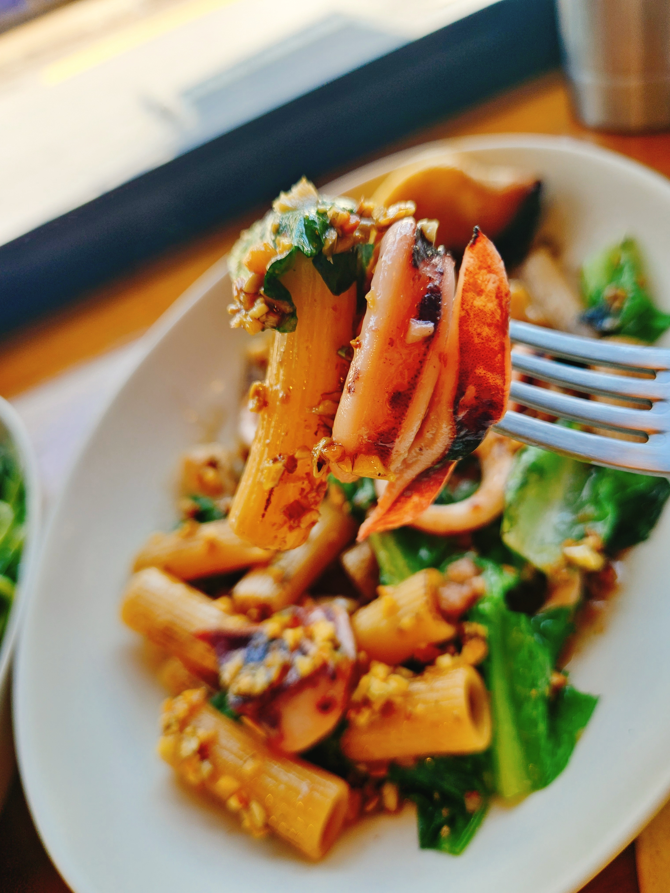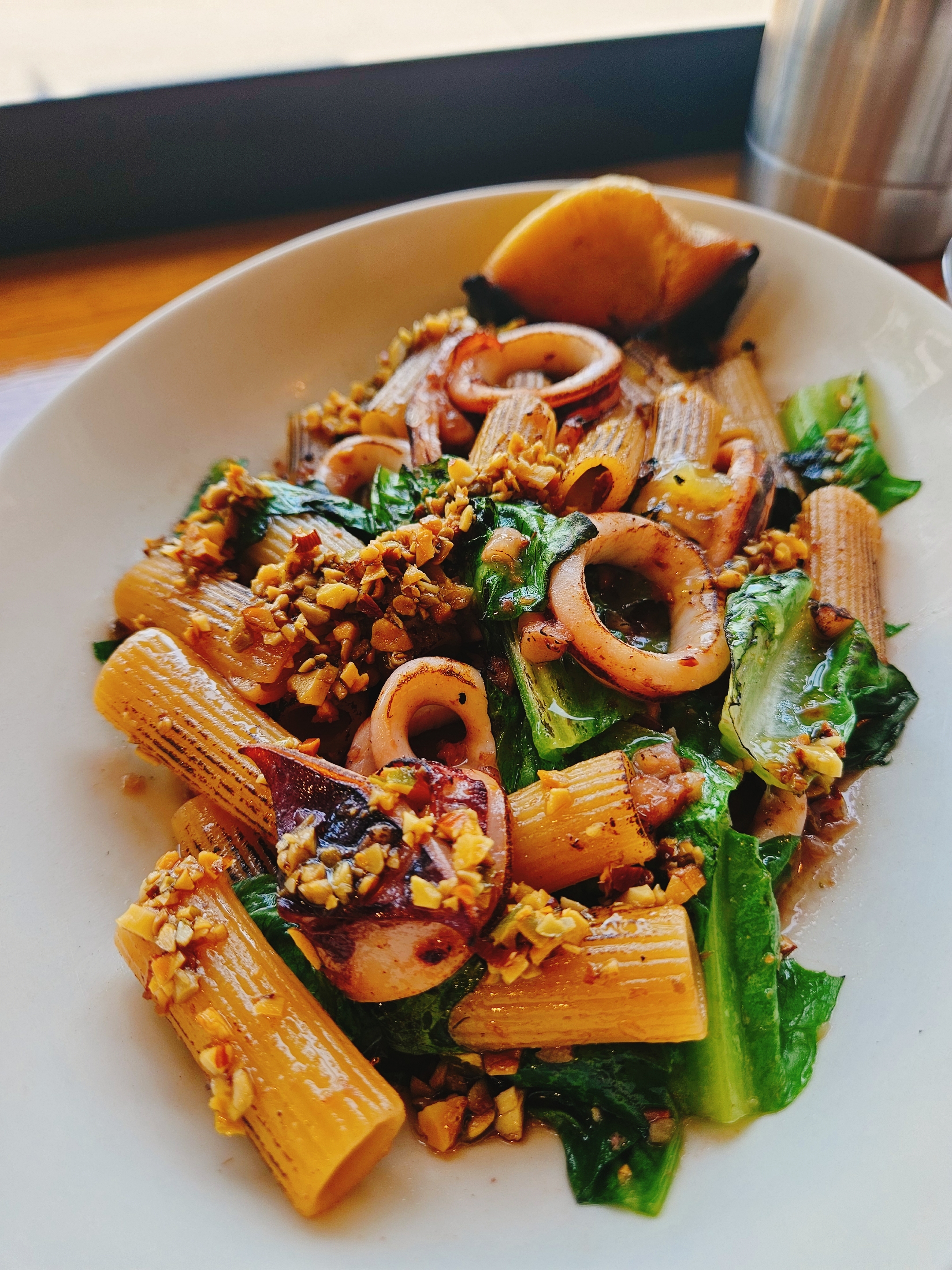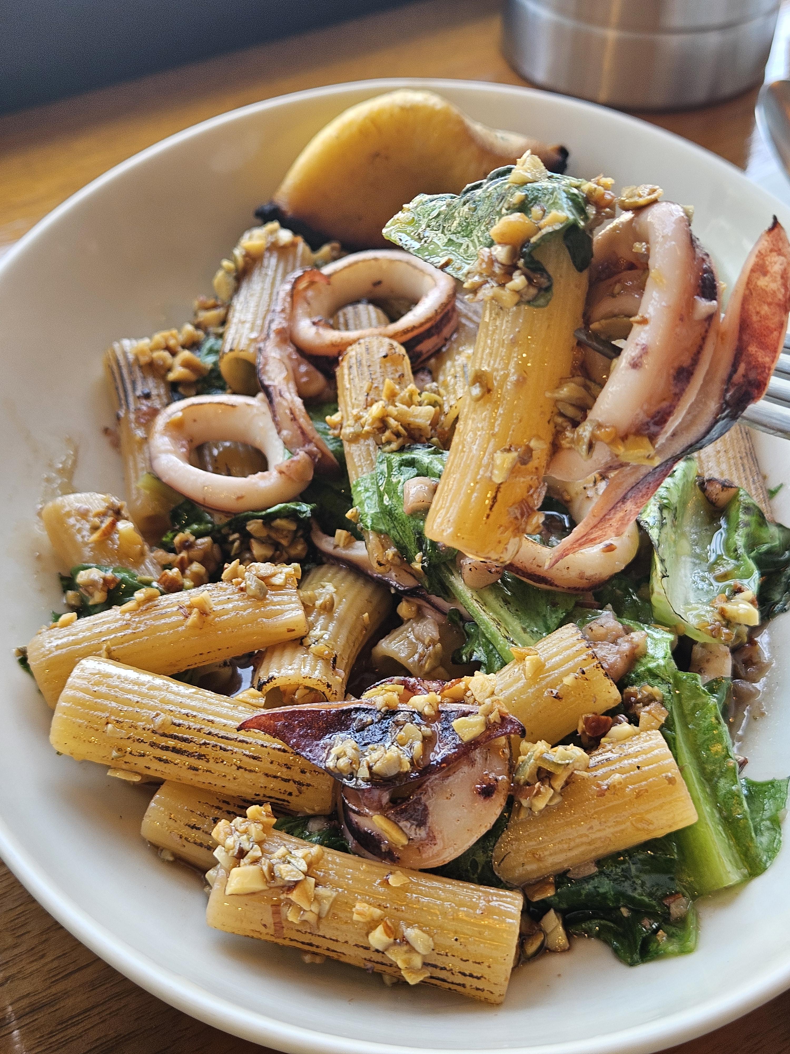 브라운 버터, 오징어, 로메인, 견과류로 맛을 내어 고소하고 담백하며 쫄깃 오독오독한 식감이 매력적인 맛인데 재료 조합 등 모두 괜찮았지만 역시 간간해서 그냥 먹긴 좀 짜더라.