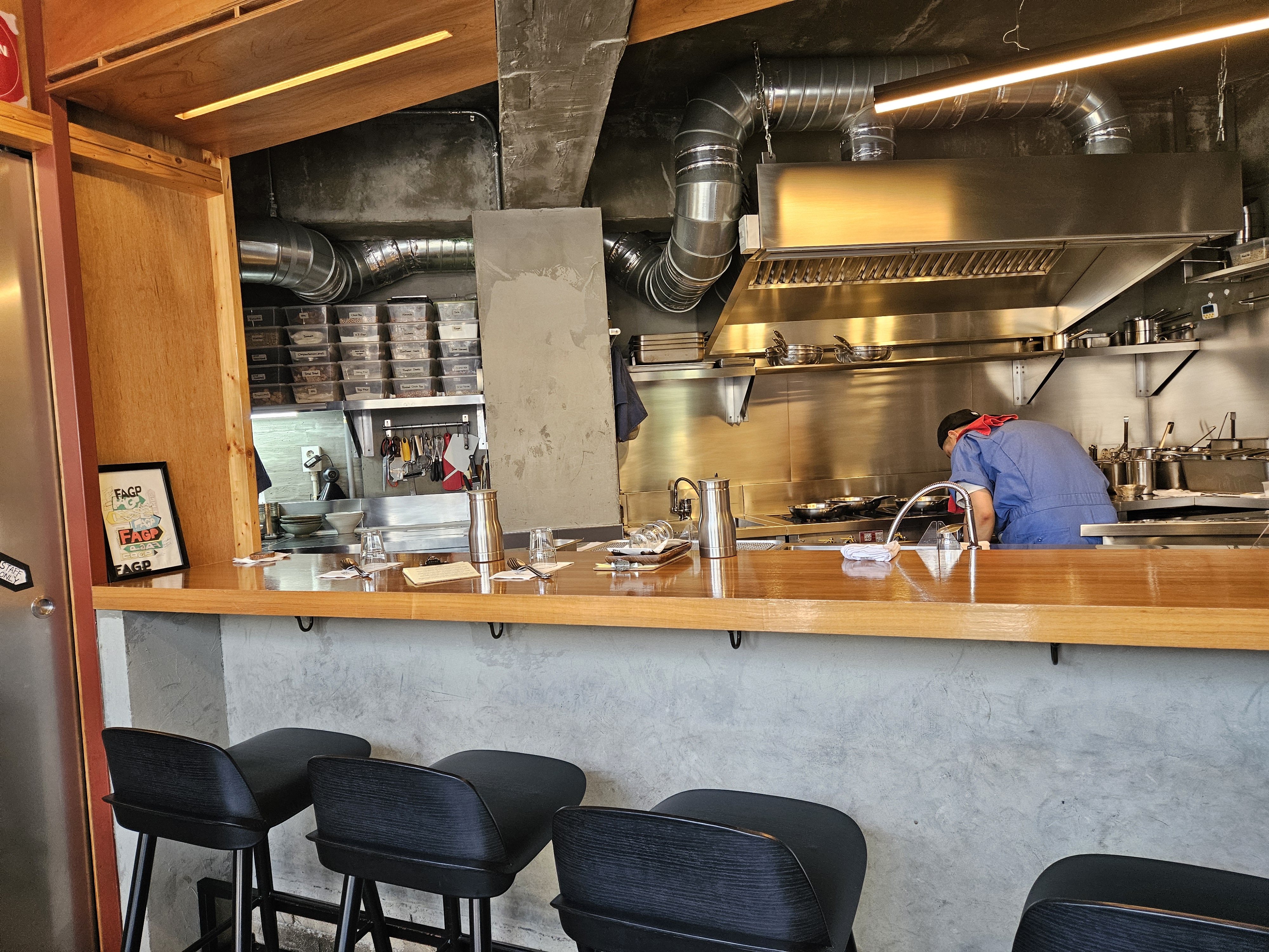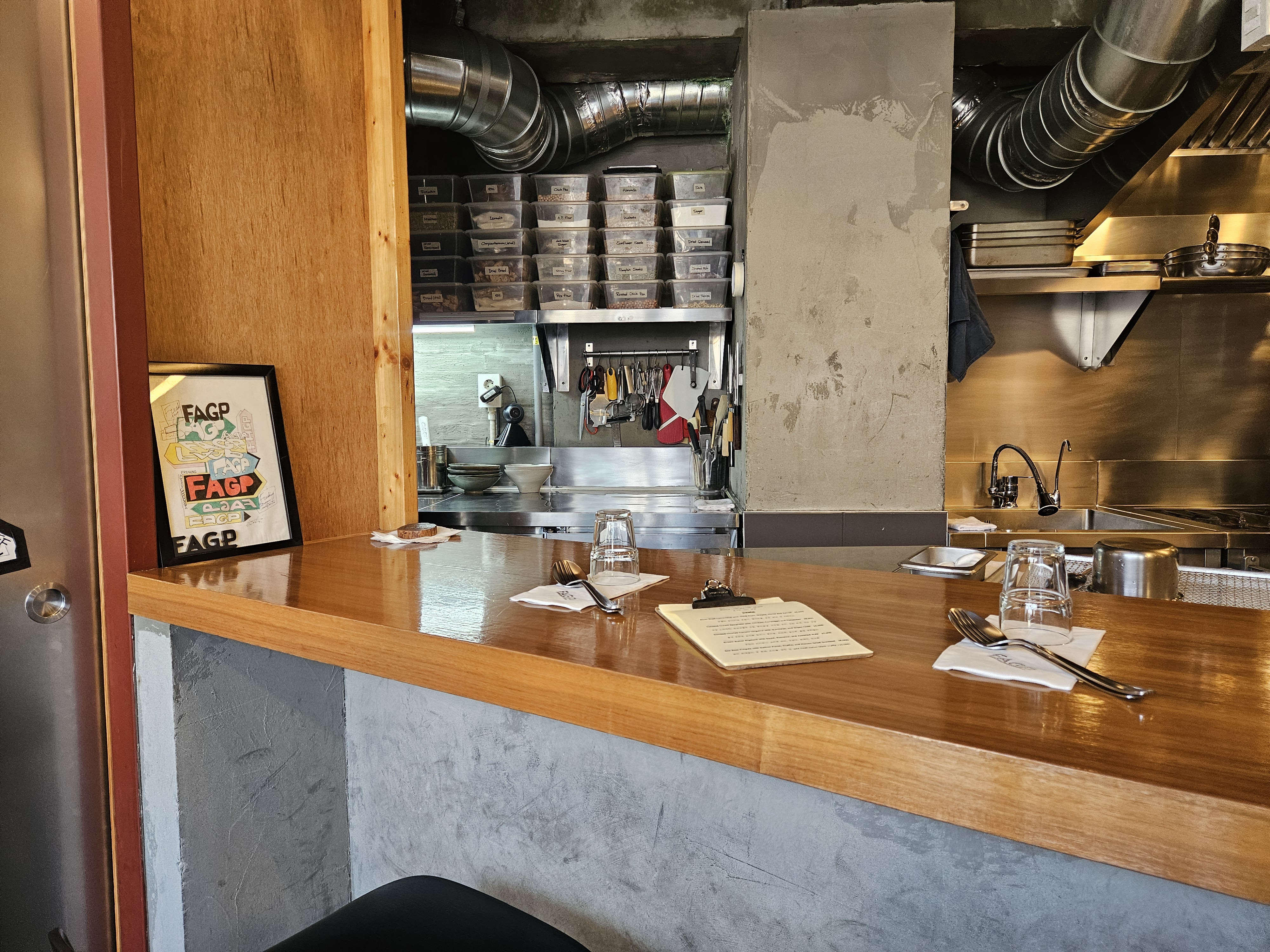 예약시간 15분 전에 도착해서 비번 찍고 들어가니 아담하면서 캐주얼한 분위기의 매장으로 오픈형 키친이라 음식 맛이 더 기대되더라.