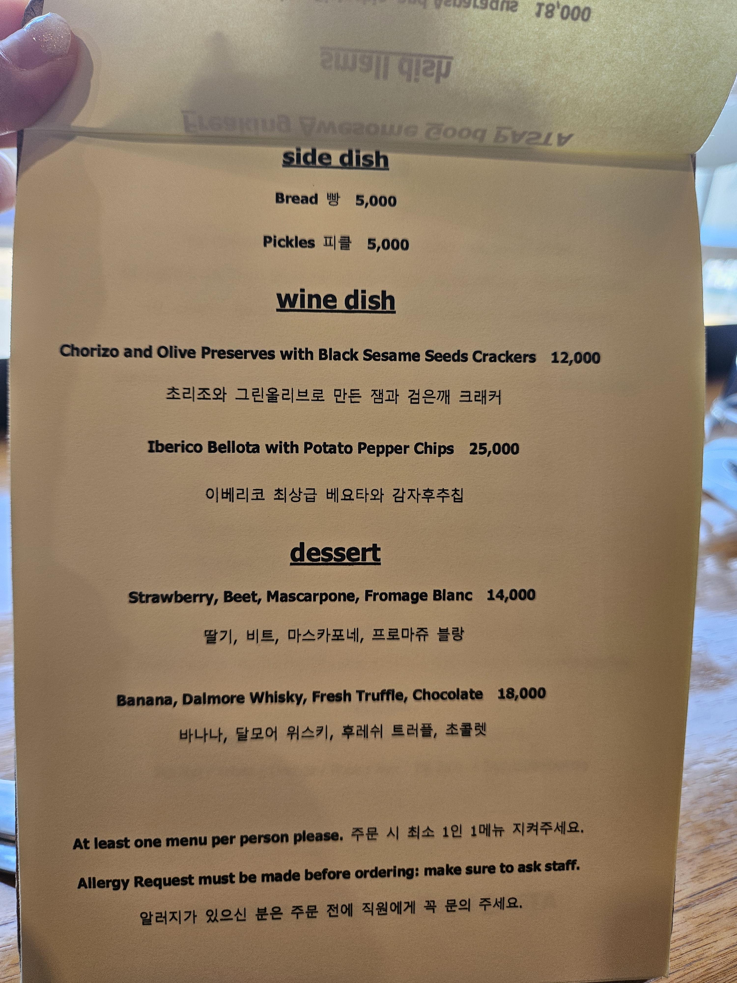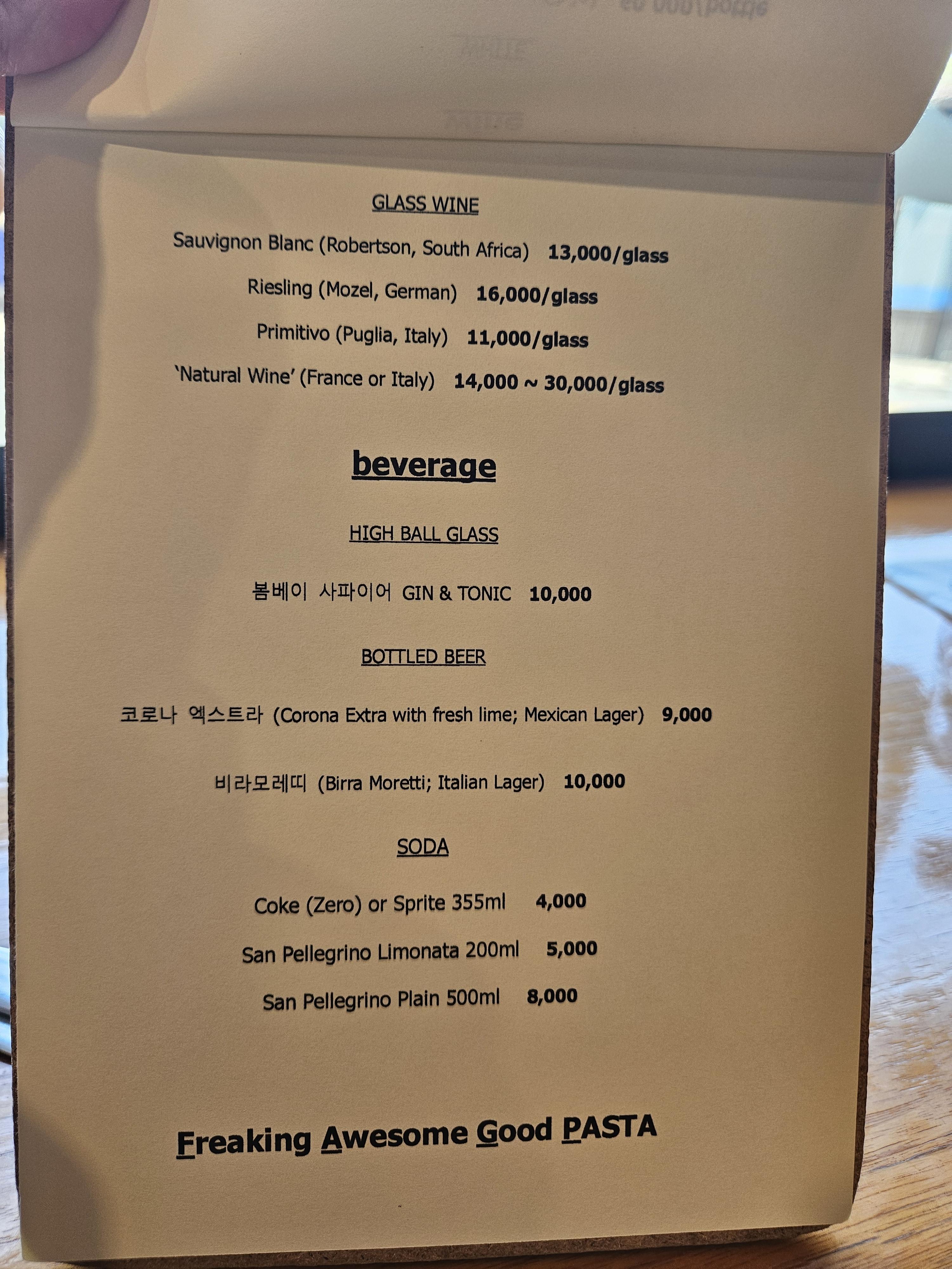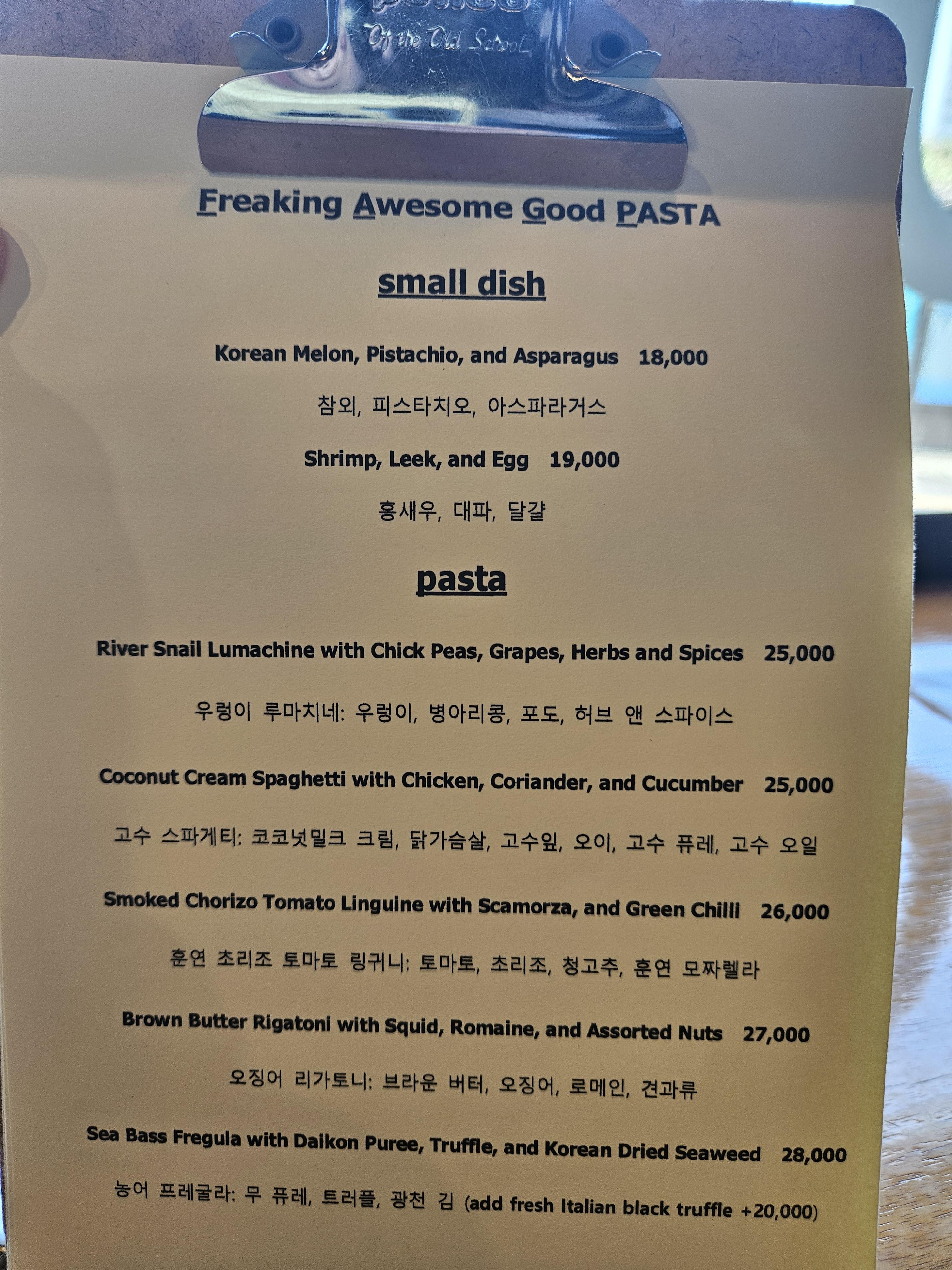 일행이 도착해서 메뉴 살펴봤는데 스몰 디쉬 2가지, 파스타는 5종류, 와인 디쉬와 디저트 각 2가지, 파스타 전문점이면 식전빵과 피클은 기본 무료 제공할 만하기도 한데 사이드 디쉬로 빵과 피클을 각 5천 원씩 받고 있었다.