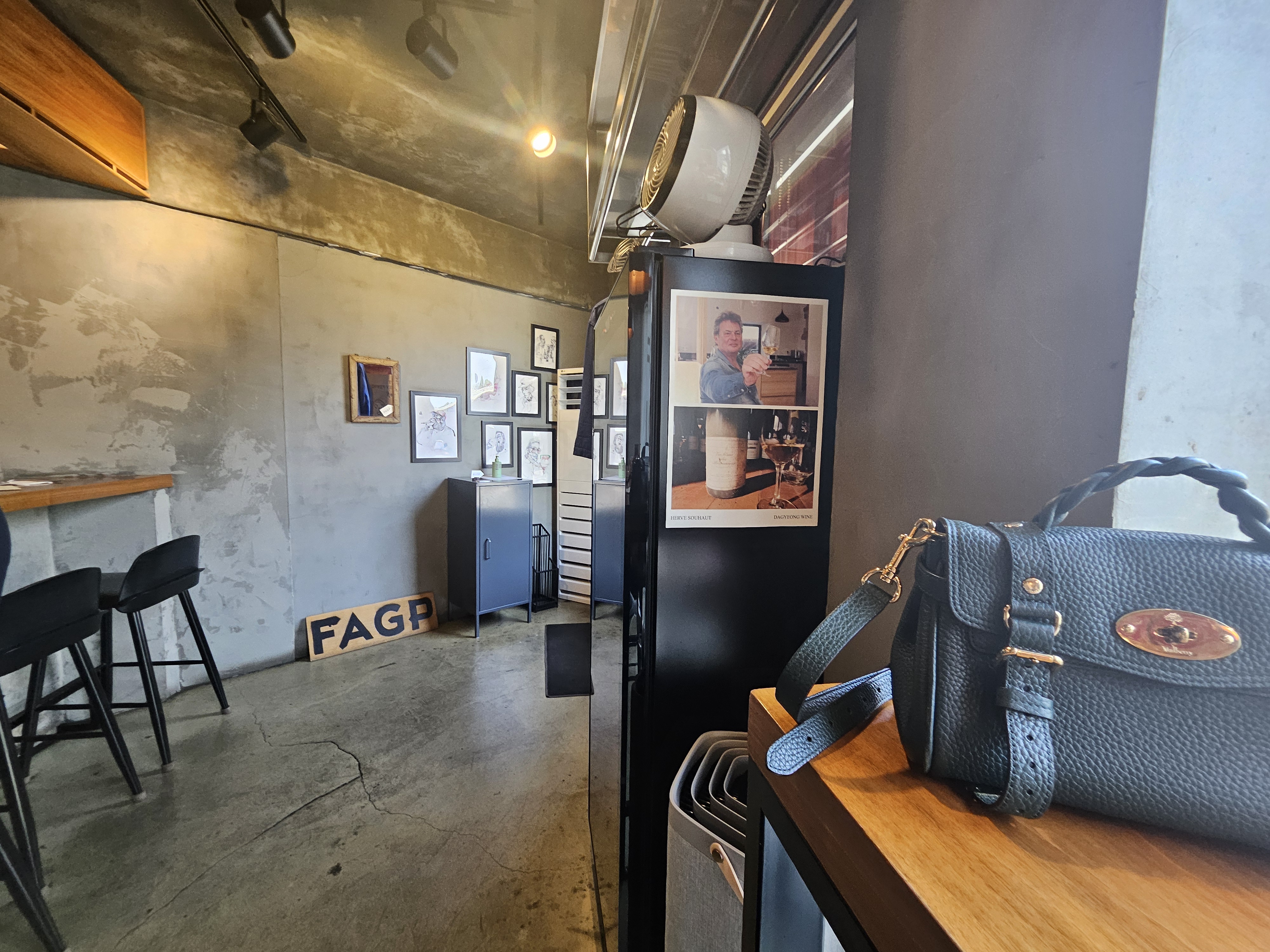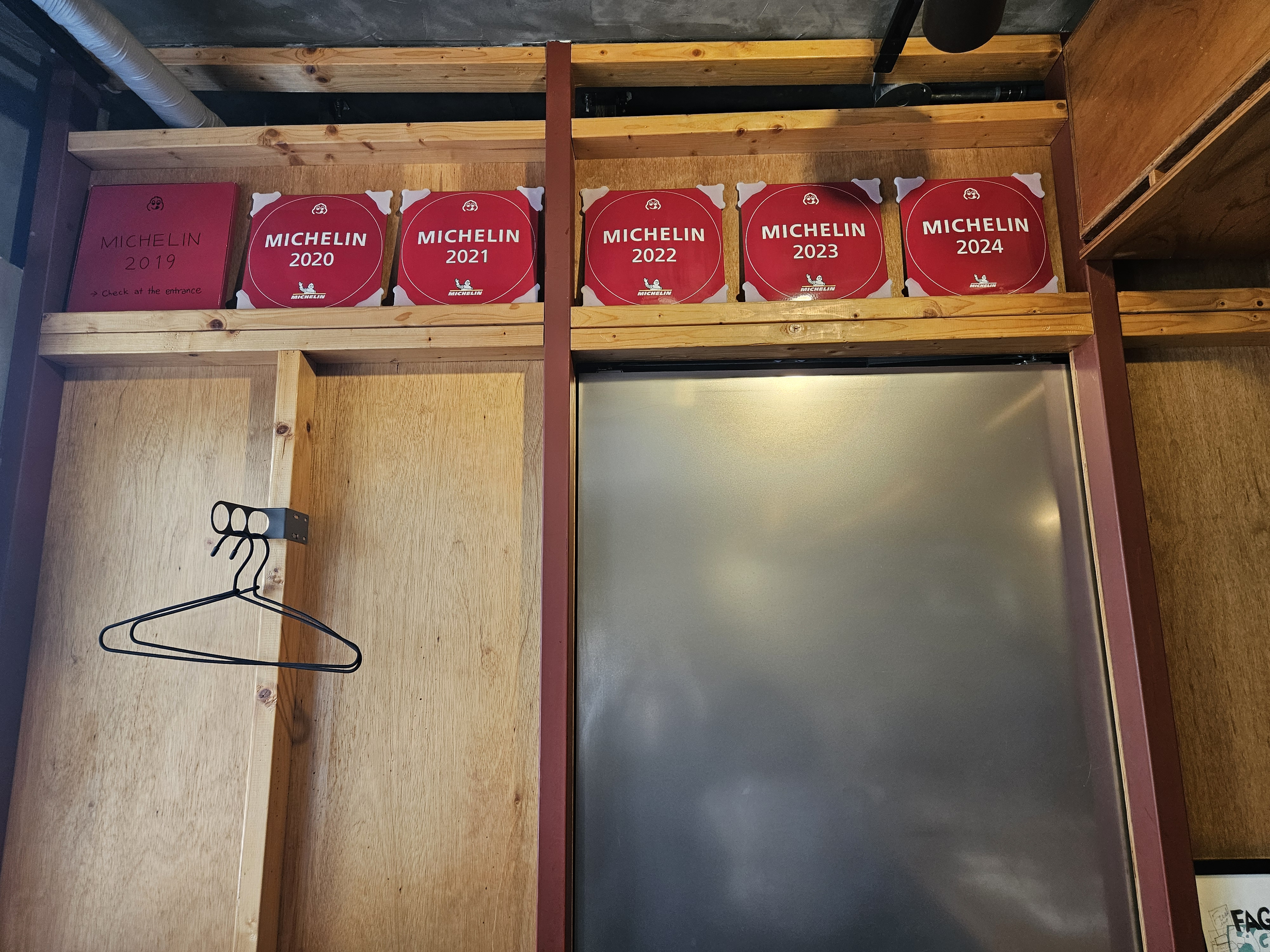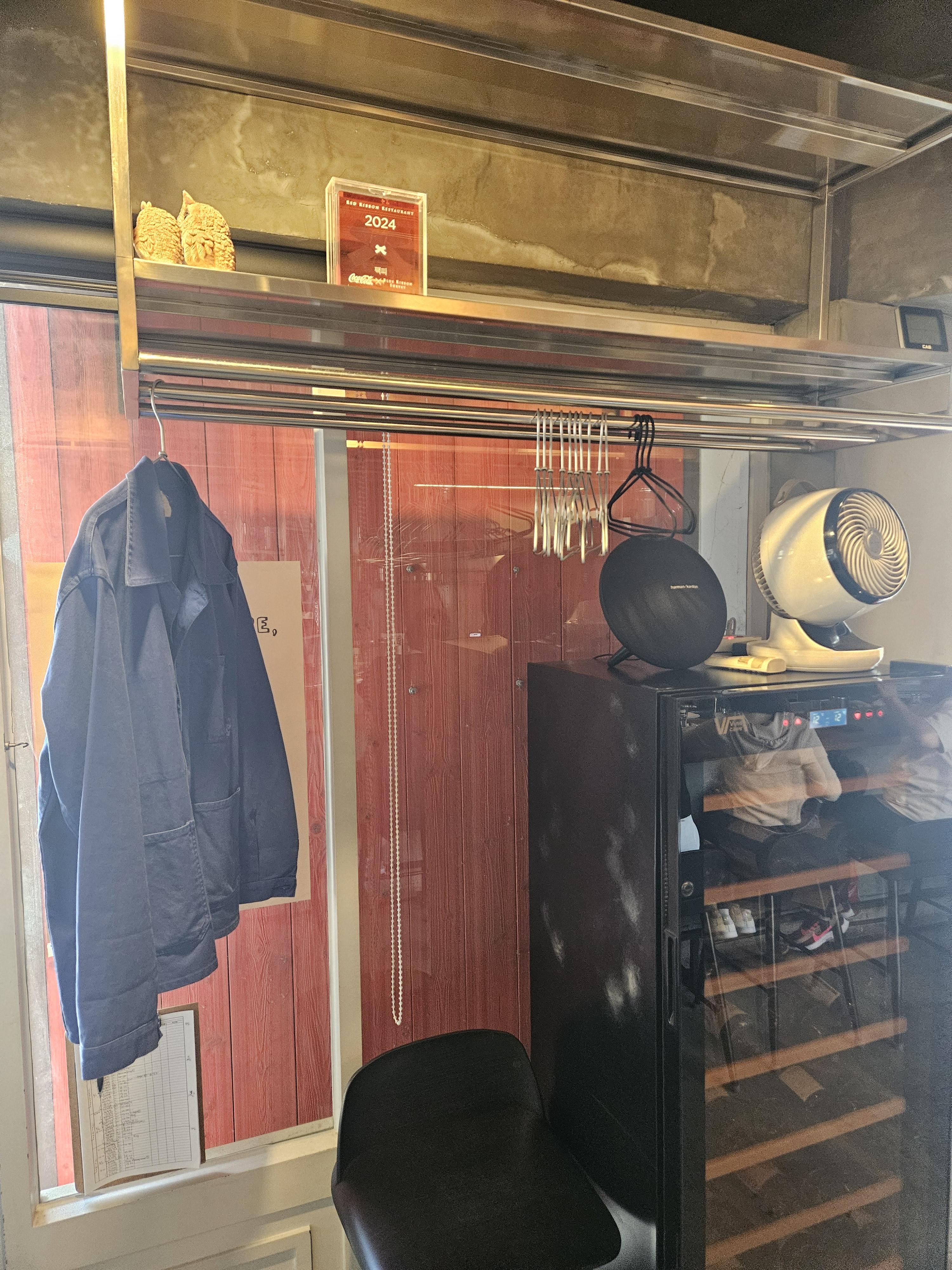 일자형 테이블이라 소지품 보관은 자리 앞 안쪽에 있는 고리에 하라고 안내해 줬고 출입구 쪽 와인셀러 옆에 외투 헹거가 설치되어 있었다.
