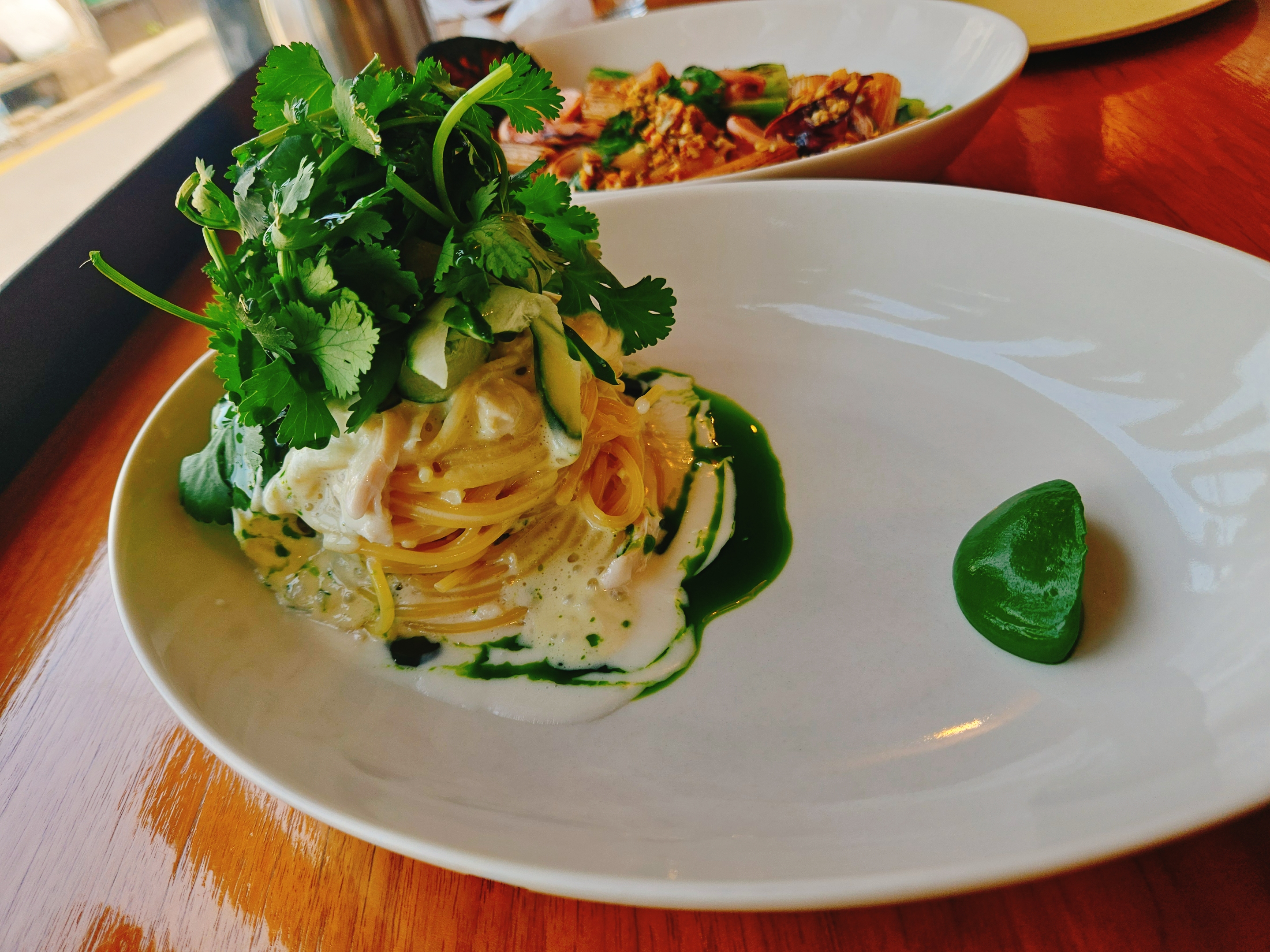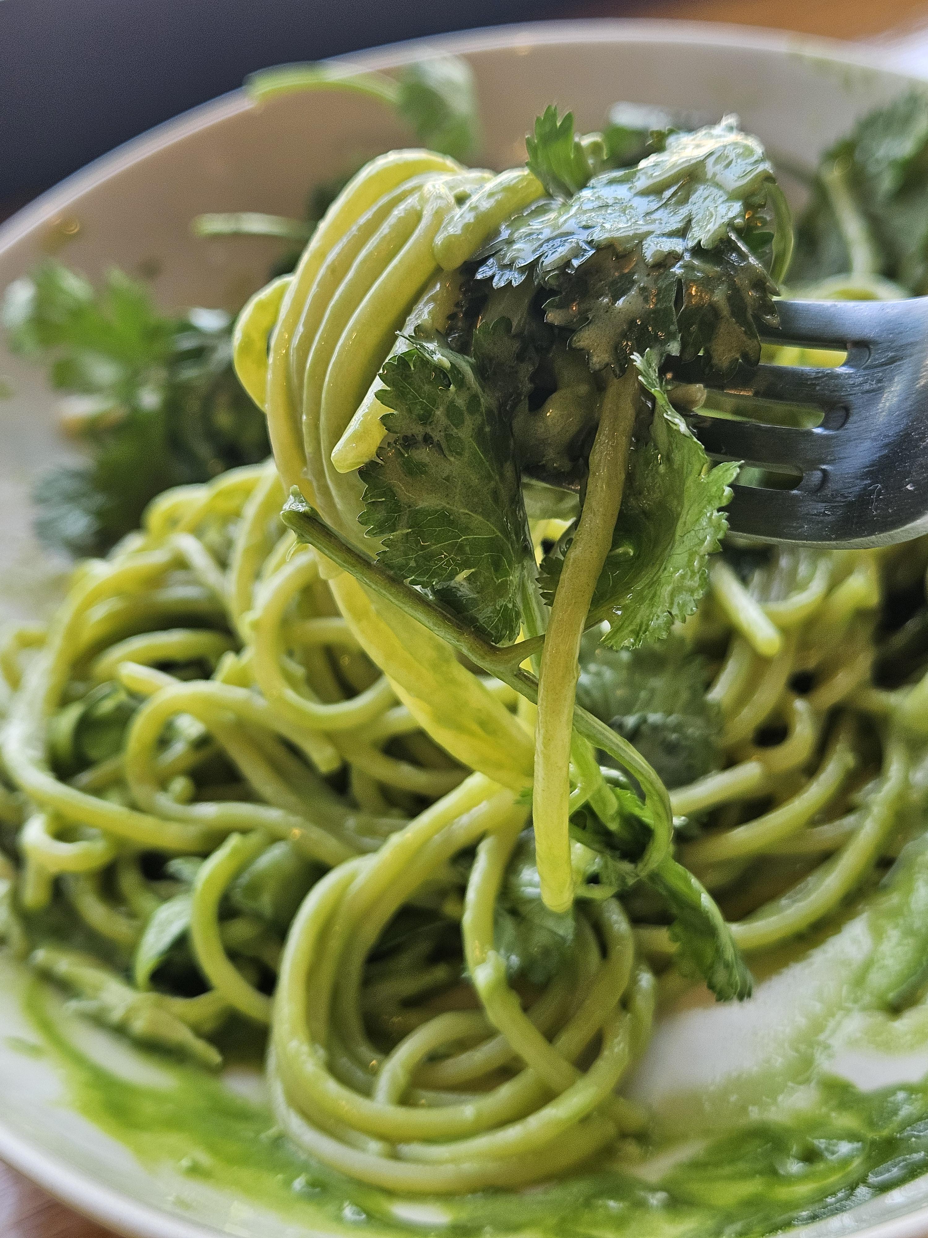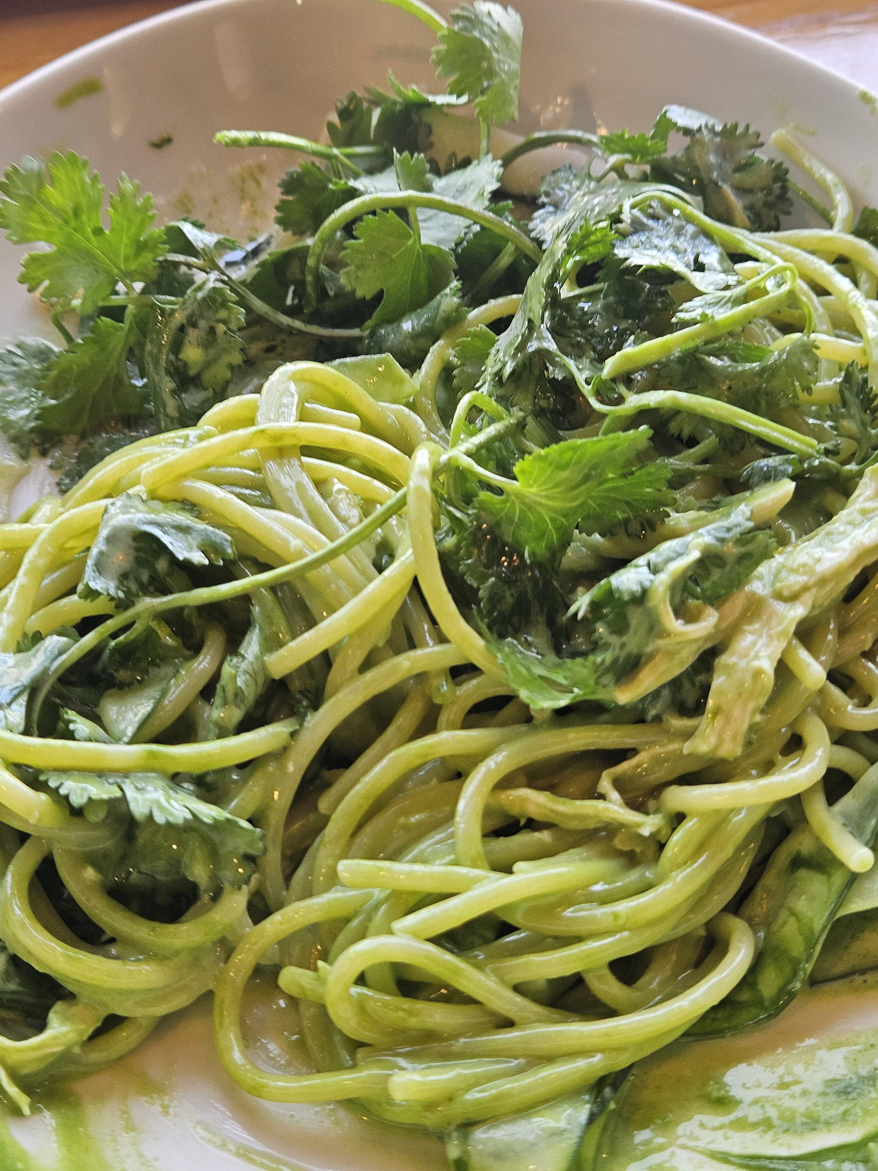 제일 기대됐었던 고수 스파게티는 초록색 좋아하는 💚 내가 애정할만함 비주얼. 코코넛 밀크 크림, 닭가슴살, 고수잎, 오이, 고수 퓌레, 고수 오일로 만든 그린 & 화이트 컬러가 돋보이는 신선한 비주얼의 파스타.