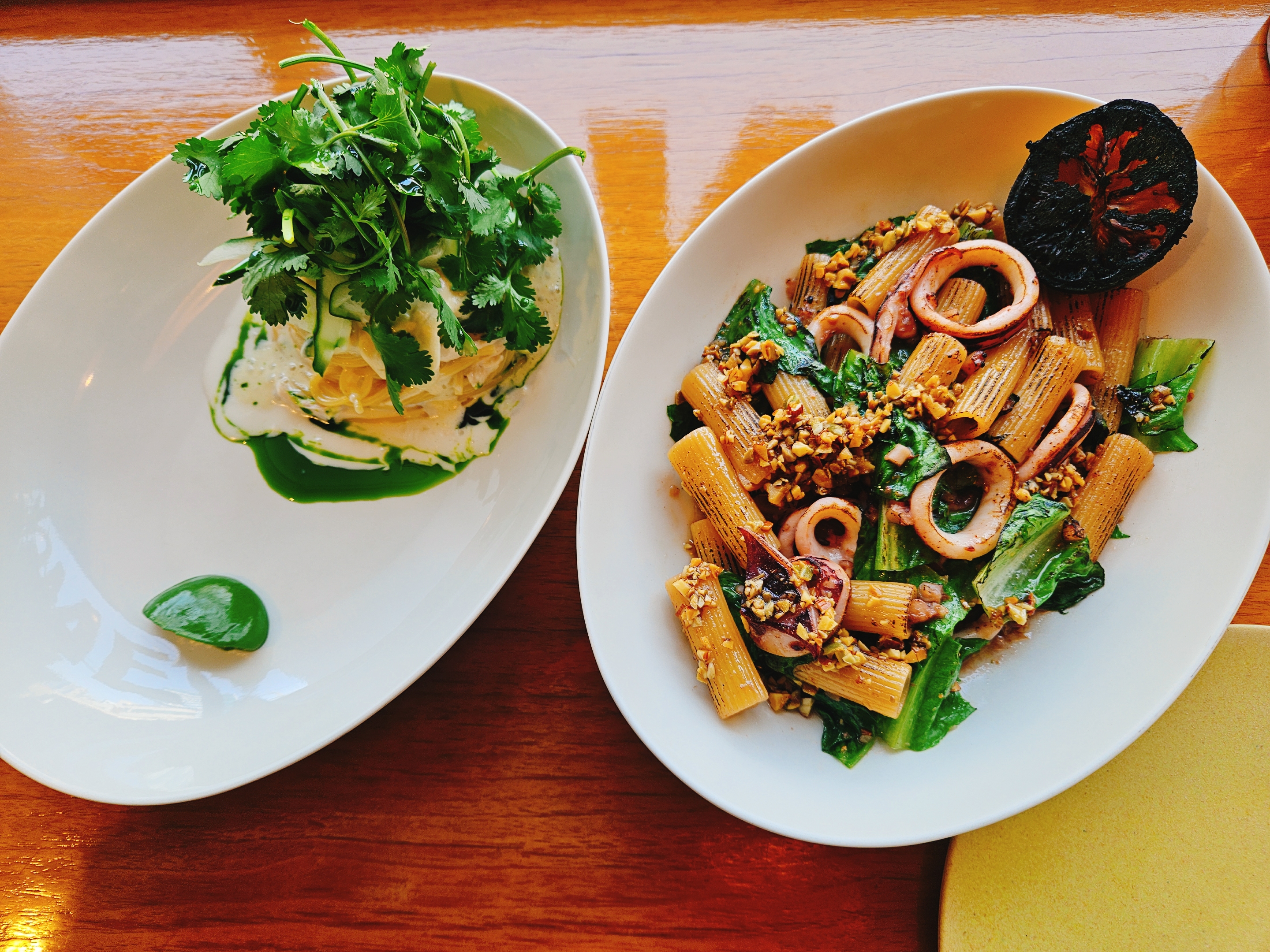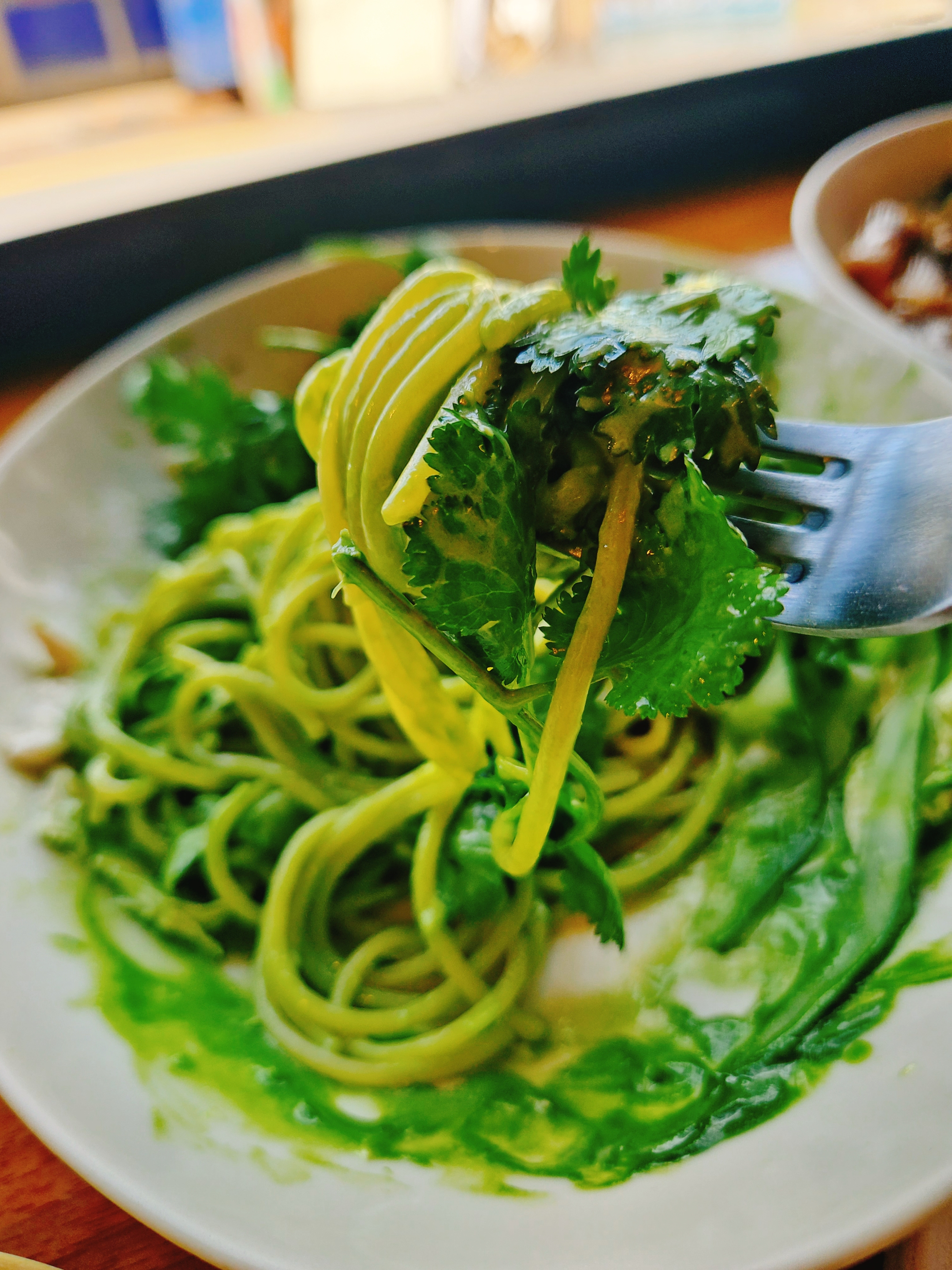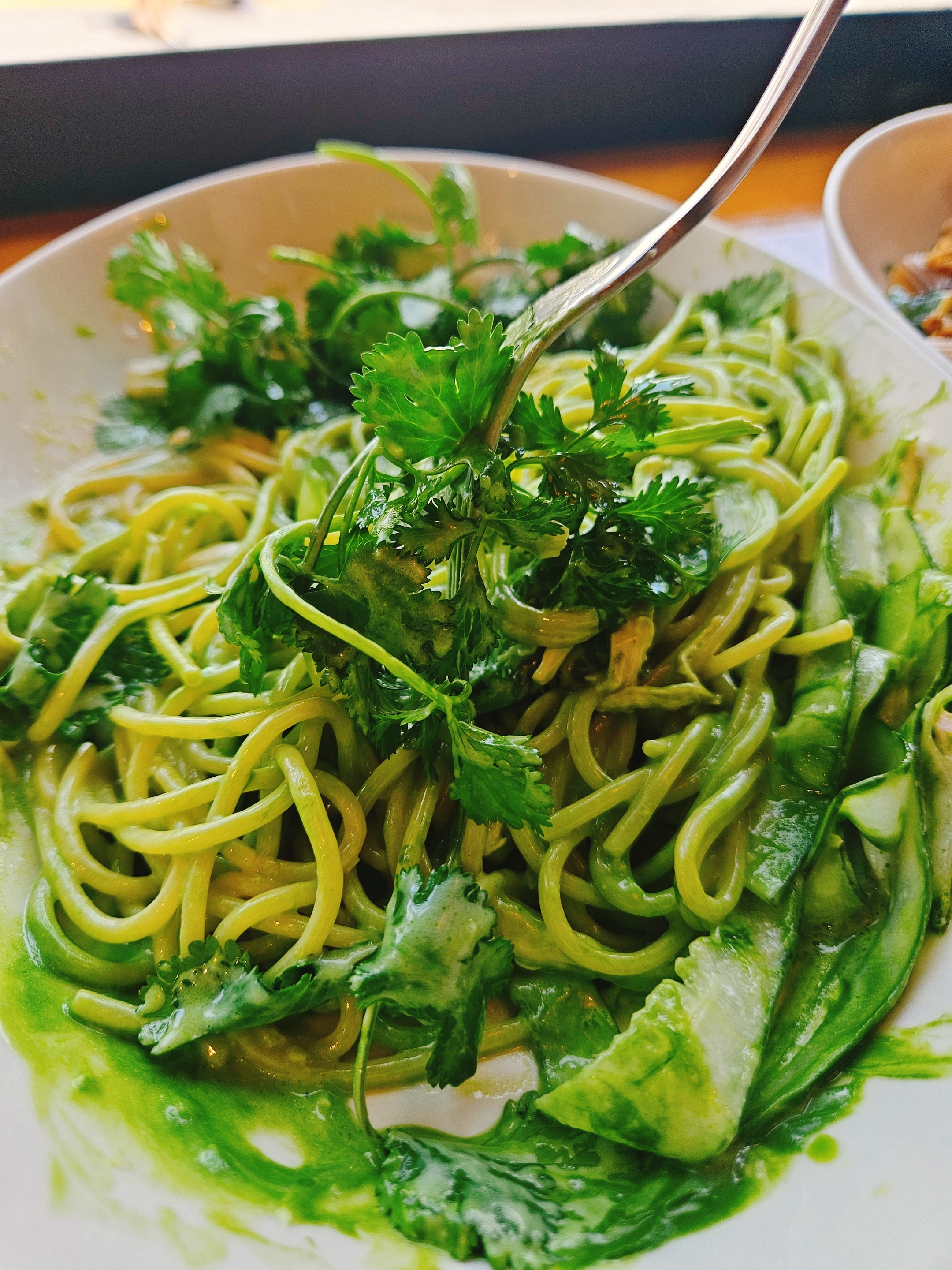 제일 기대됐었던 고수 스파게티는 초록색 좋아하는 💚 내가 애정할만함 비주얼. 코코넛 밀크 크림, 닭가슴살, 고수잎, 오이, 고수 퓌레, 고수 오일로 만든 그린 & 화이트 컬러가 돋보이는 신선한 비주얼의 파스타.