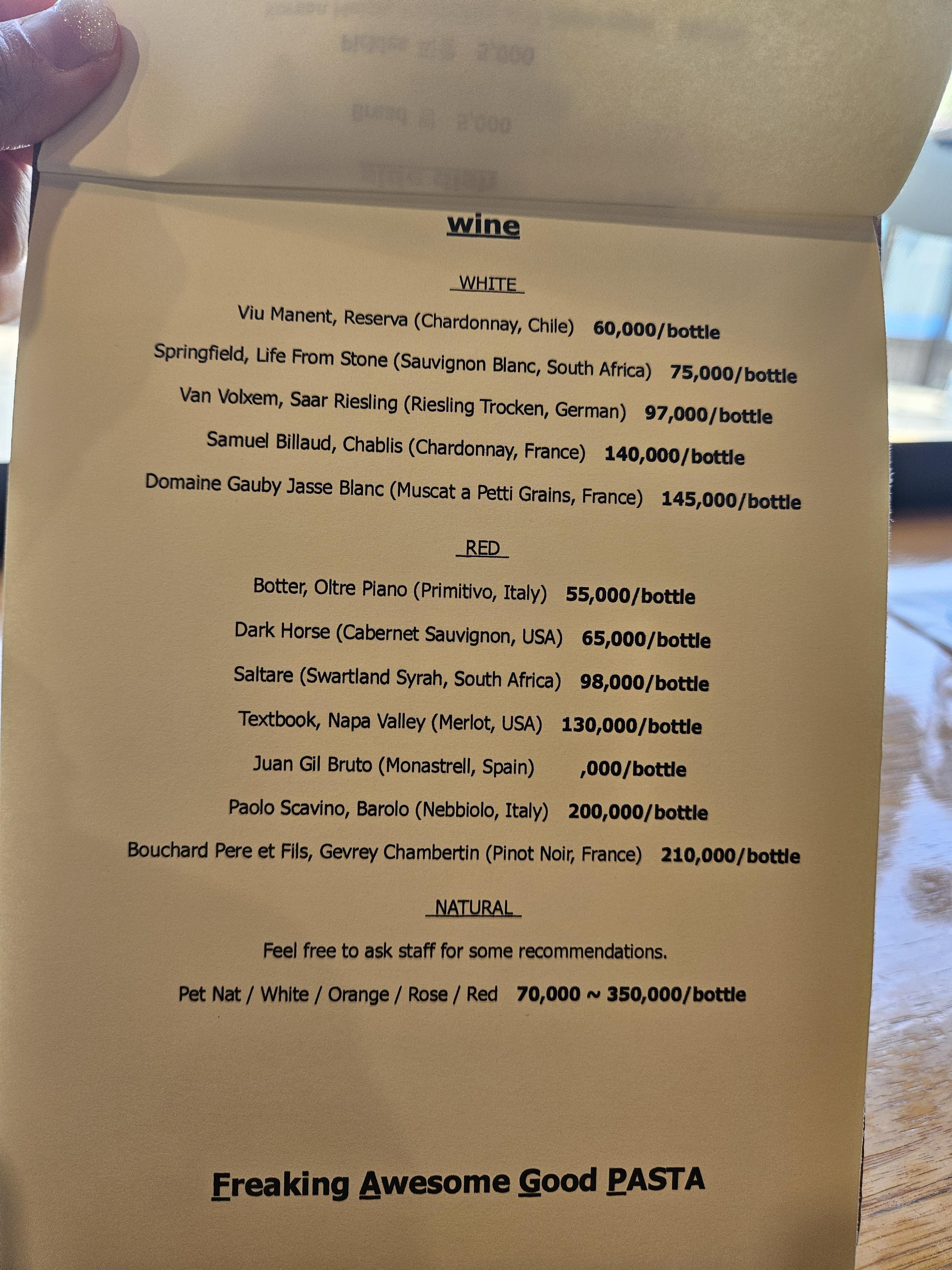 와인 셀러가 있어서 보틀 와인 판매하나 보다 싶었는데 화이트, 레드, 내추럴 모두 보틀 와인만 판매하고 있었다. 가격은 병당 55,0 ~ 350,0선.
