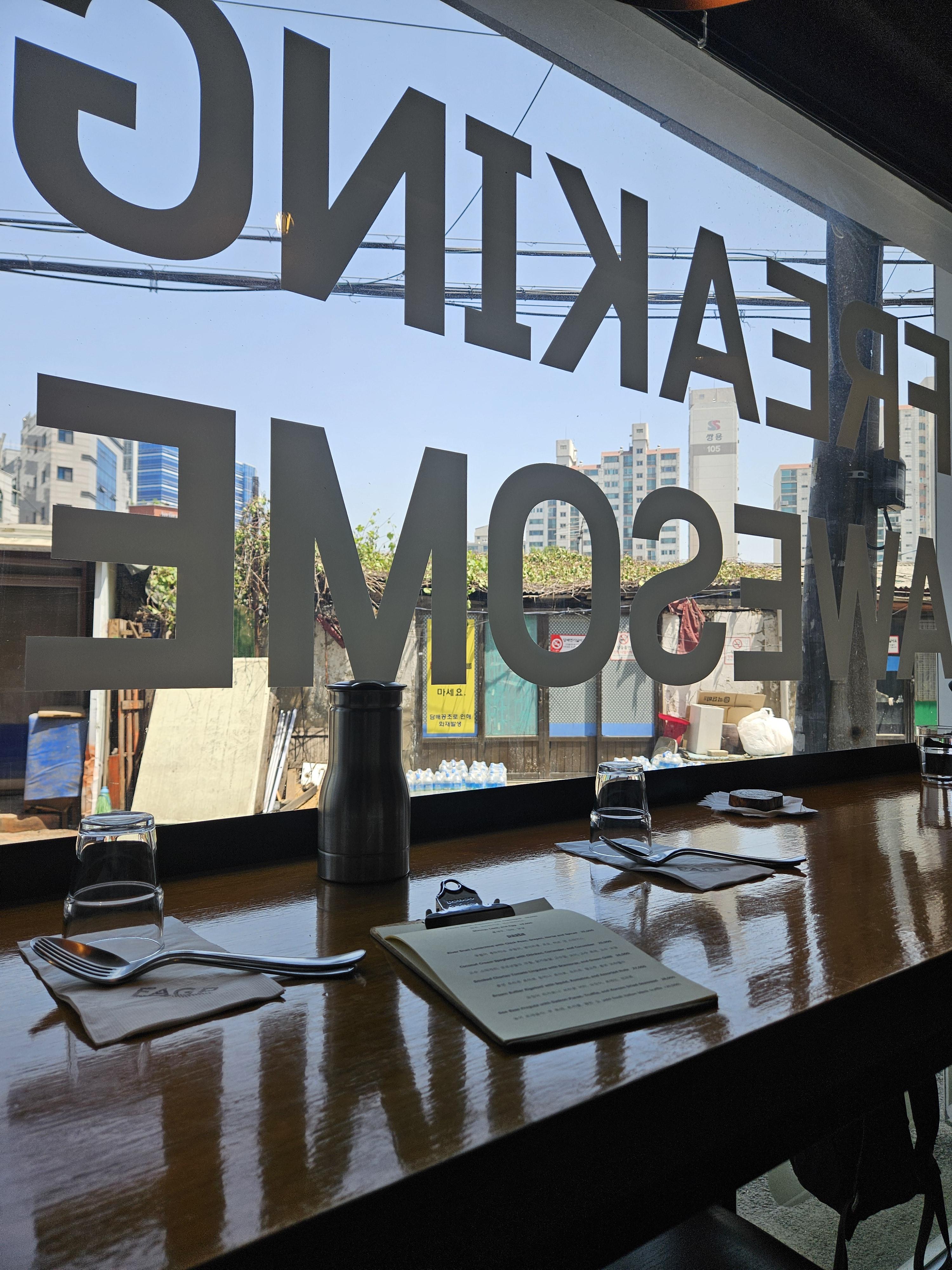 2인이 앉을 3자리가 남았는데 먼저 오는 순서대로 자유롭게 선택해서 앉을 수 있었고 주방 쪽과 창 측 자리 고민하다 창 측으로 자리했는데 옆에 앉은 분들은 외국인 관광객인 거 같더라.