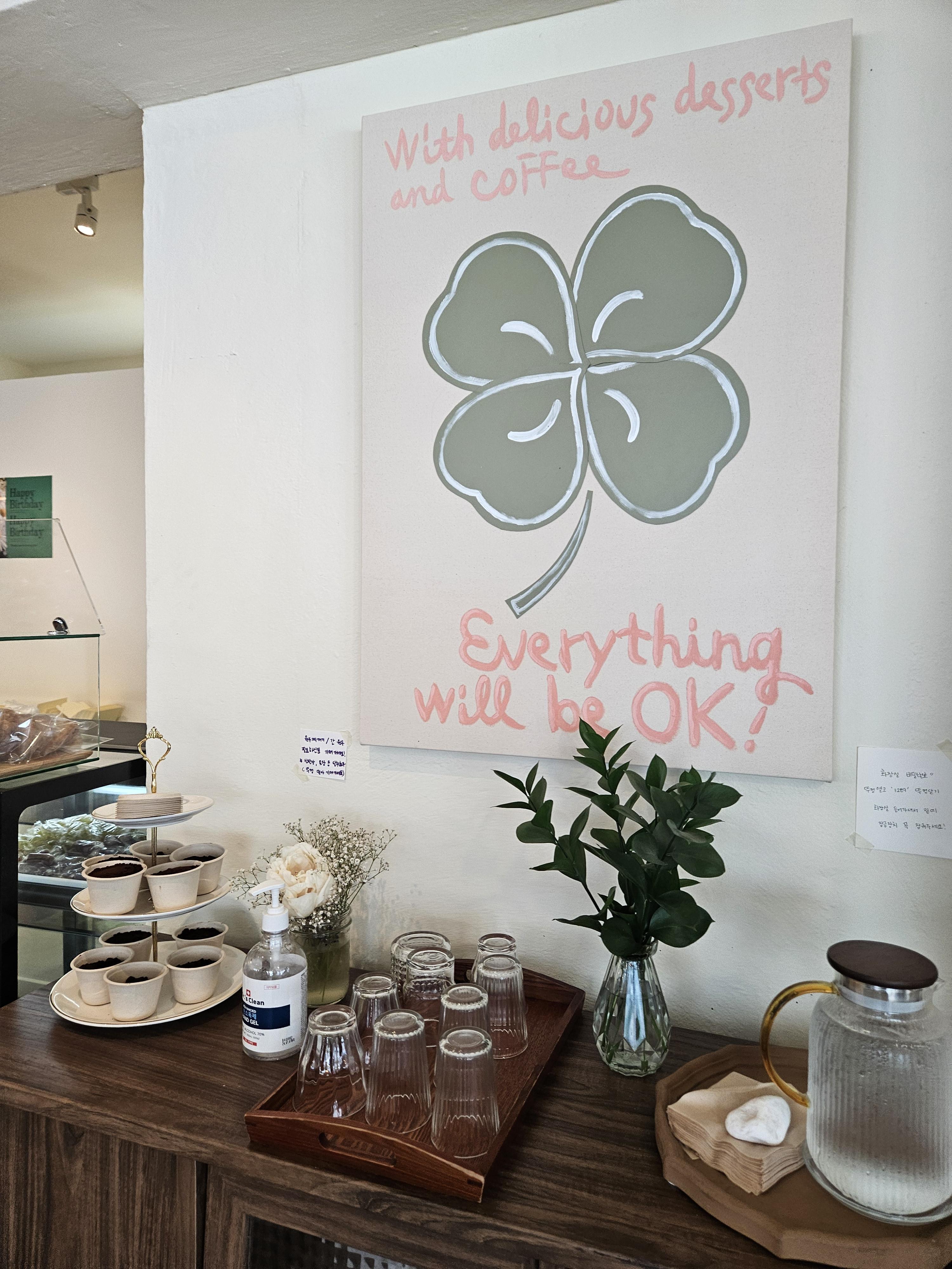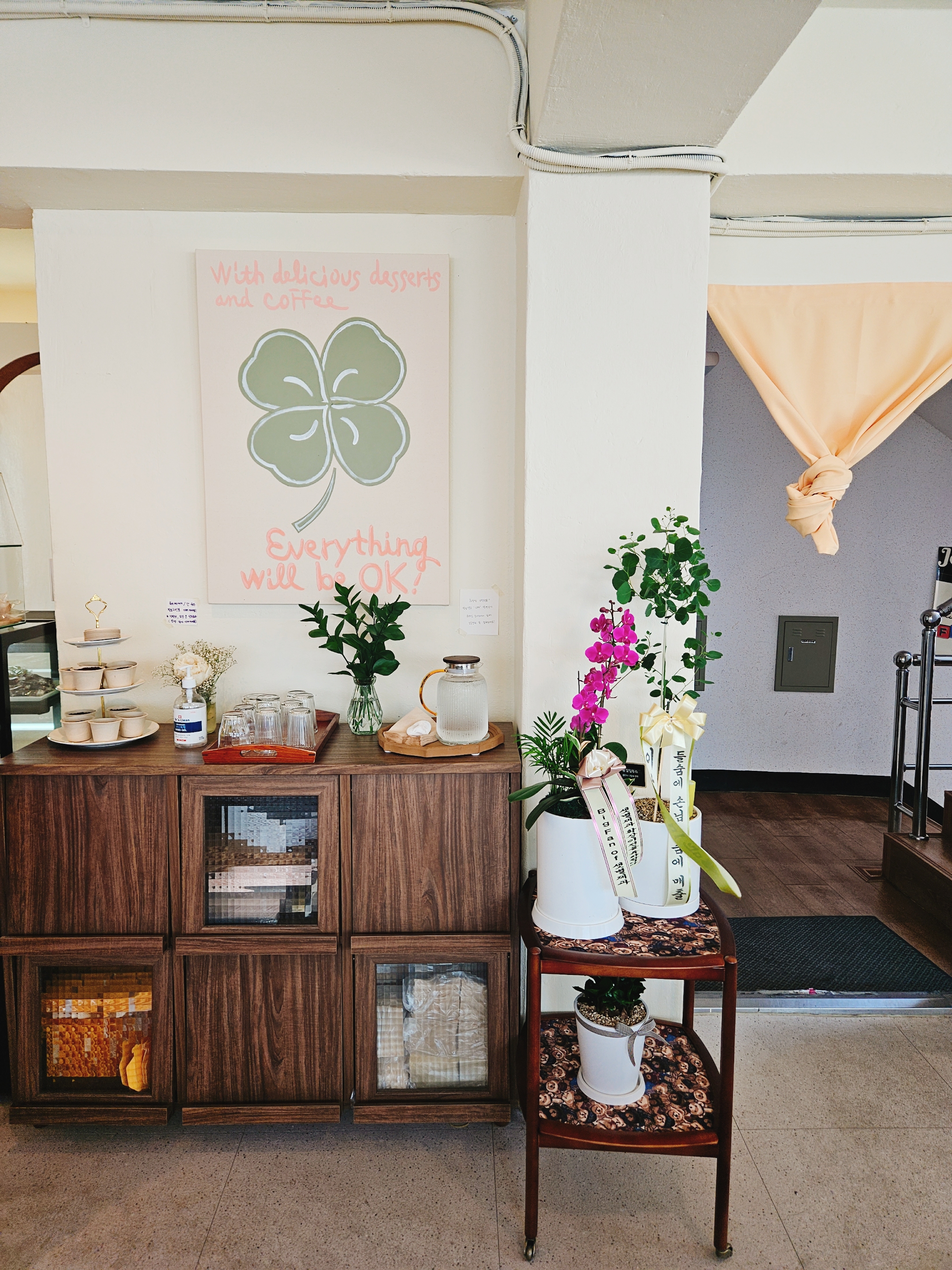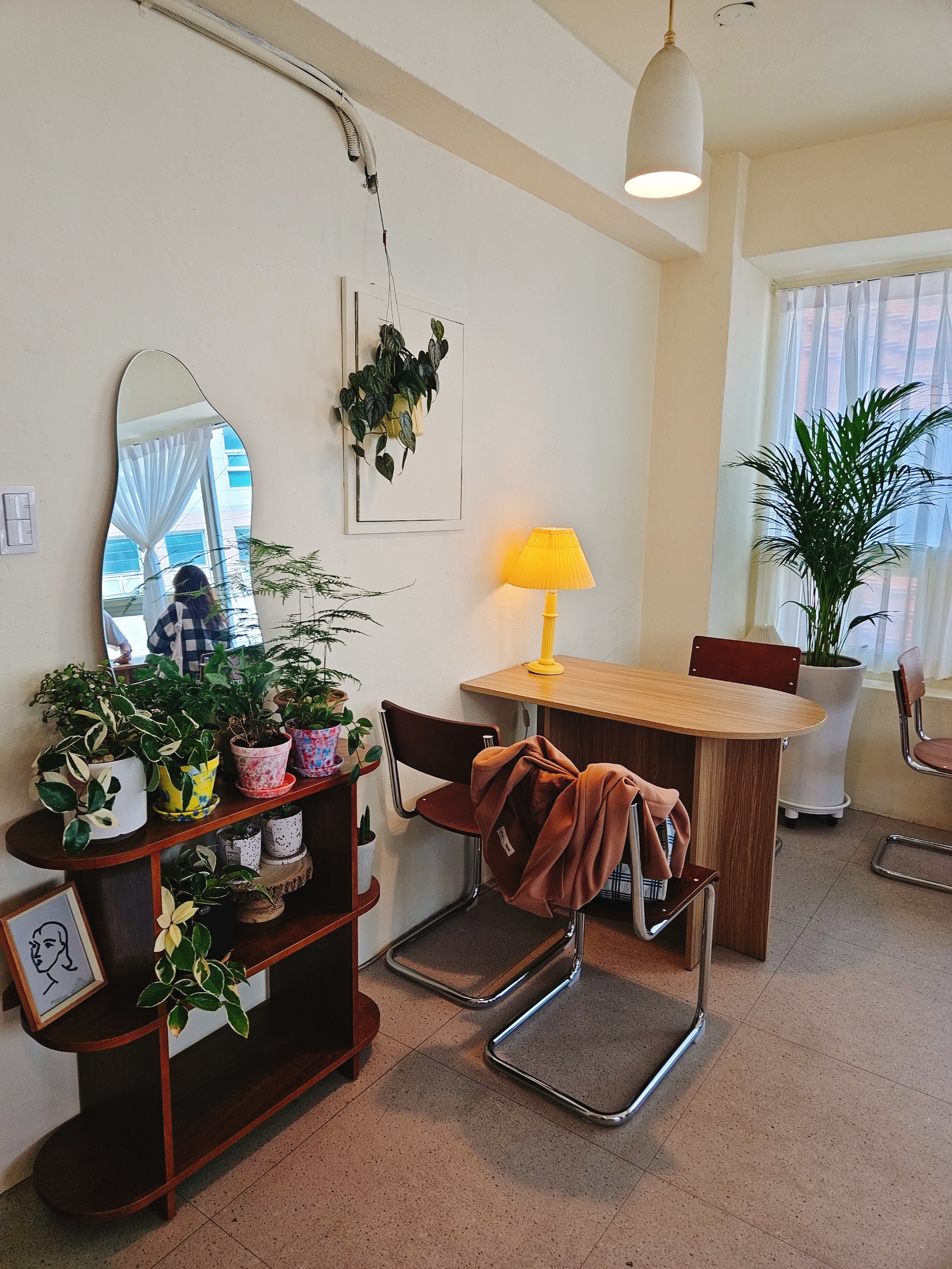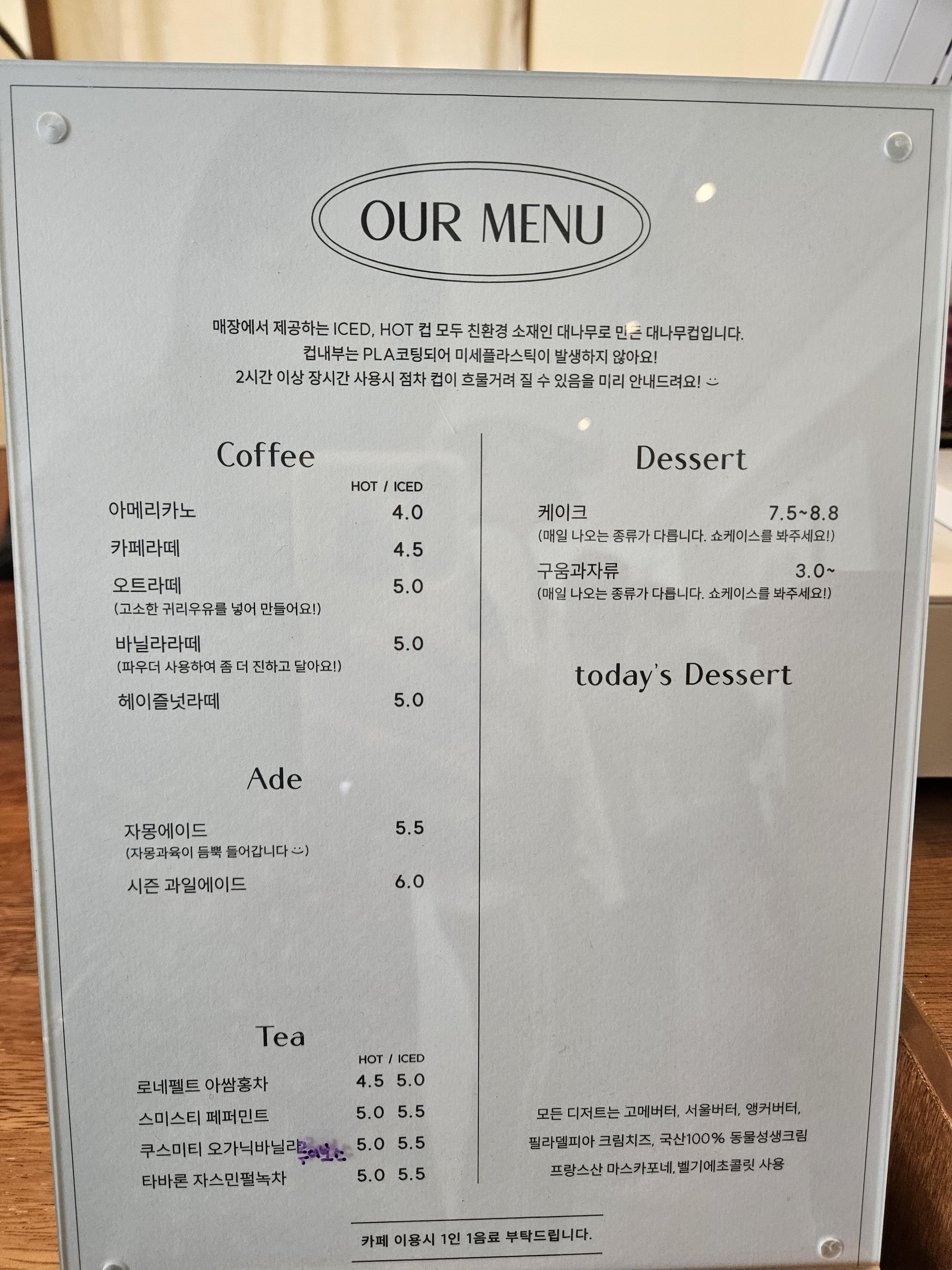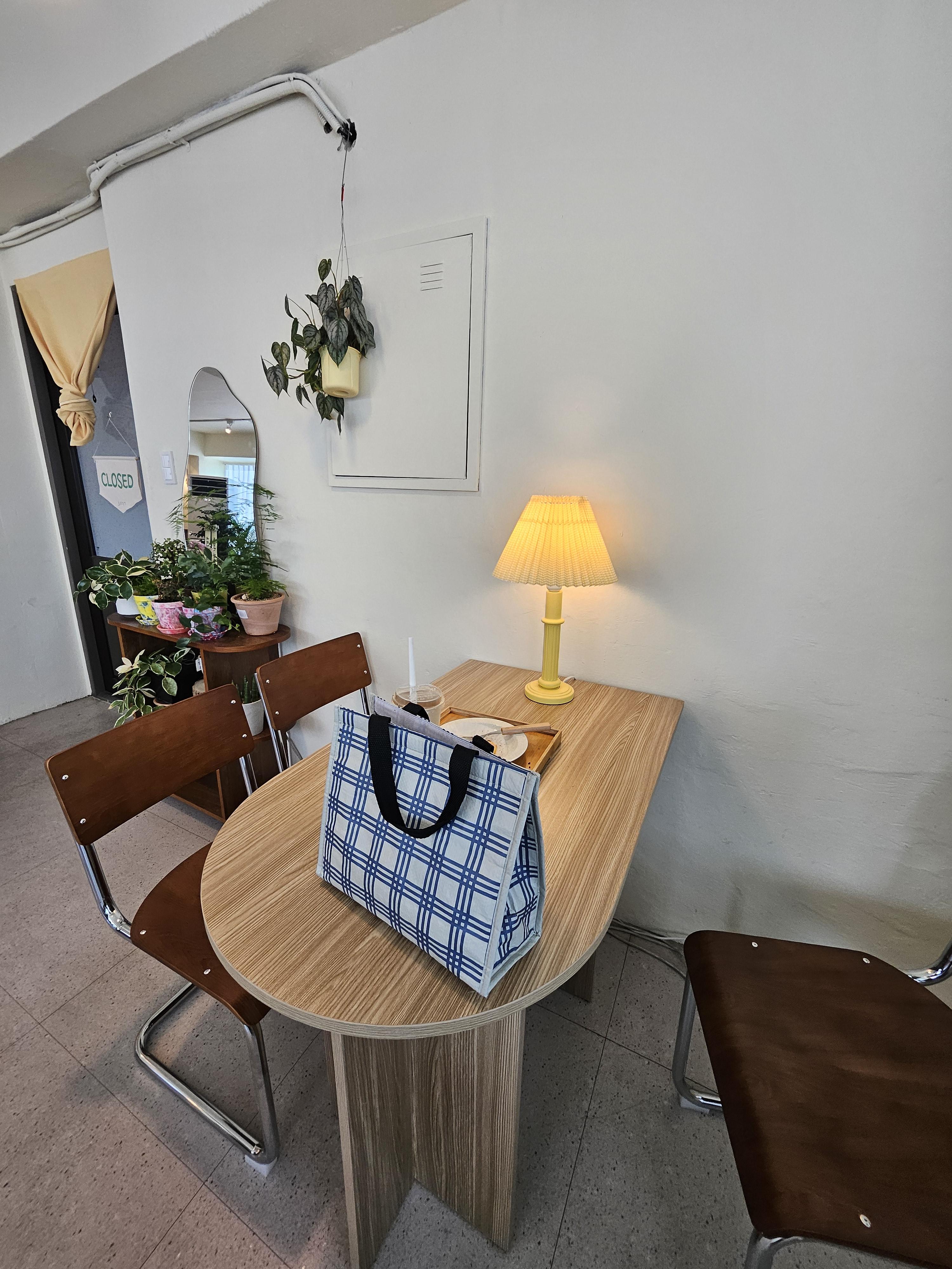 노란색 귀여운 스탠드가 놓인 거울 옆 테이블에 자리 맡아두고 오늘 판매하는 케이크랑 디저트 확인하는데 먹고 싶은 케이크가 없었지만
