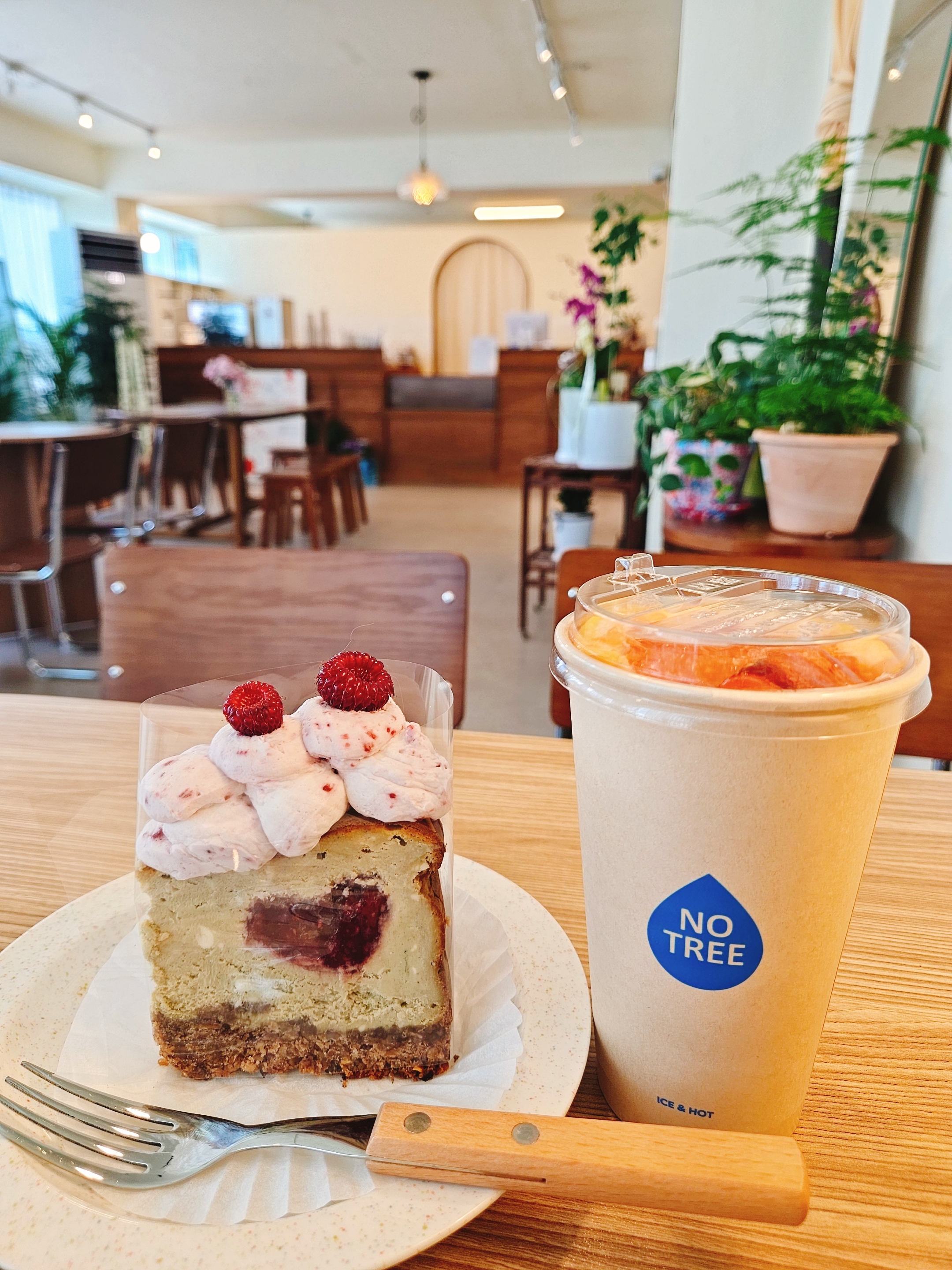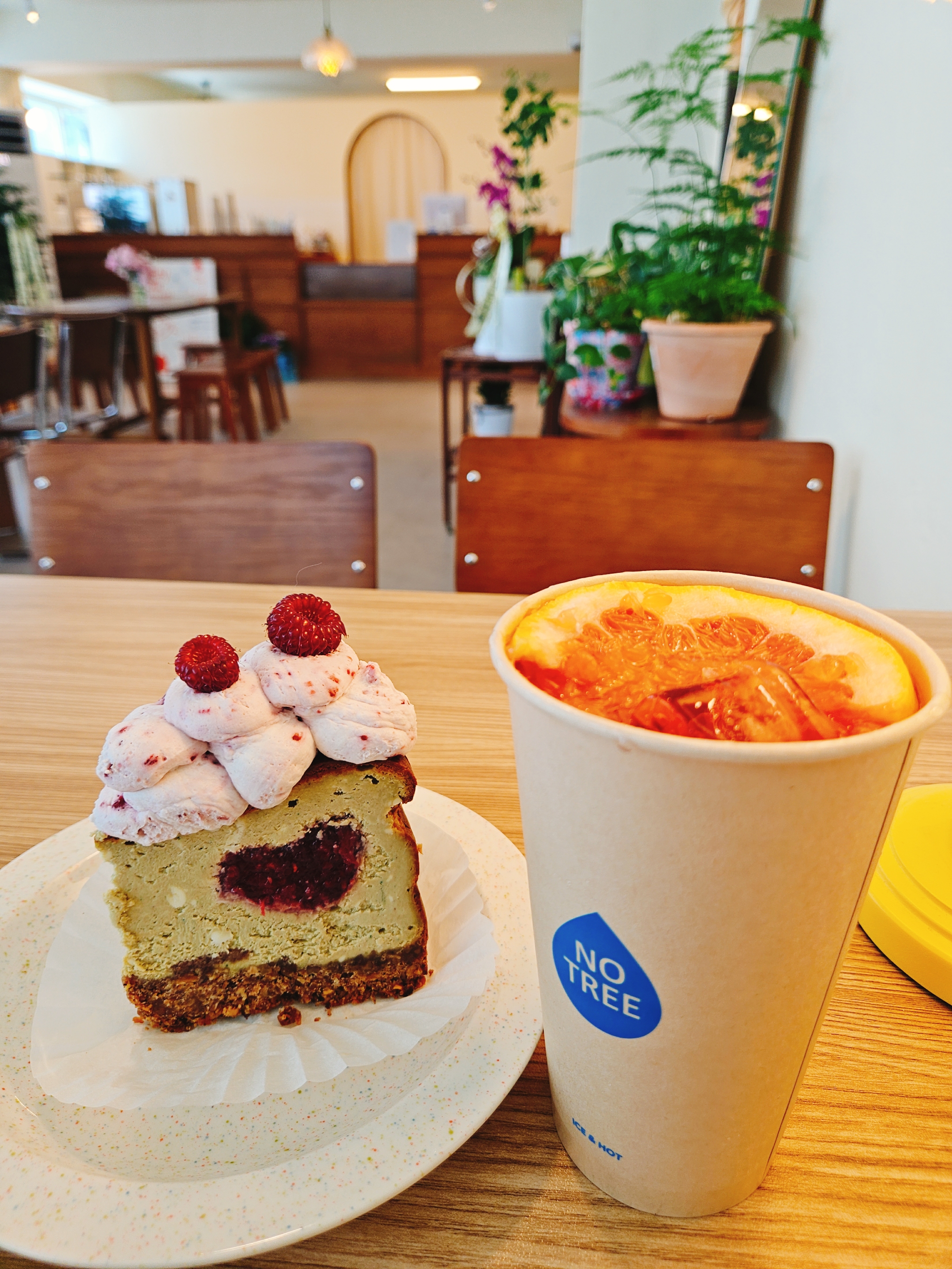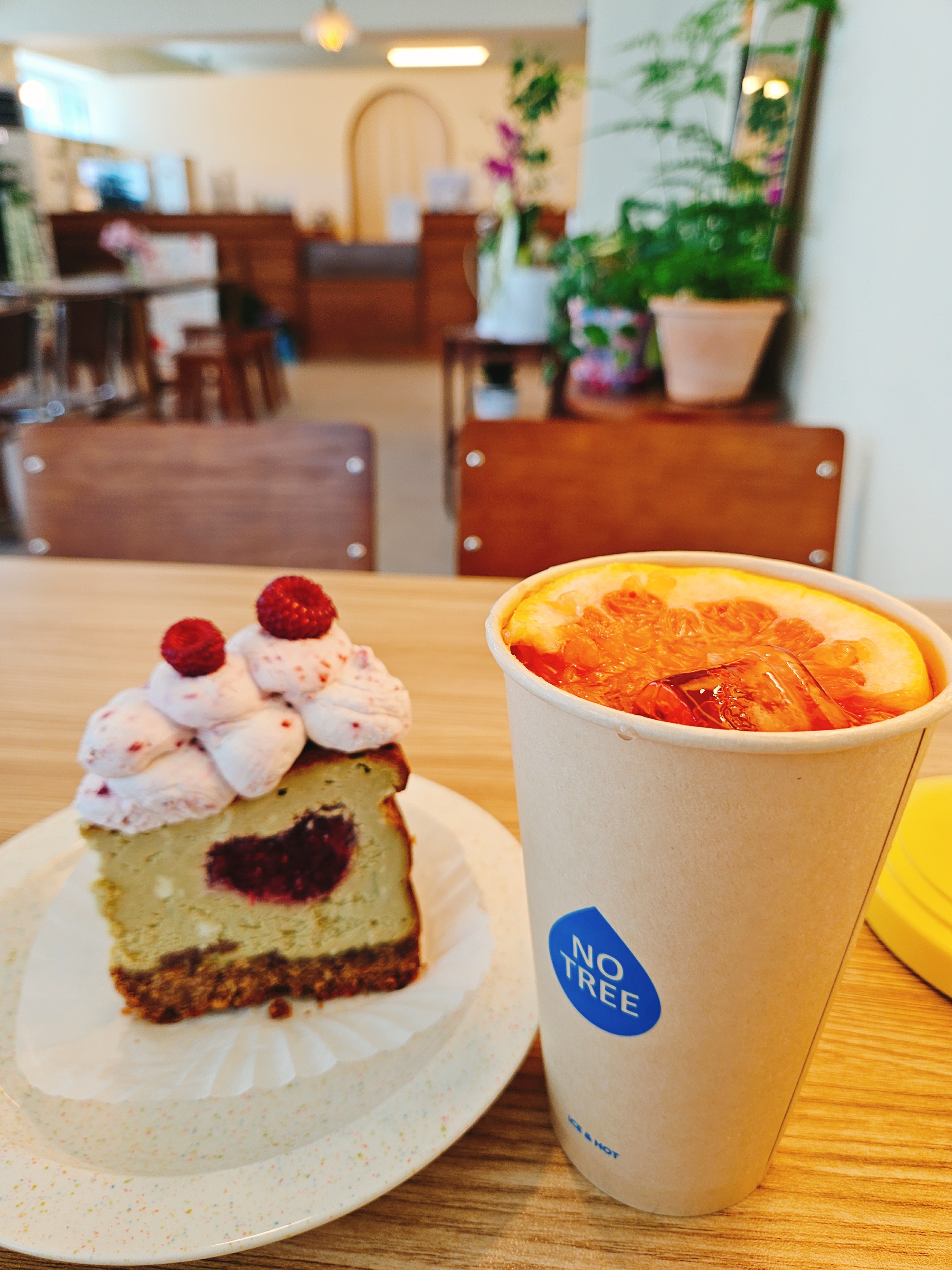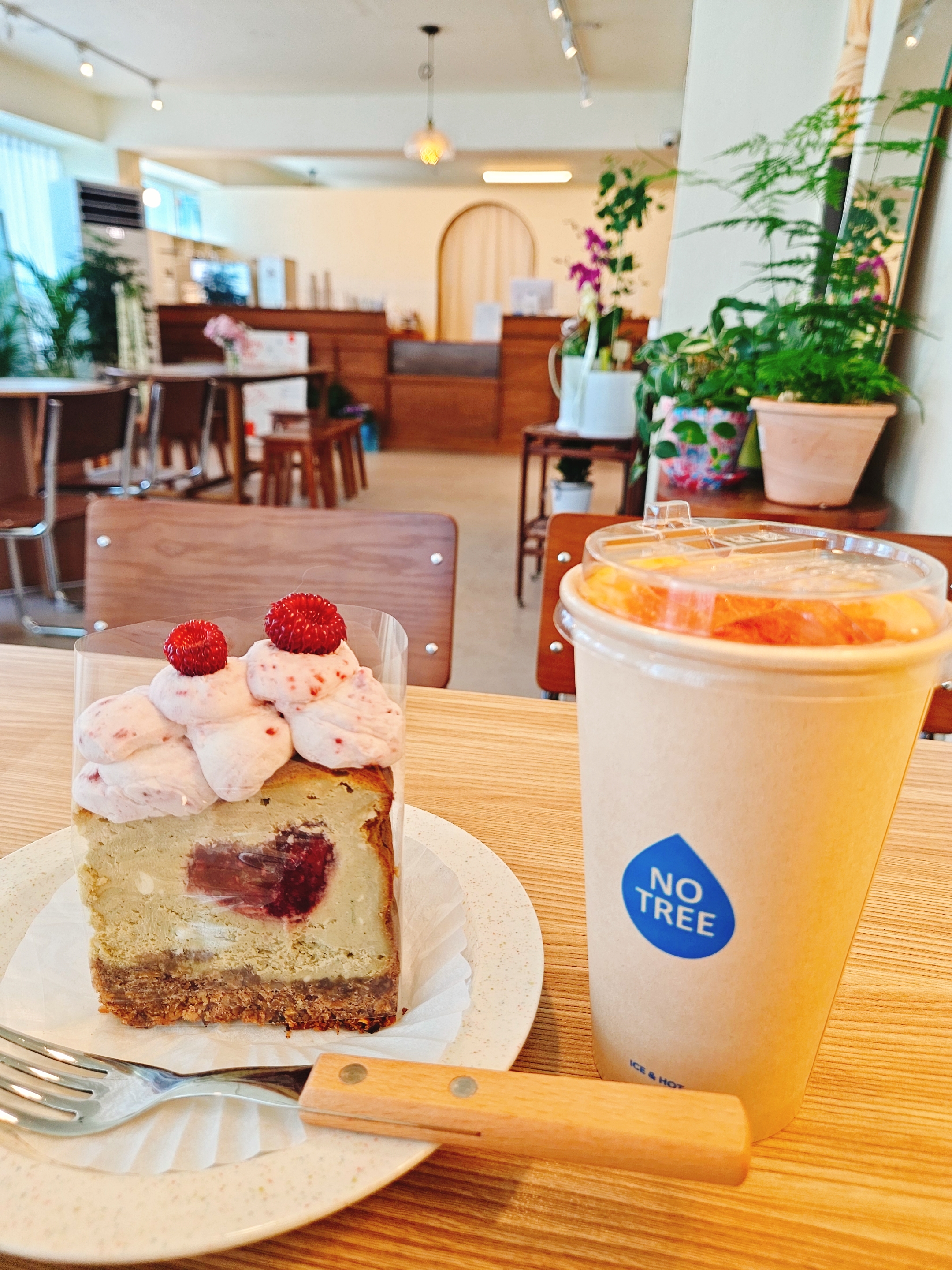 피스타치오 베리치즈(8,5)와 자몽에이드(5,5)는 매장에서 먹고 가고 밤밤치즈케이크(8,5)는 포장해 간다고 포장요청해놨다.