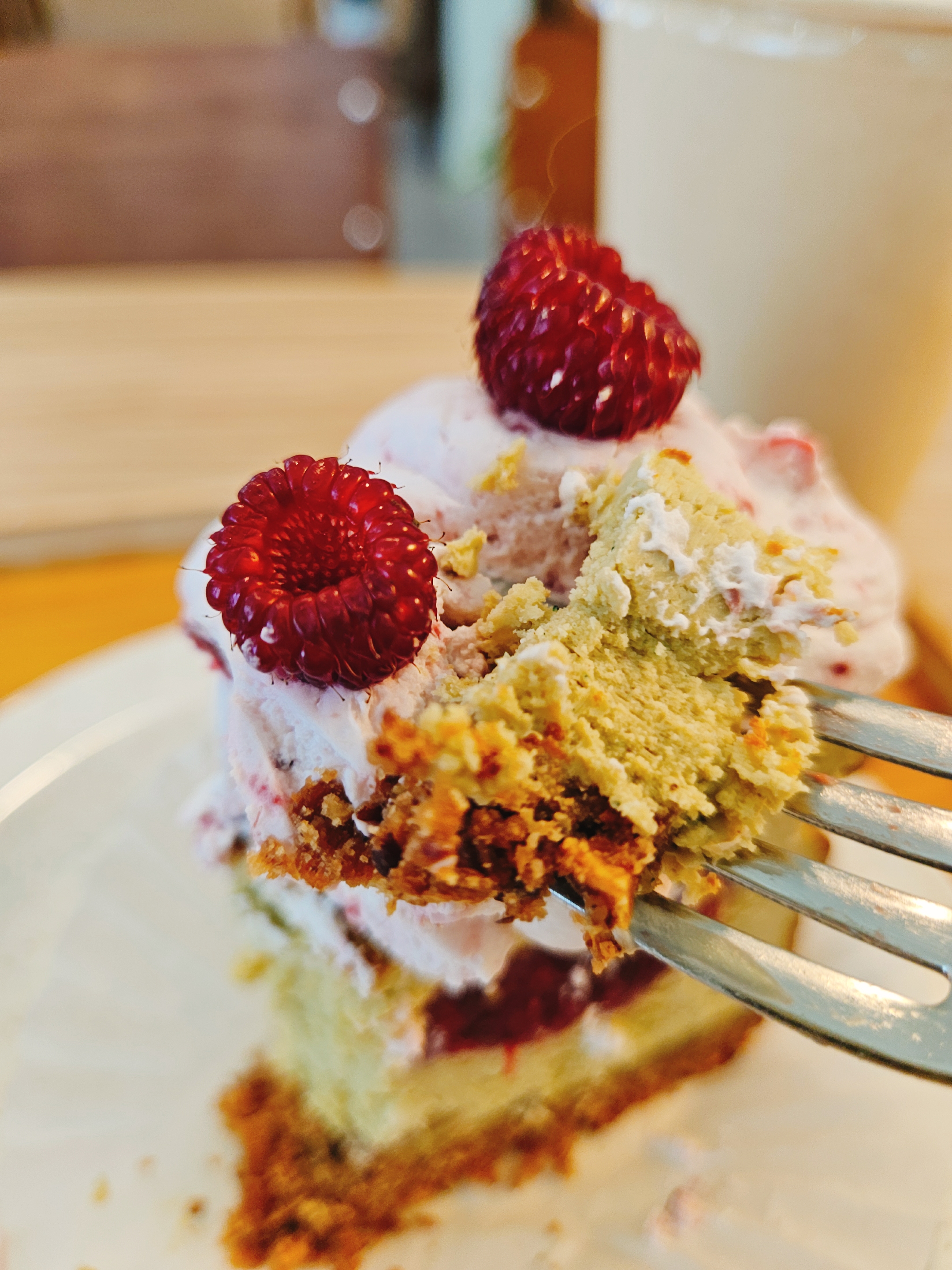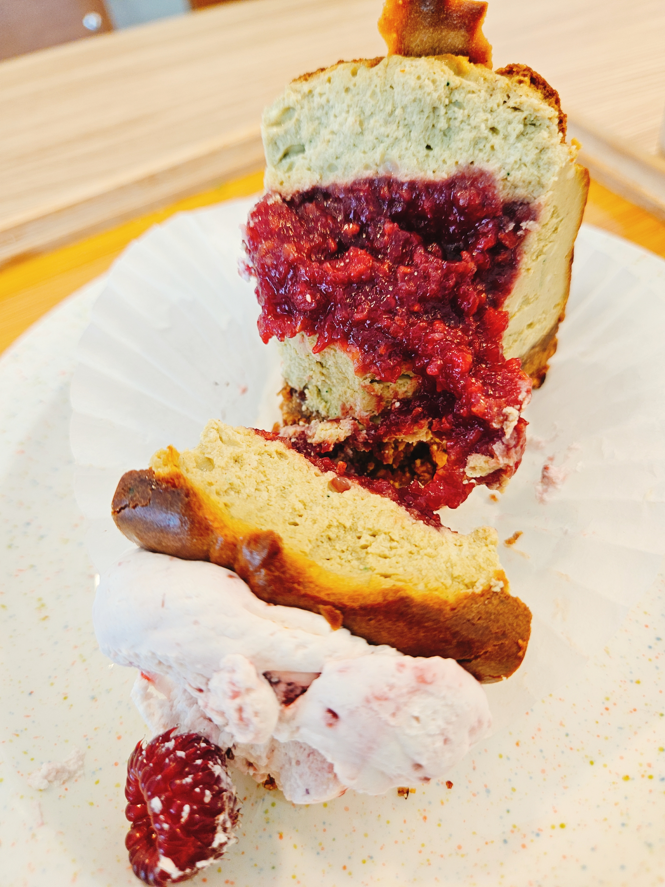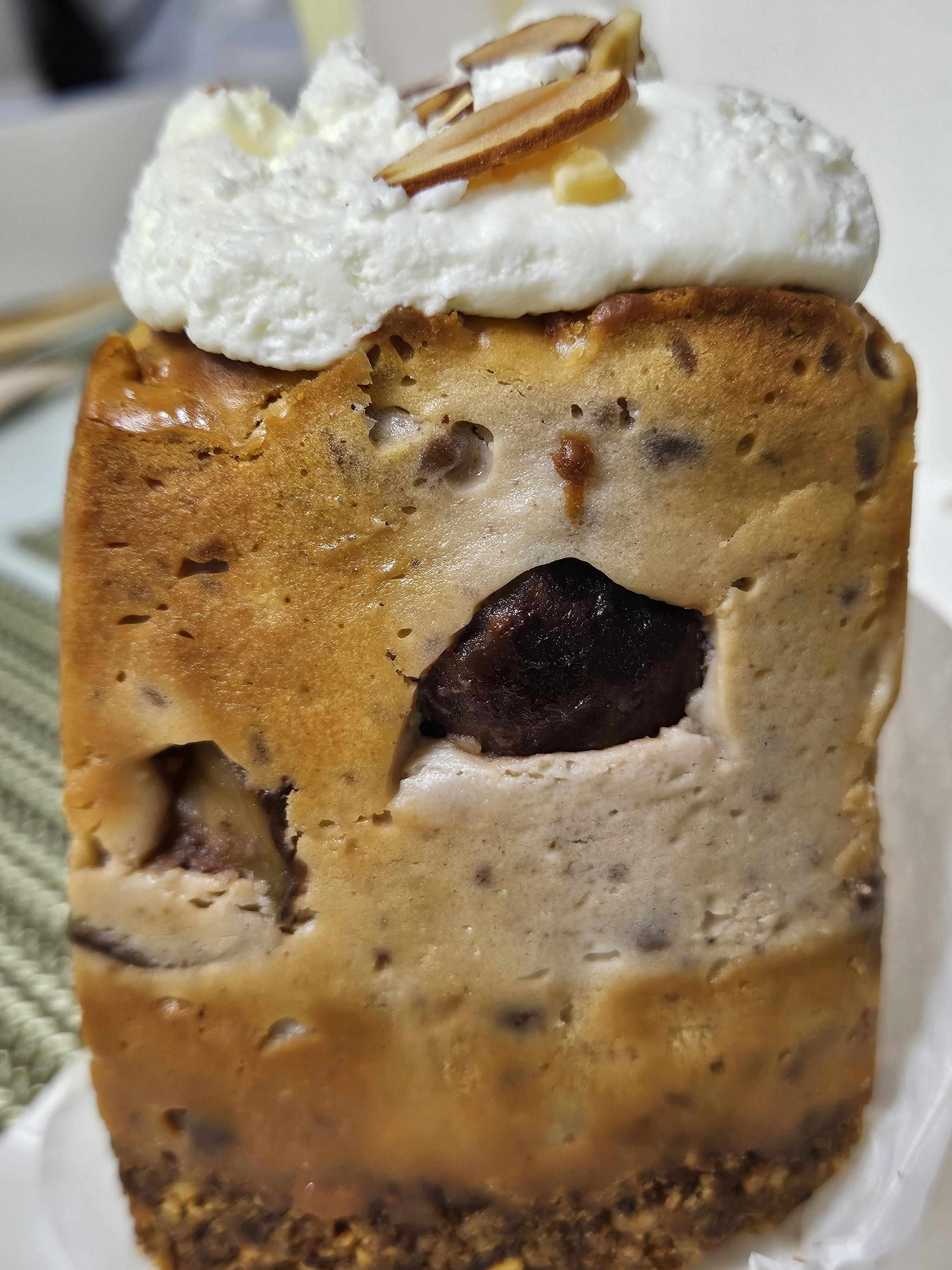 꾸덕하면서 부드러운 치즈케이크는 글루텐 프리 느낌이다. 밀가루 대신 그래놀라를 뭉쳐 굳힌걸 시트로 써서 더 건강하고 바삭 끈끈한 식감이 매력적.