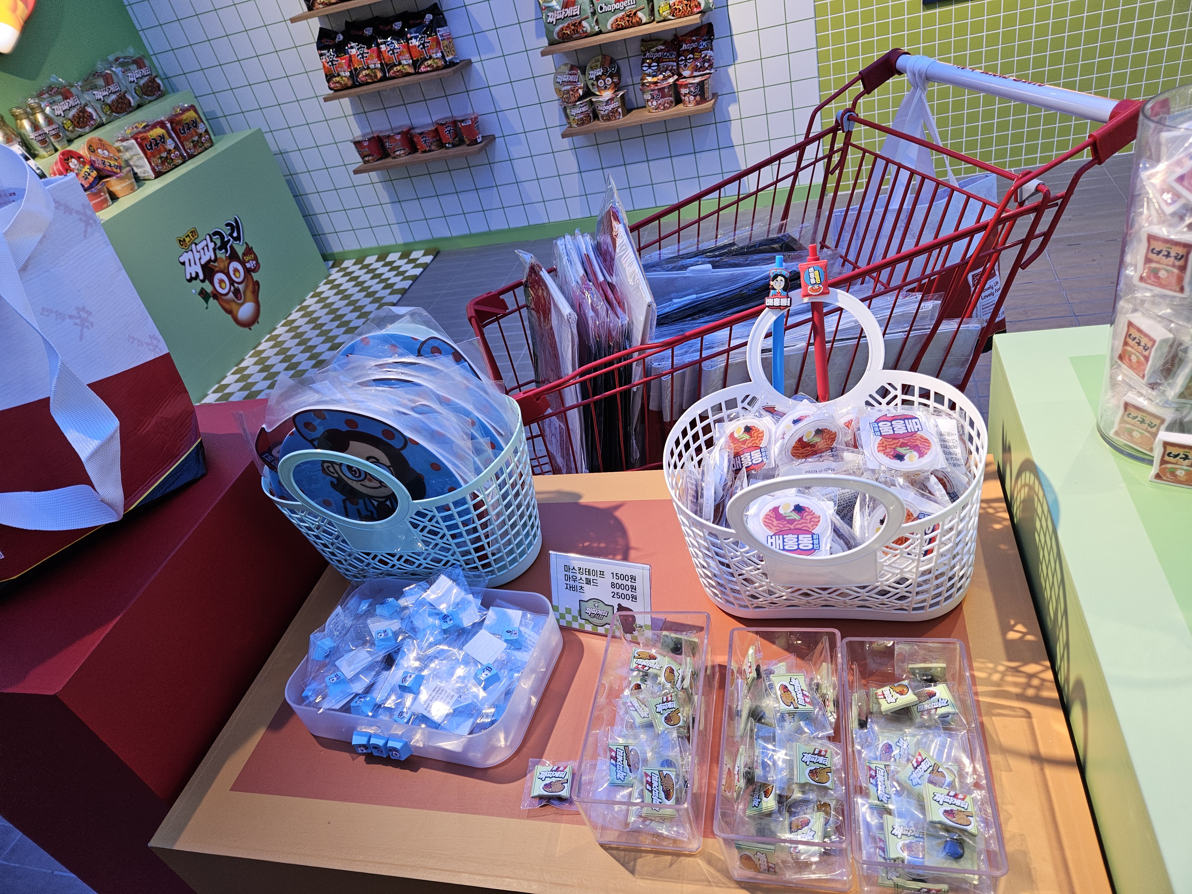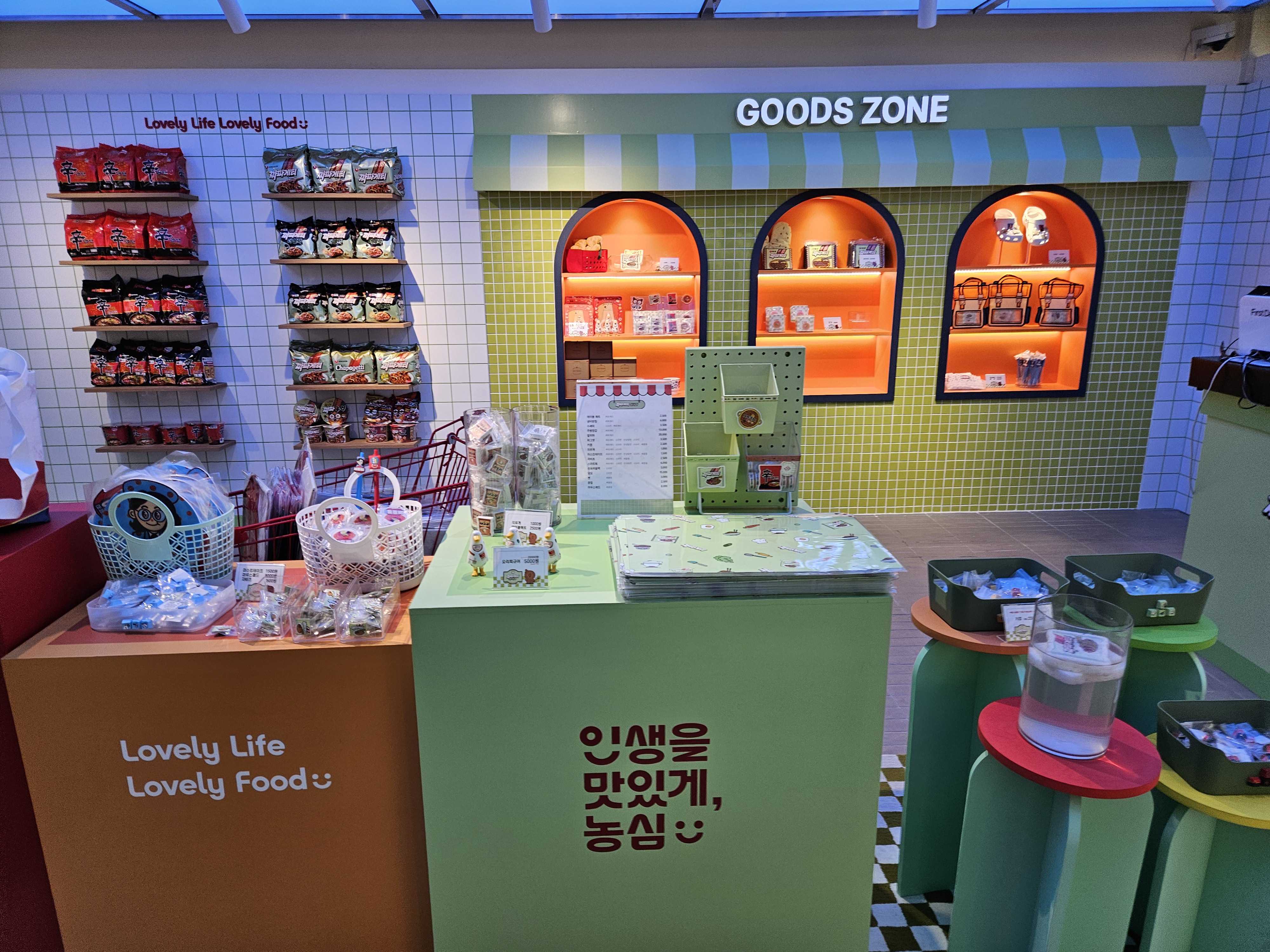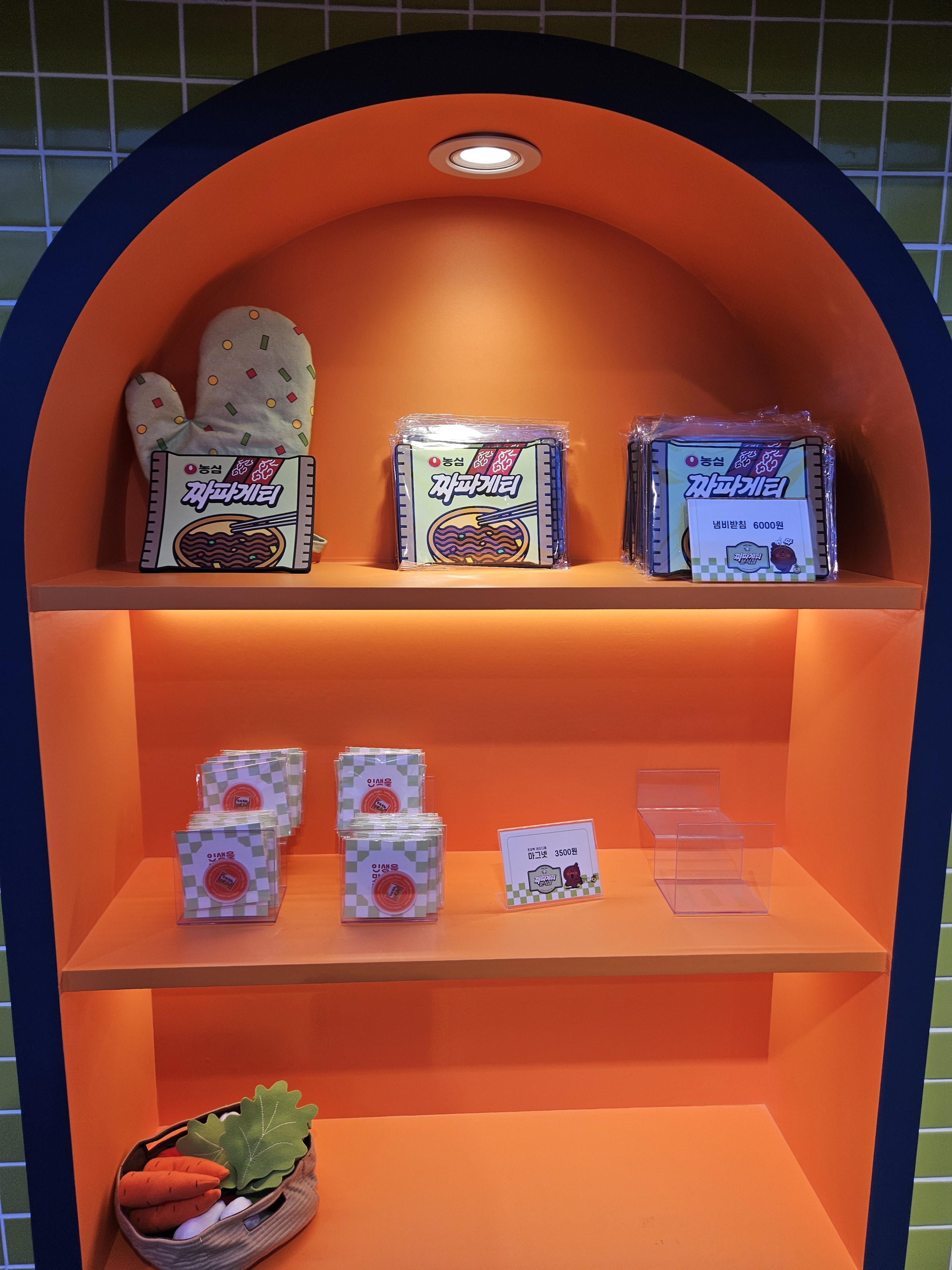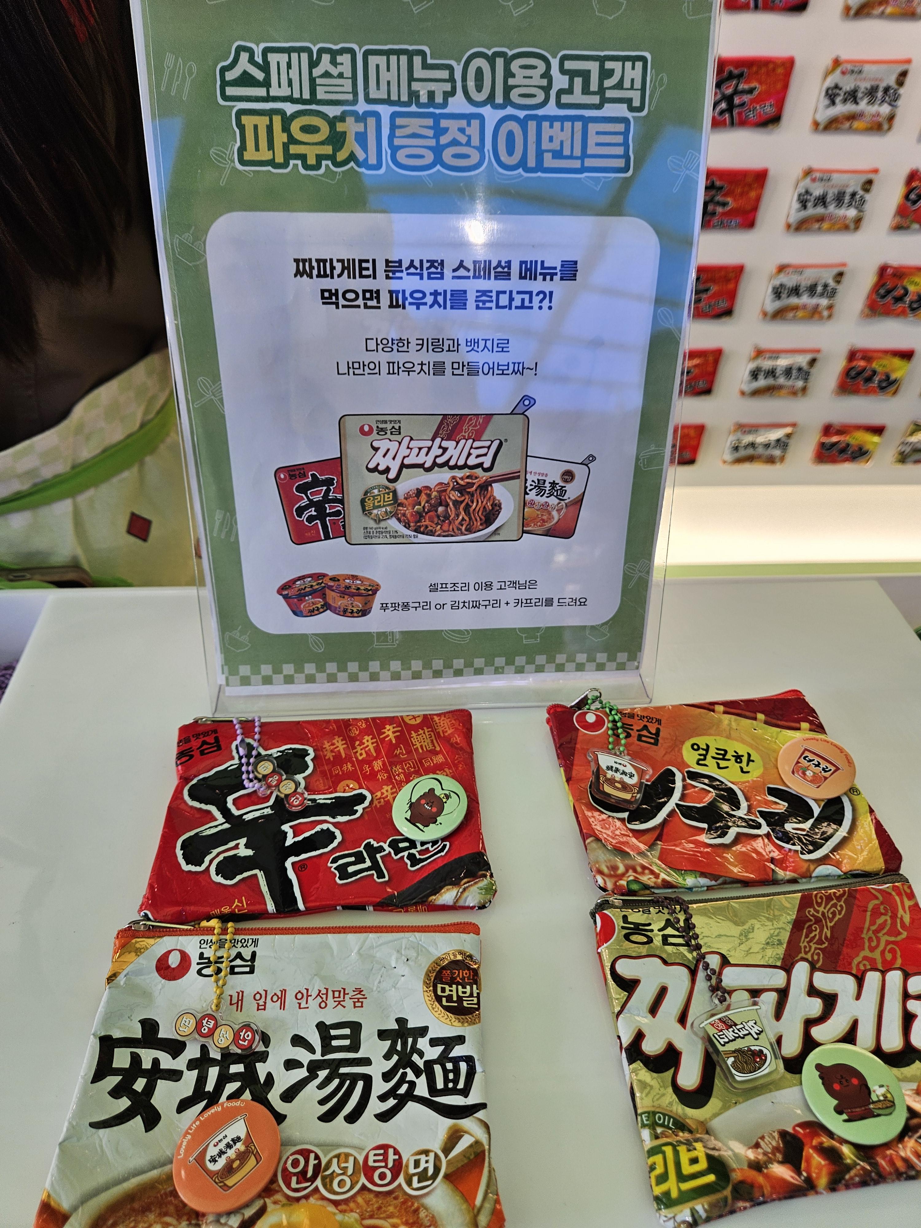 모든 미션 완료 후 1층 오른쪽으로 내려가면 굿즈샵인데 여기서 쿡존에서 주문시 뽑힌 메뉴교환권을 제시하면 미니 파우치를 제공한다. 고리, 뱃지, 키링 하나씩 파우치에 어울리는 거 골아서 가져간다고 하면되는데 난 짜파게티 모양으로 받았네.