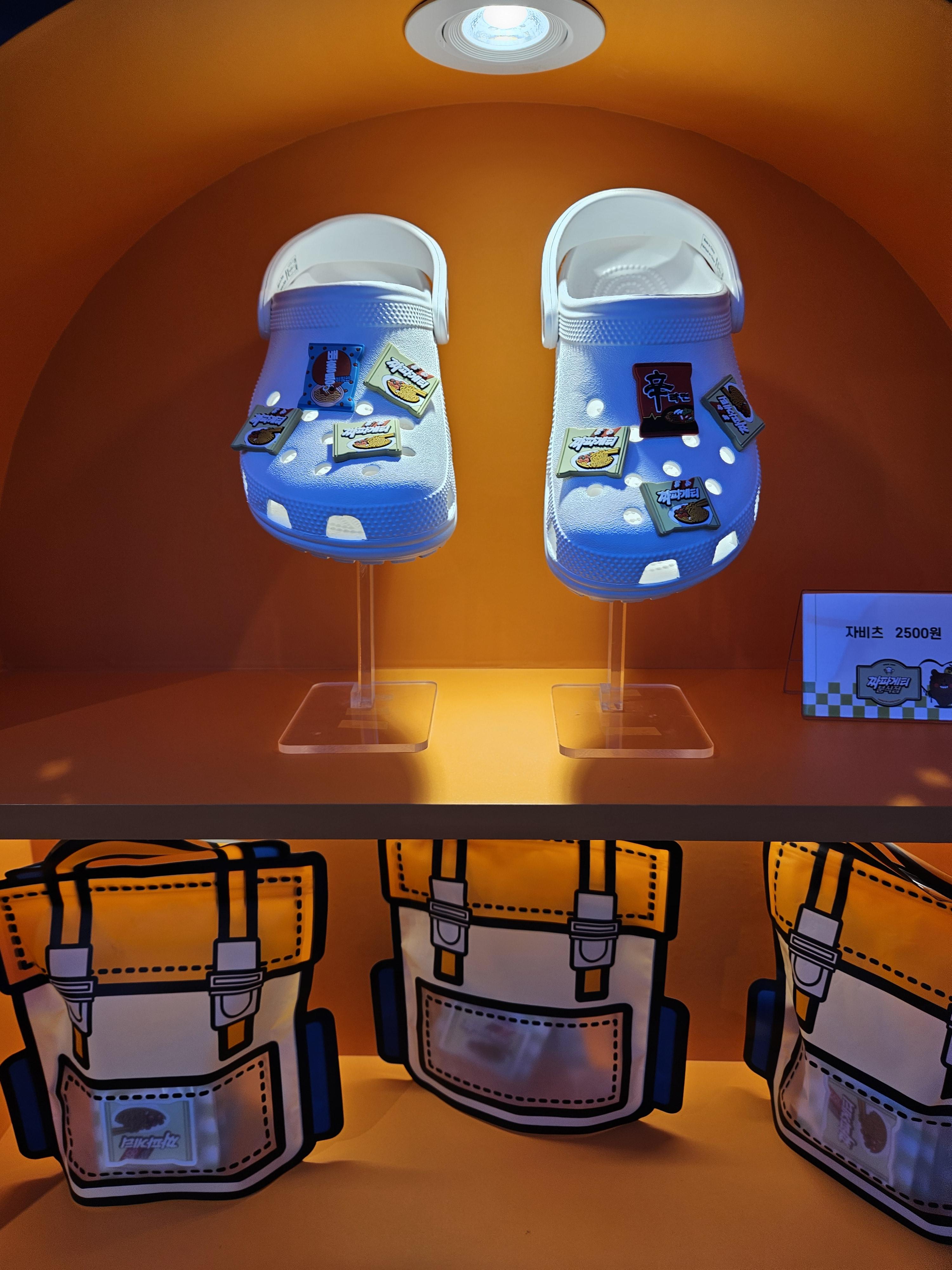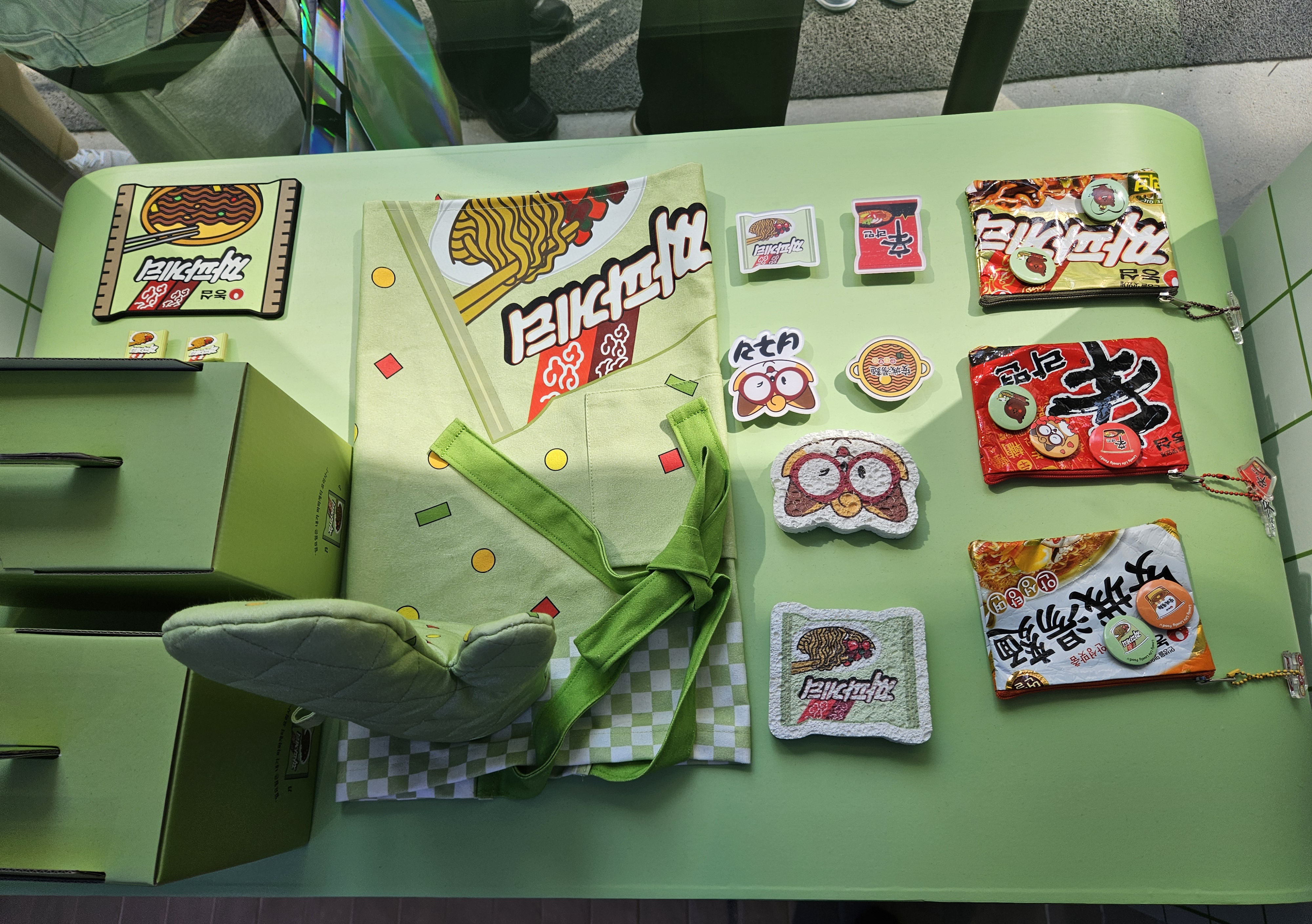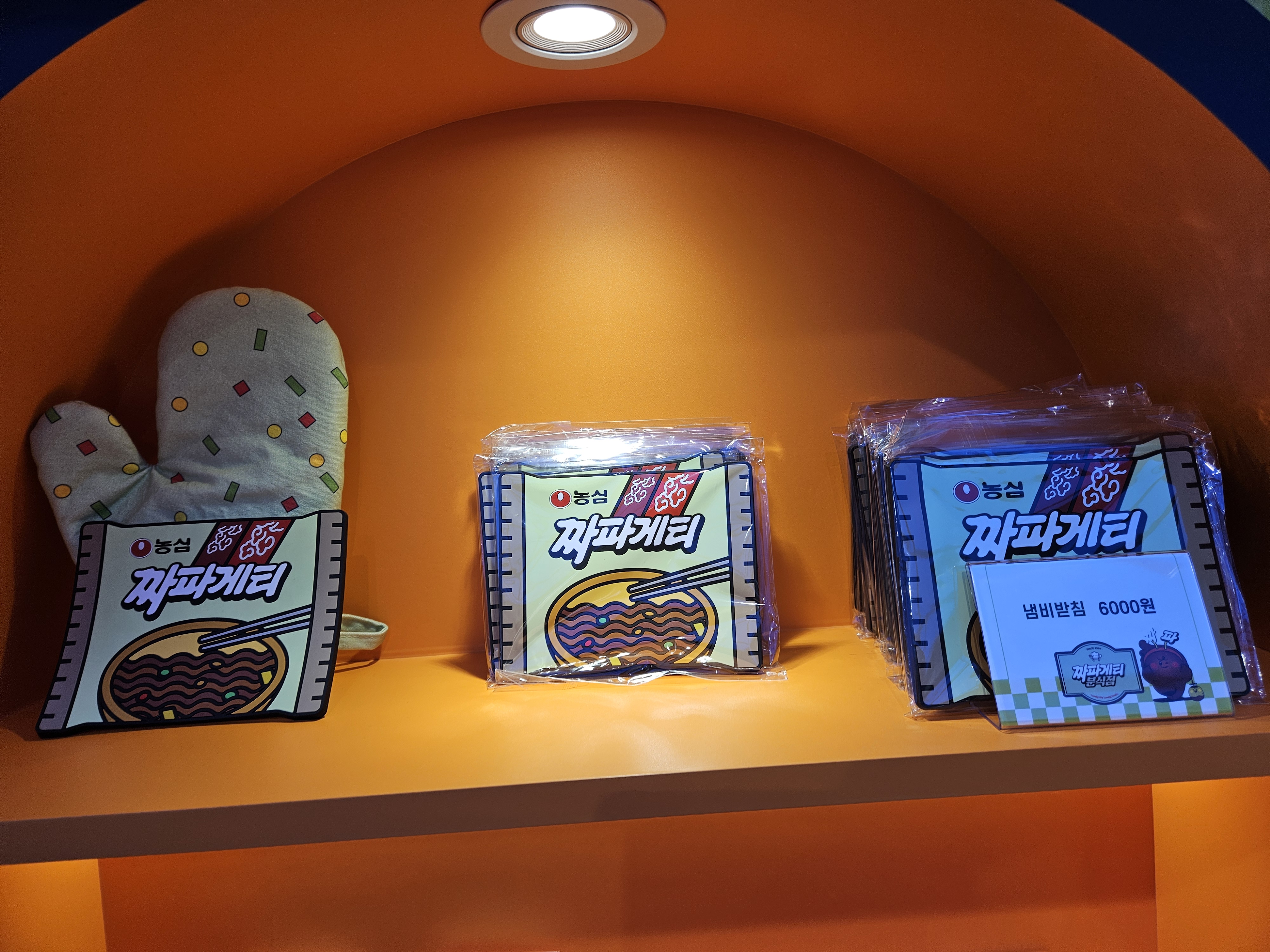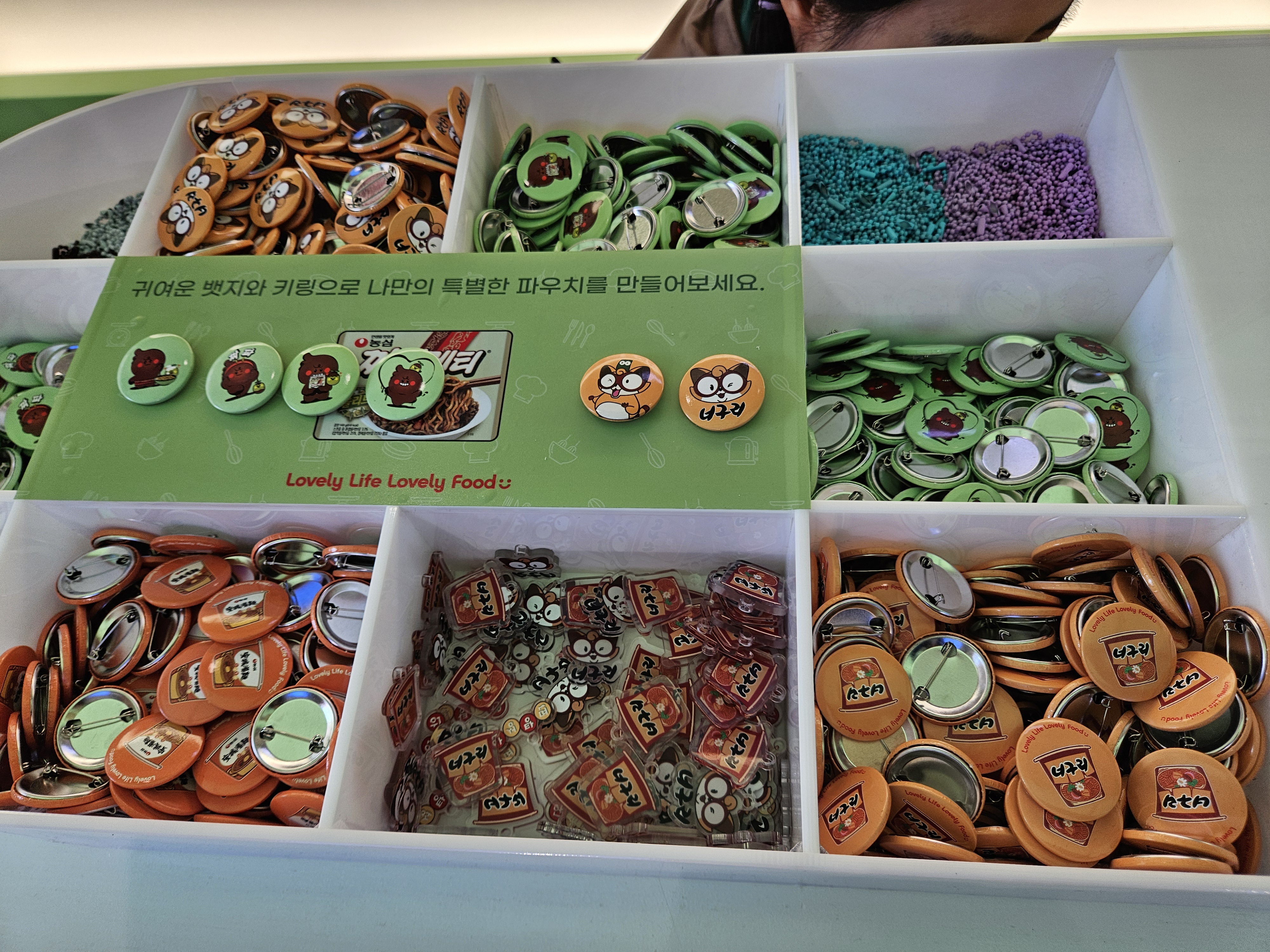 모든 미션 완료 후 1층 오른쪽으로 내려가면 굿즈샵인데 여기서 쿡존에서 주문시 뽑힌 메뉴교환권을 제시하면 미니 파우치를 제공한다. 고리, 뱃지, 키링 하나씩 파우치에 어울리는 거 골아서 가져간다고 하면되는데 난 짜파게티 모양으로 받았네.