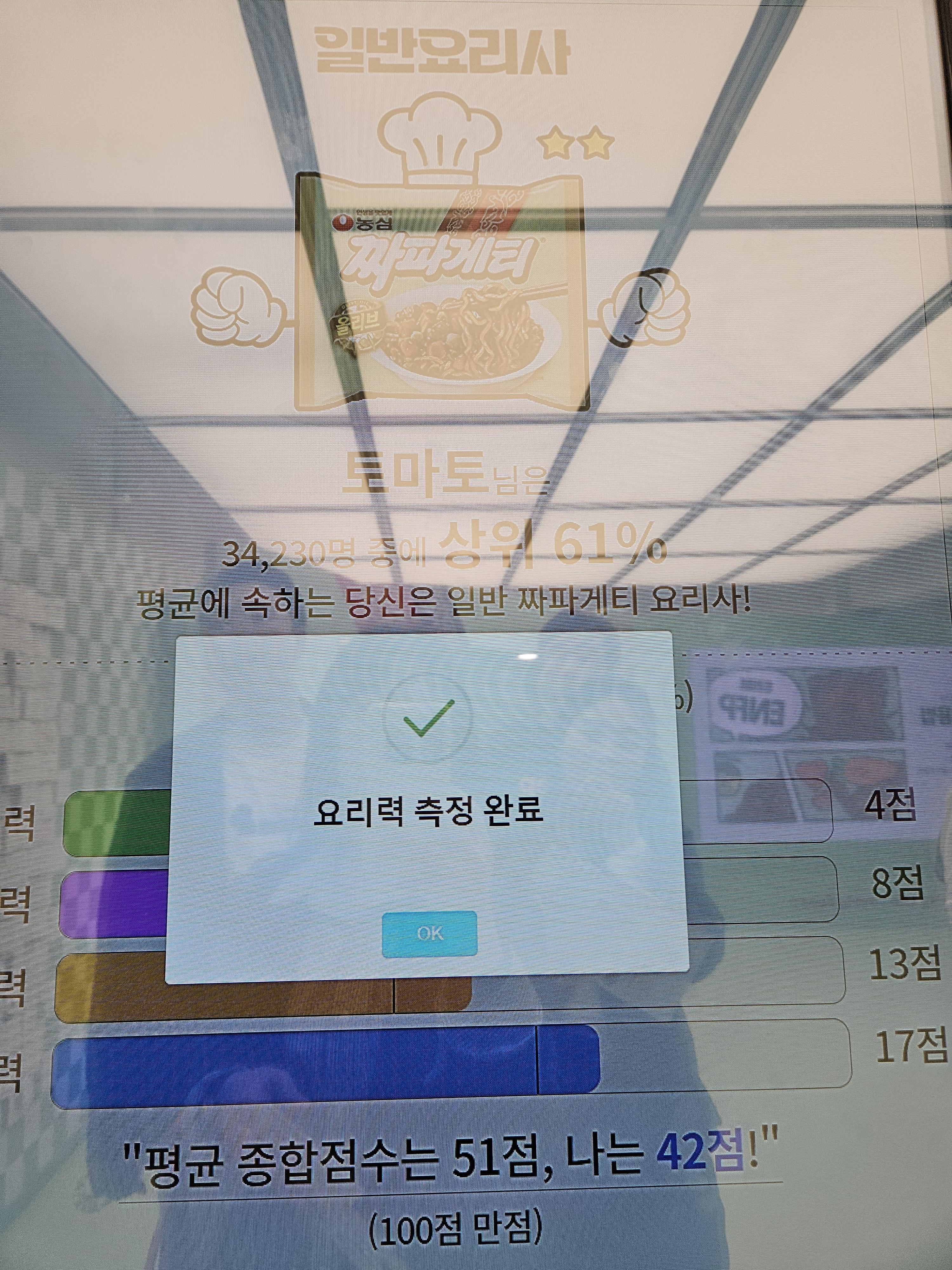 요리력 측정은 별 의미 없지만 재미삼아 눌러보니 34,240명 중 상위 61%라는데 요리력 측정한 사람이 3만 4천명이 넘는다고? ㅋㅋ 대단한 팝업이네 진짜.