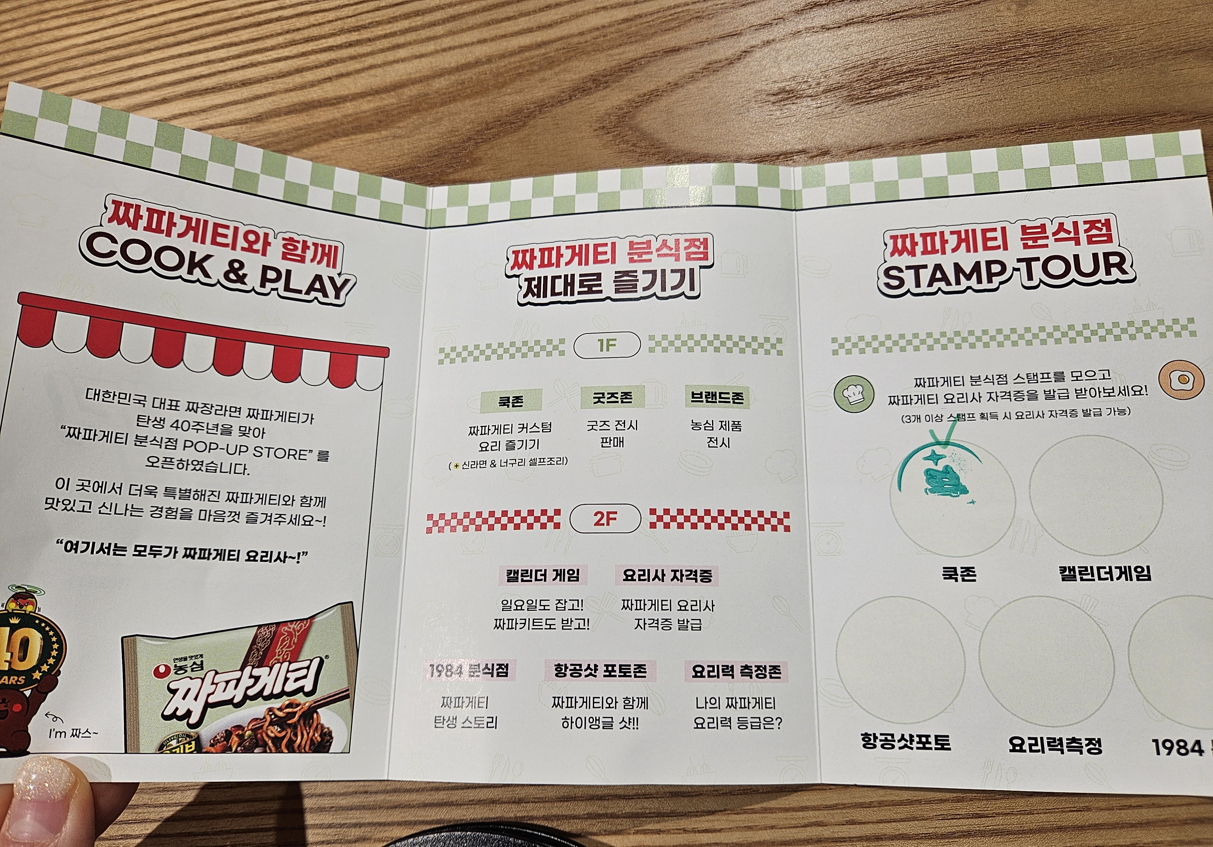 미션은 쿡존, 캘린더게임, 항공샷포토, 요리력측정, 1984분식점 5개인데 3개 이상만 스탬프 획득해도 짜파게티 요리사 자격증 발급이 가능하다고 한다.