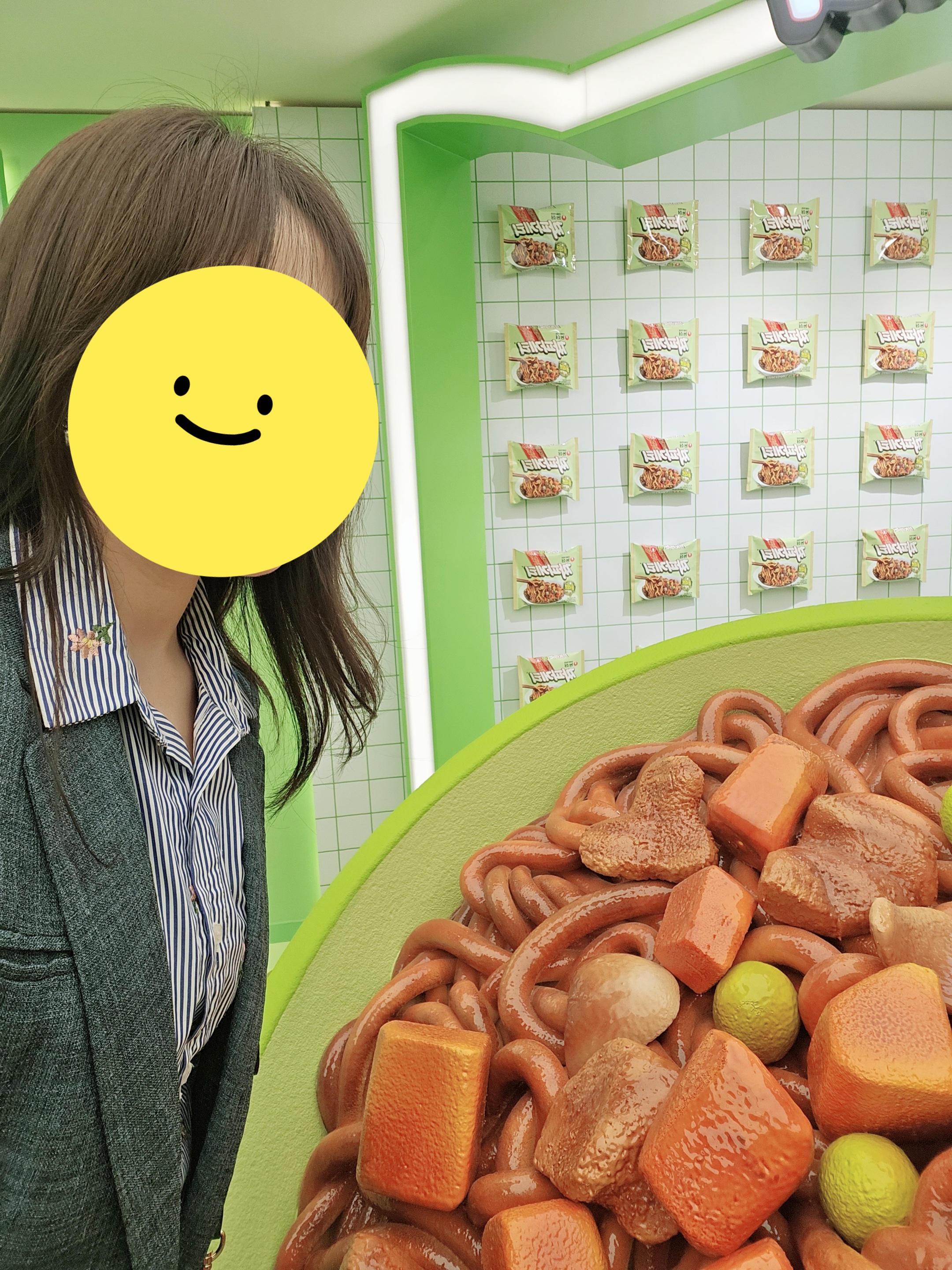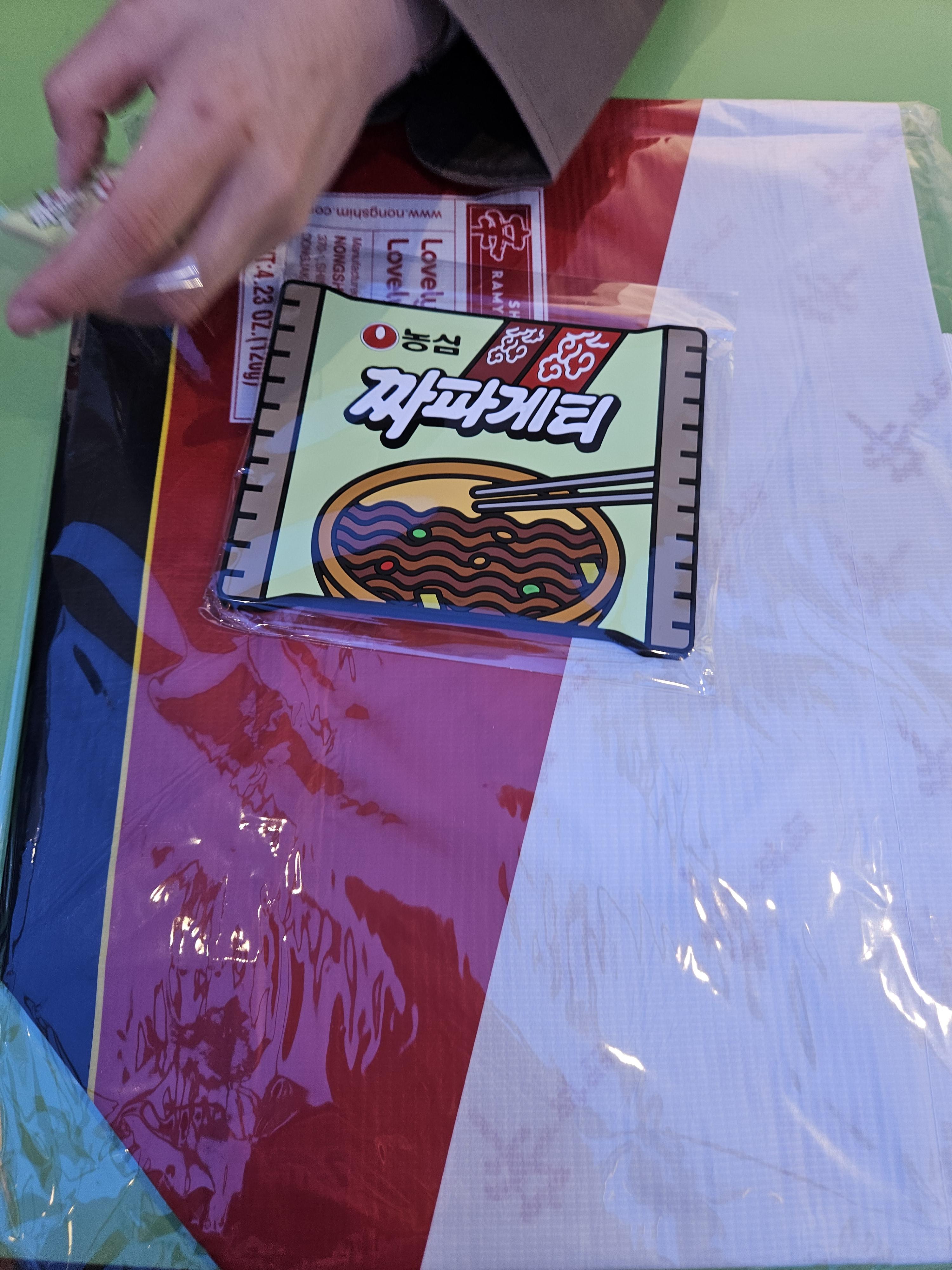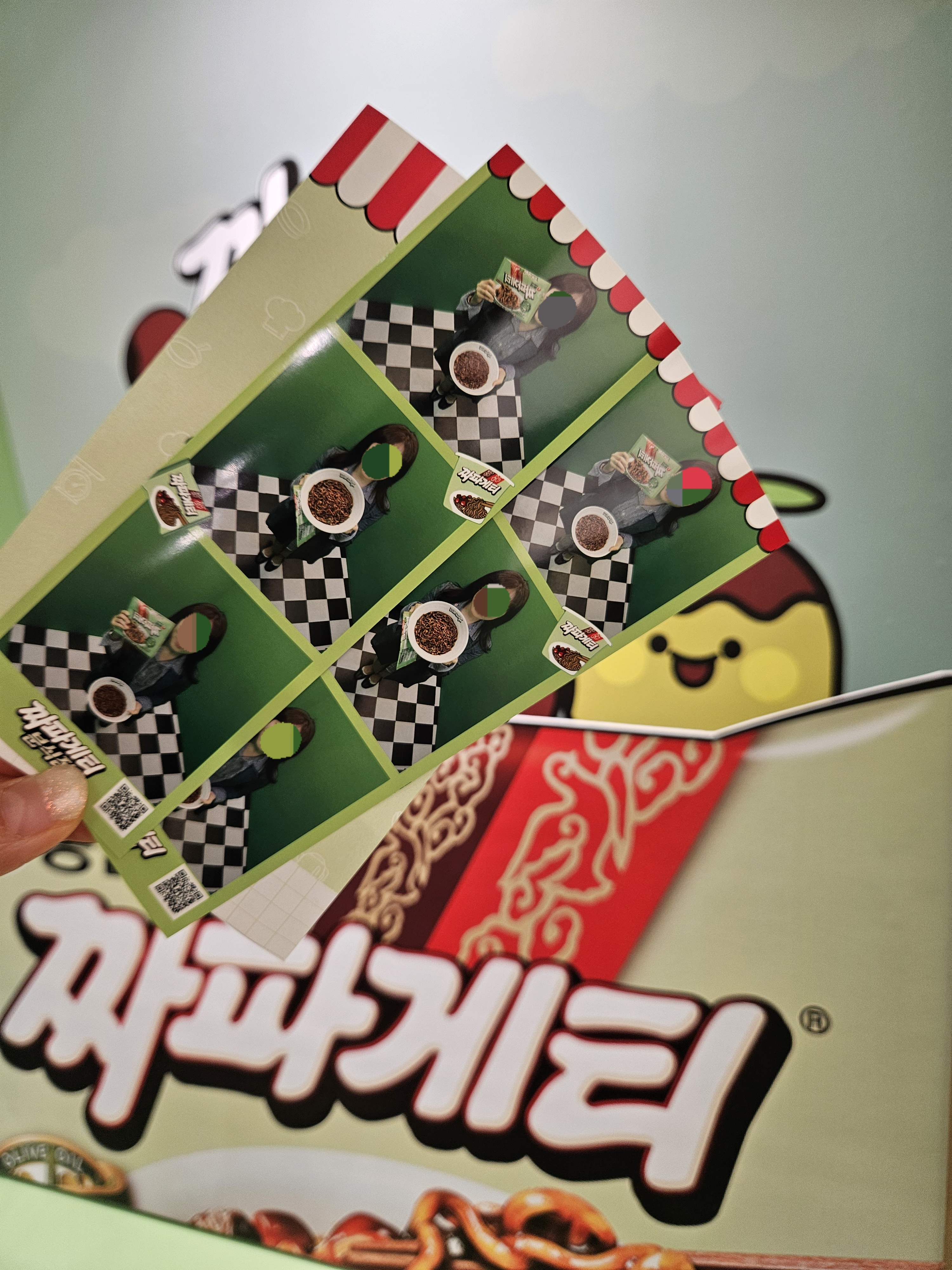 순서되면 부스같이 마련한 룸에 들어가 네컷인가? 사진 촬영하게 되는데 입구에 조리모, 짜파게티 봉지 모형, 짜파게티 접시에 담긴 모형 등이 있으니 활용해서 사진촬영 후 방에서 나와 3컷 선택하면 동일한 사진 2장이 인화된다.
