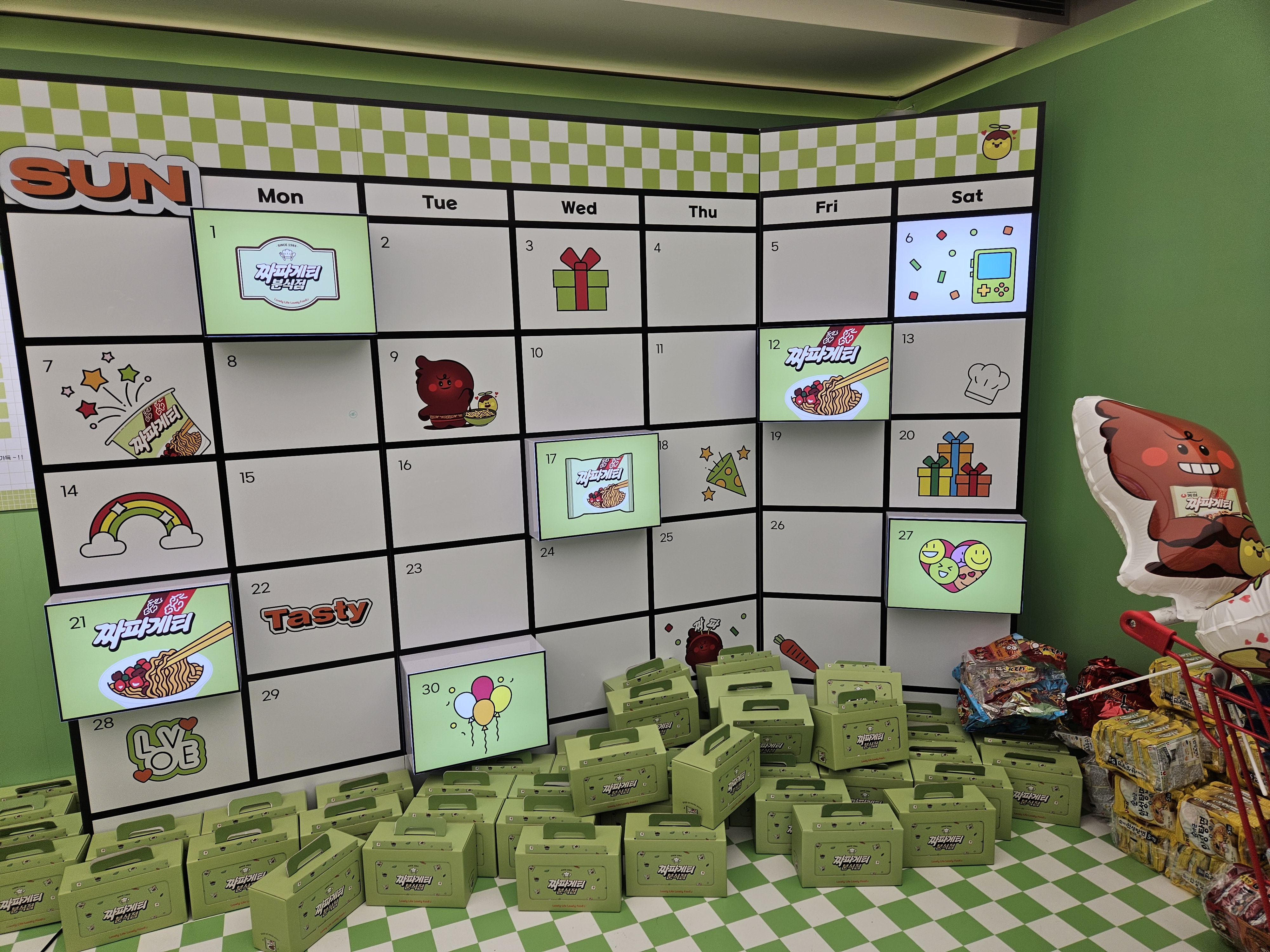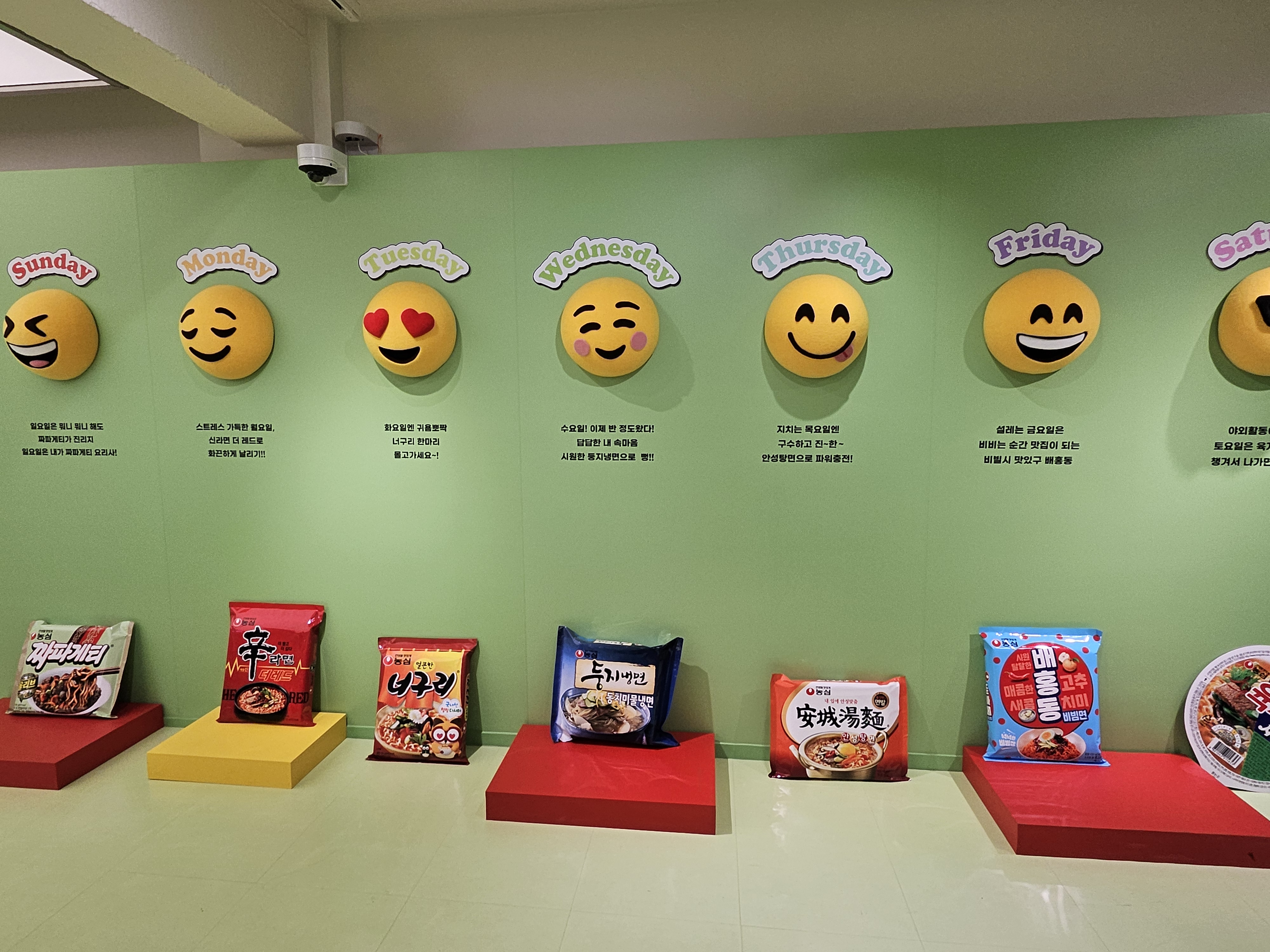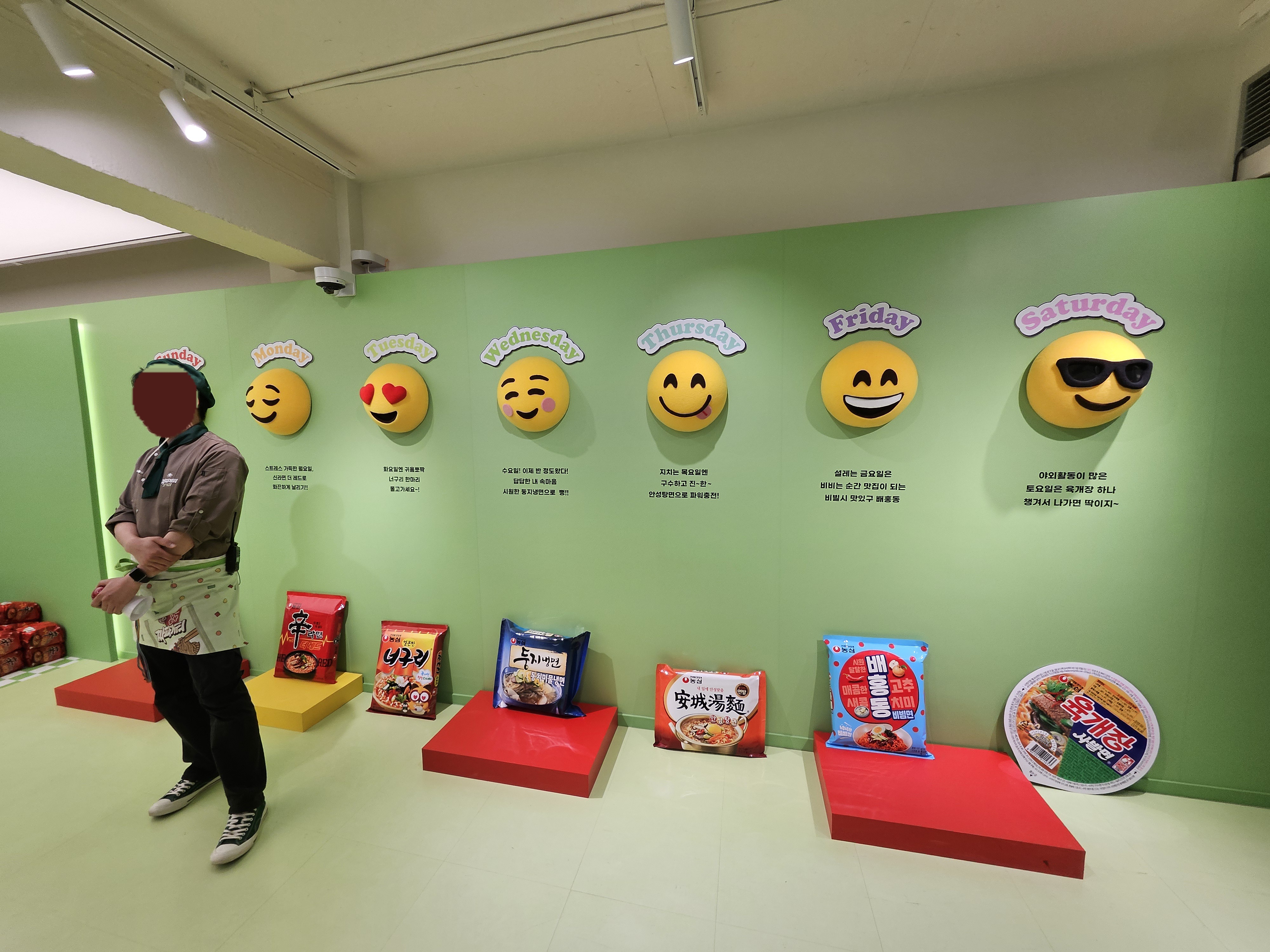 버튼을 눌러서 멈추는 요일에 해당되는 라면을 받는건데 일요일 걸리는게 상품이 가장 푸짐하고 나머지 요일은 그냥 농심 라면 단품 하나 제공하더라. 나는 토요일에 멈춰서 육개장 사발면 하나 받고 항공샷포토 촬영하려고 줄섰는데 이 줄이 제일 길었음.
