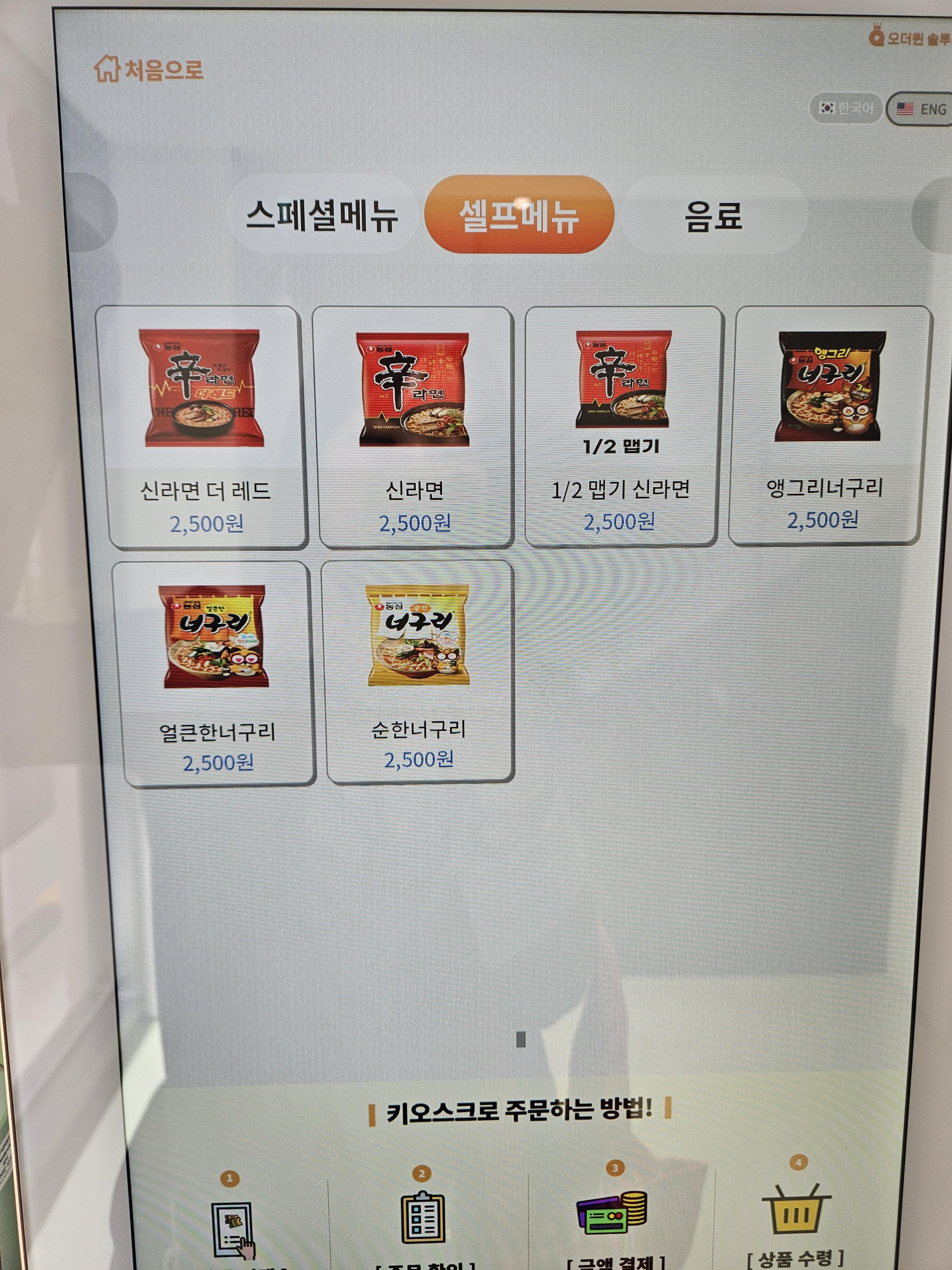 셀프 메뉴는 신라면 더레드, 신라면, 1/2 맵기 신라면, 앵그리 너구리, 얼큰한 너구리, 순한 너구리로 역시 6가지 가격은 각 2,5으로 동일했음.