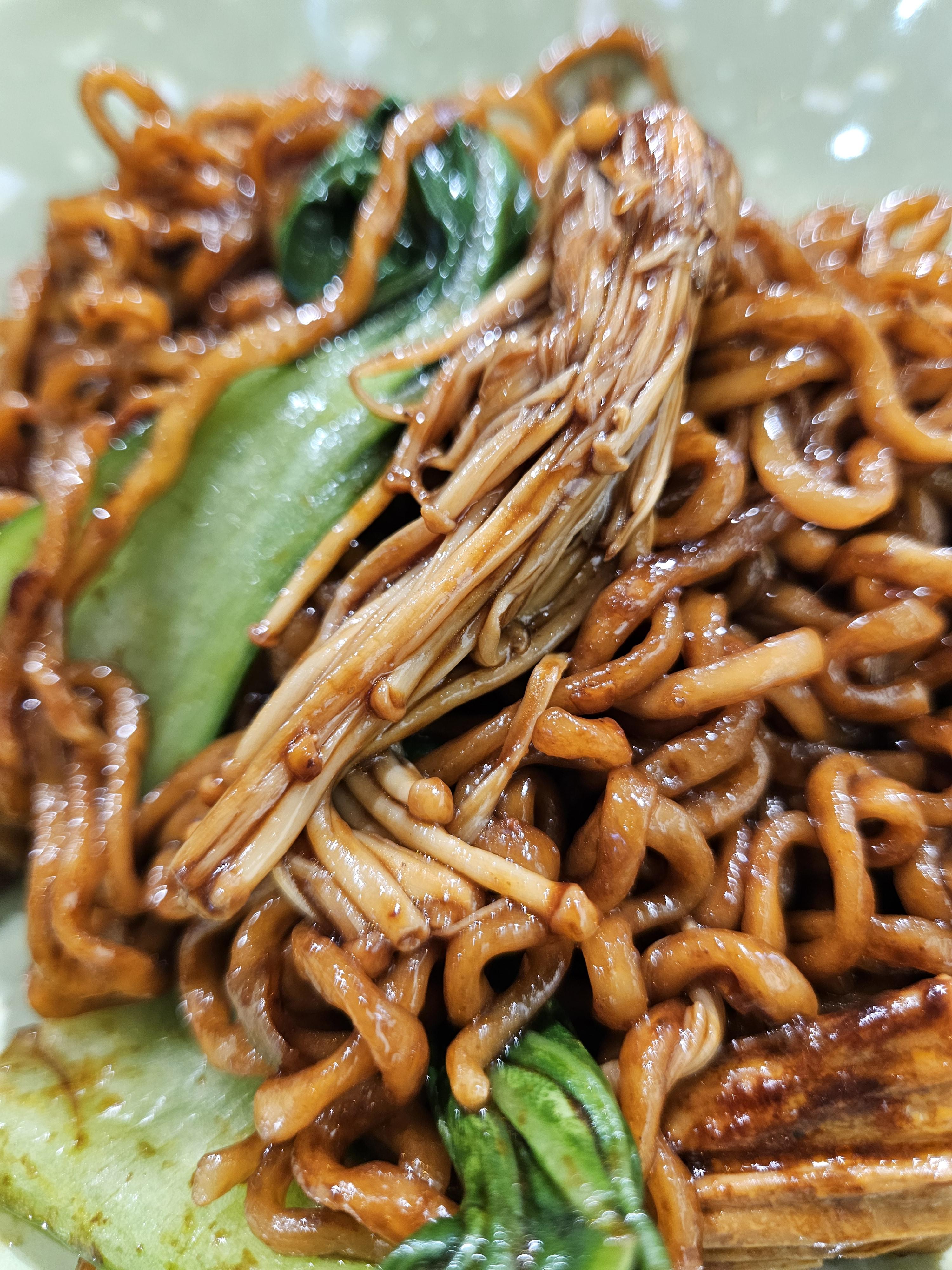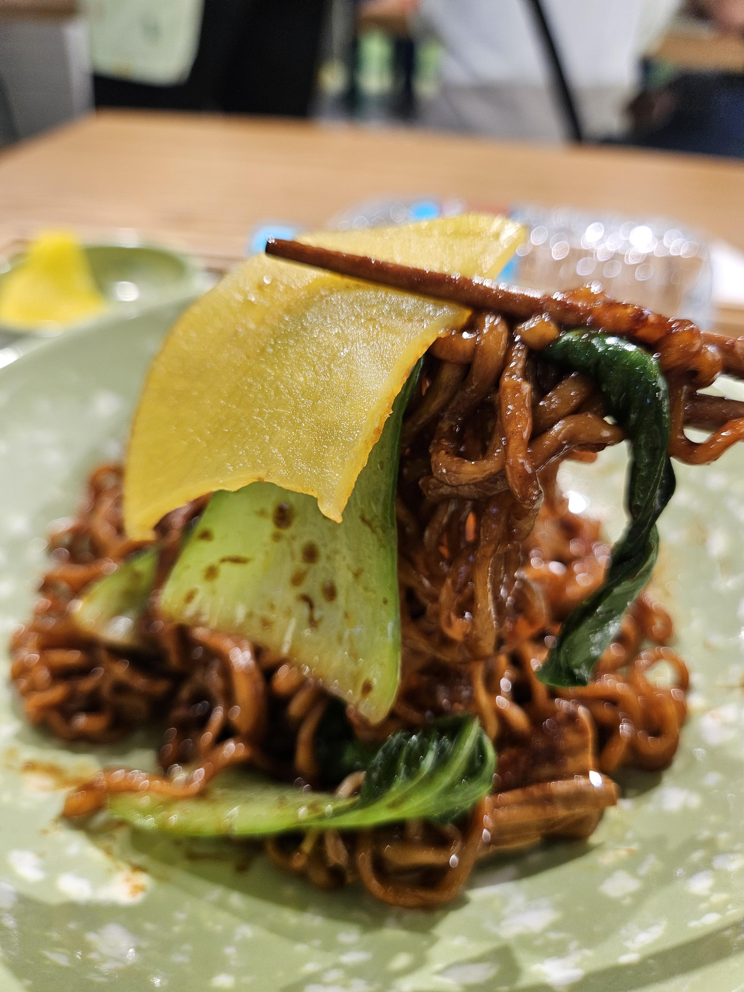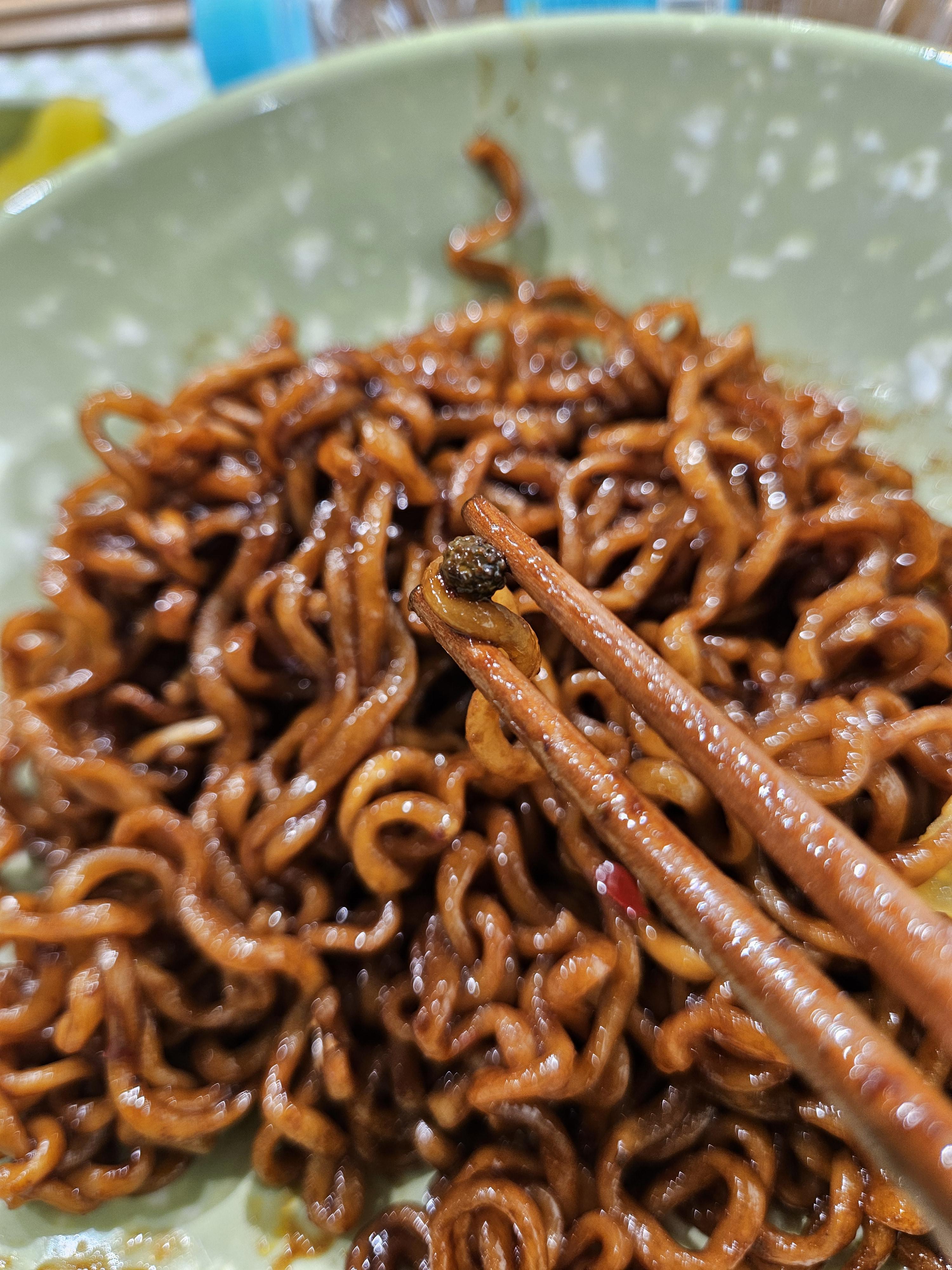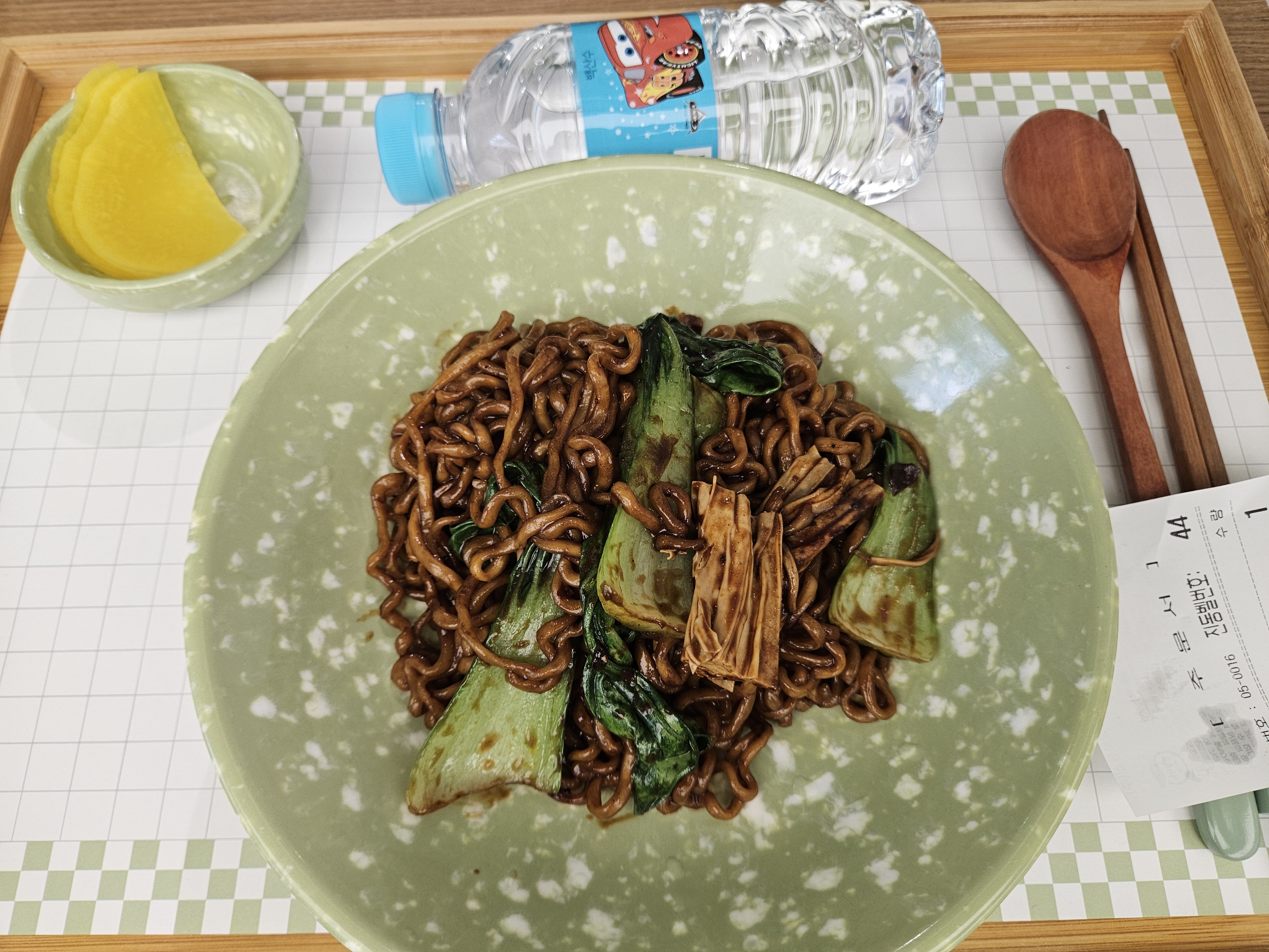 분식집에서 제공됐던 추억의 점박이 스타일 분식집 그릇에 조리한 마라짜파게티와 단무지 담아서 제공됐다. 짜파게티만 끓여주지 않고 중식 느낌나게 청경채와 푸주(포두부)도 조금 들어있었음.