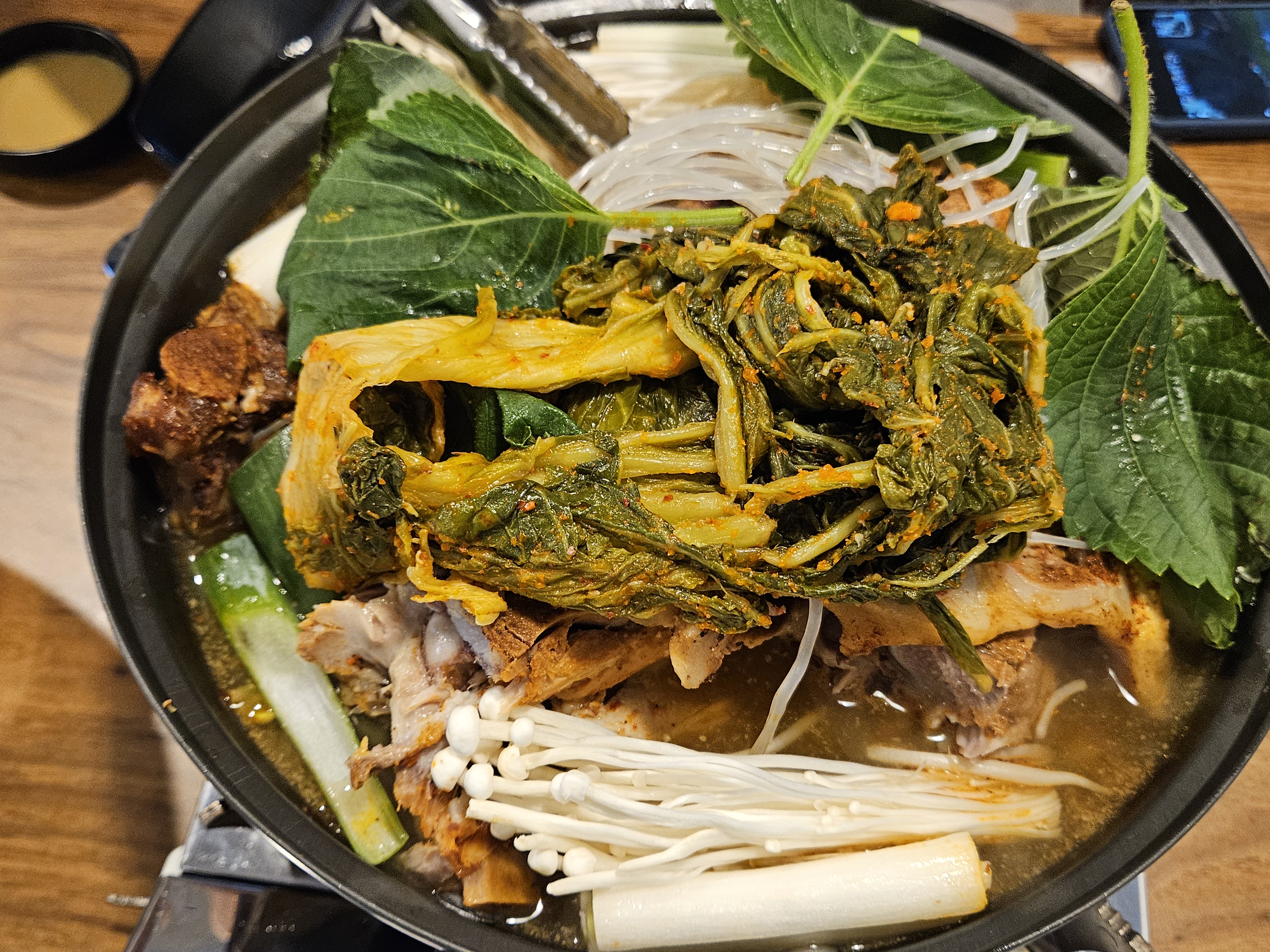 등뼈는 익혀 나오기 때문에 센 불에 보글보글 끓어 채소 숨이 죽고 고기가 잘 데어지면 먹으면 되는데 고기 찍먹할 겨자 소스도 덜어둔다.