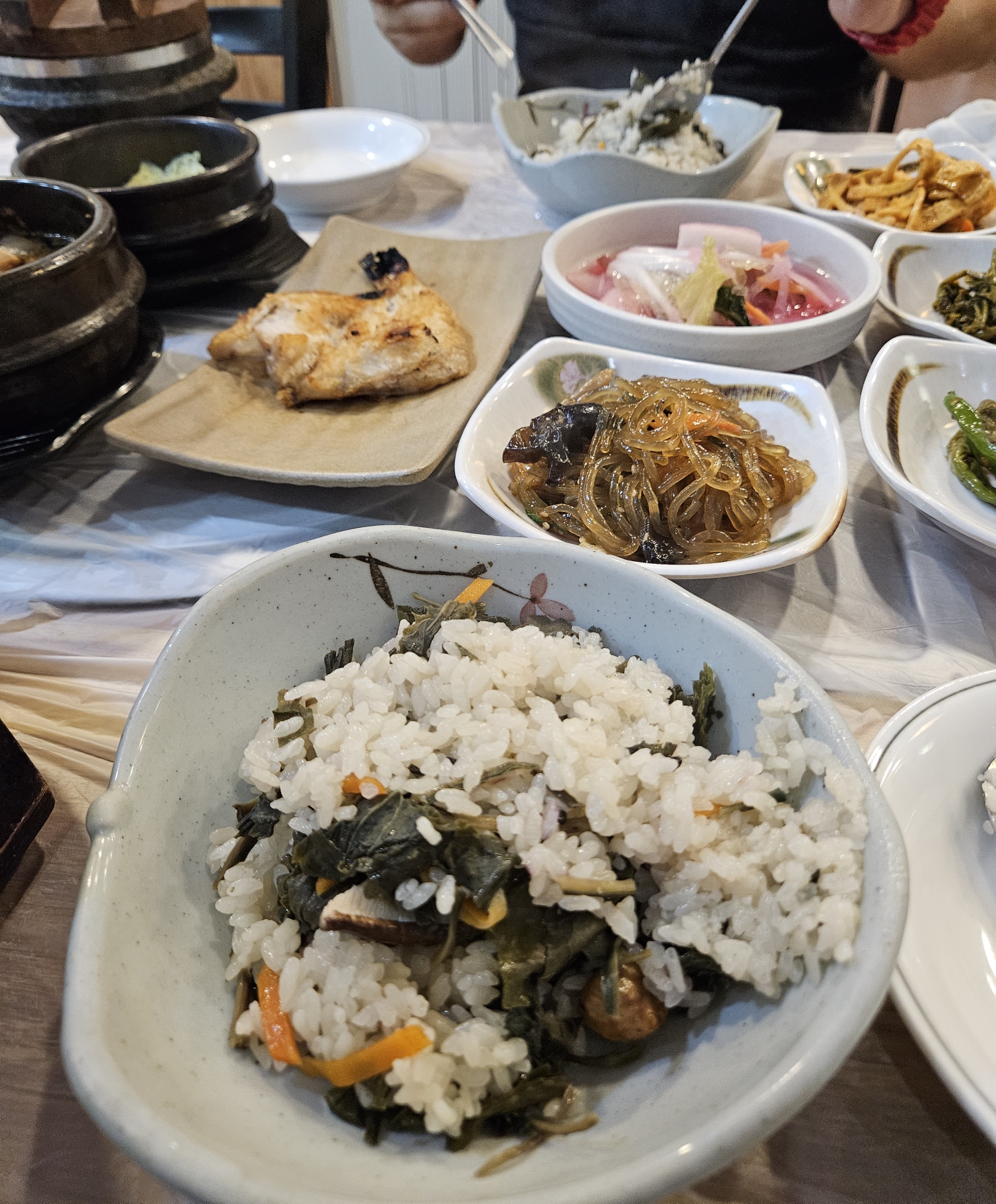 10가지 기본 찬에 전과, 더덕구이, 생선구이에 구수한 된장찌개와 계란찜이 추가로 제공되고 눈개승마, 은행, 표고버섯, 채소 등을 넣고 지은 돌솥밥이 나와서 푸짐한 한 상. 가격대도 저렴한 편이다.