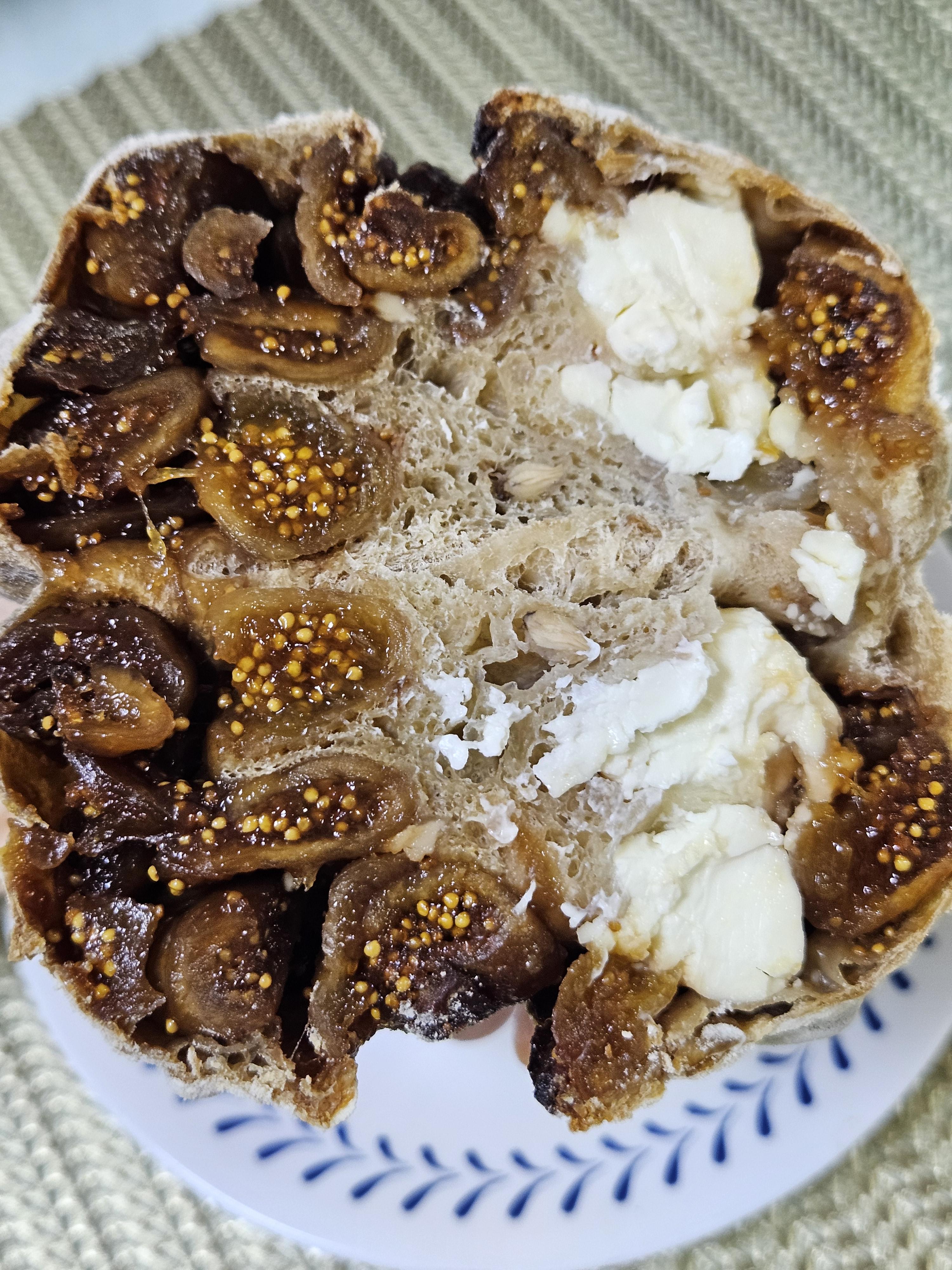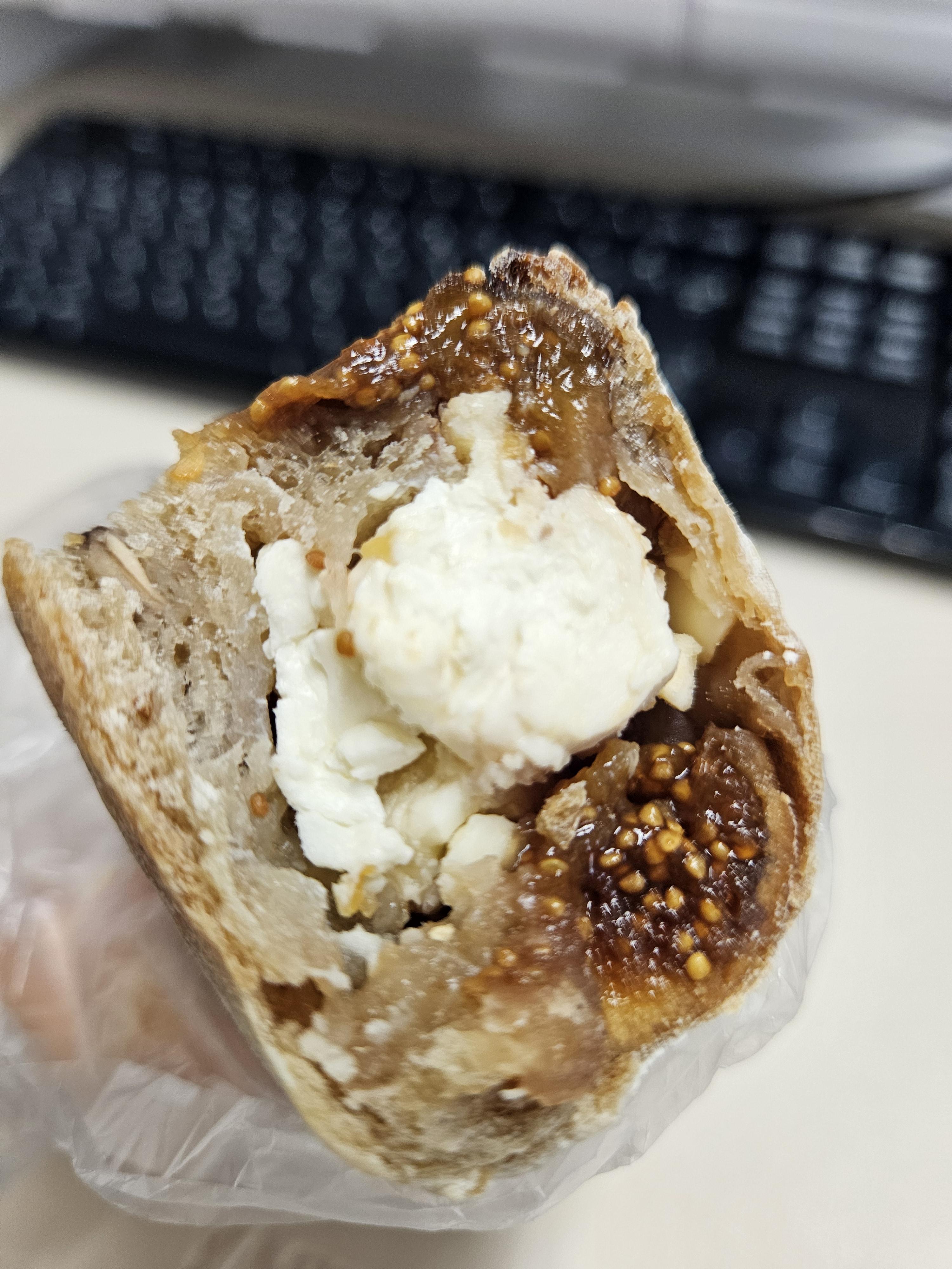 이거 먹고 감동의 무화과빵도 좀 잘라봤는데 캄파뉴 같은 사워도우 건강빵 안에 무화과와 크림치즈 덩어리가 잔뜩 박혀있다. 빵은 질긴 편이니 오래 씹어야 하는데 내용물이 가득해서 싱겁거나 밋밋하지 않은 맛.