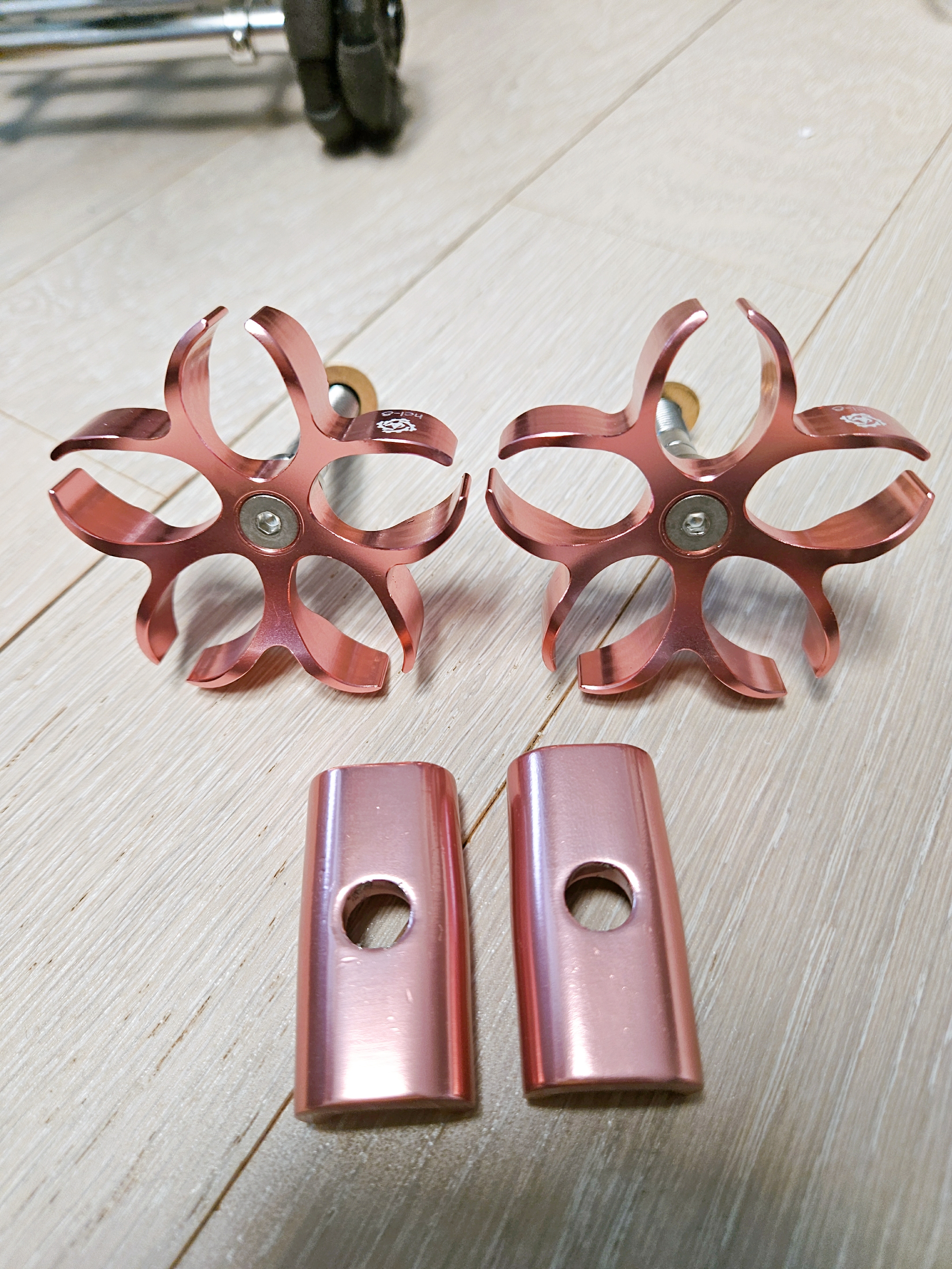핑크색 벚꽃 모양 레버와 핑크색 프론트백도 세트처럼 잘 어울리고 포인트 되니 만족. 자전거 접고 펴는데 잘 되는지 테스트해보니 이상 없어서 다행이다.