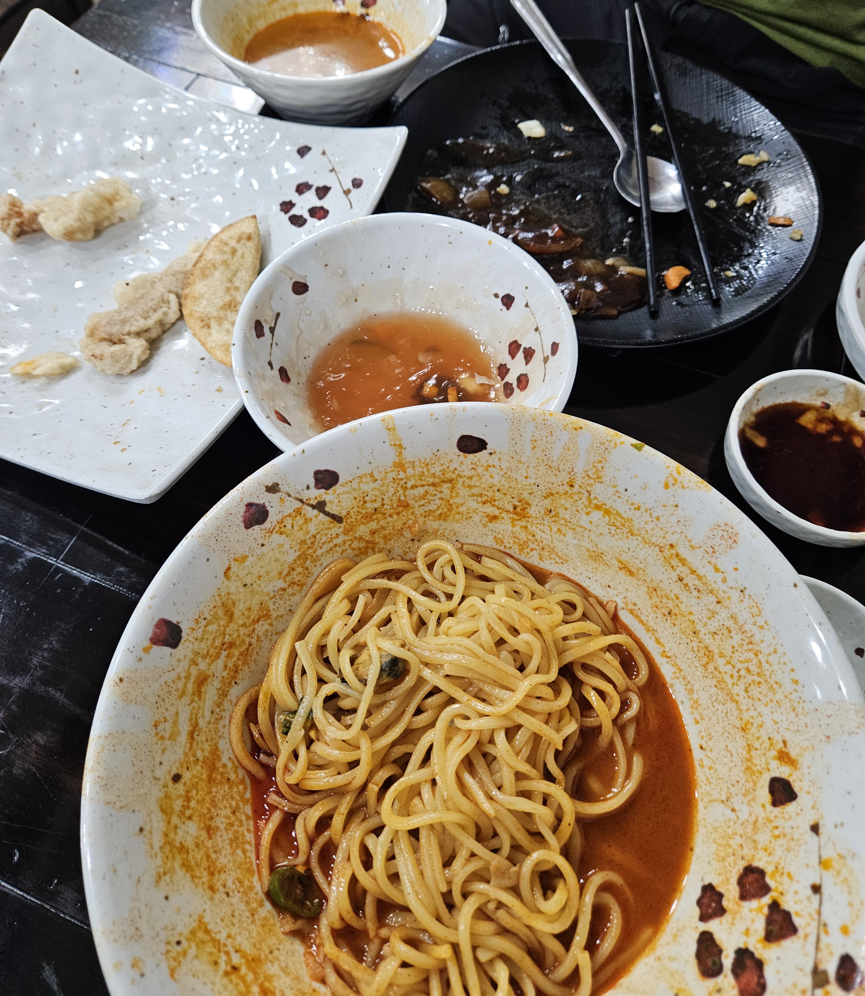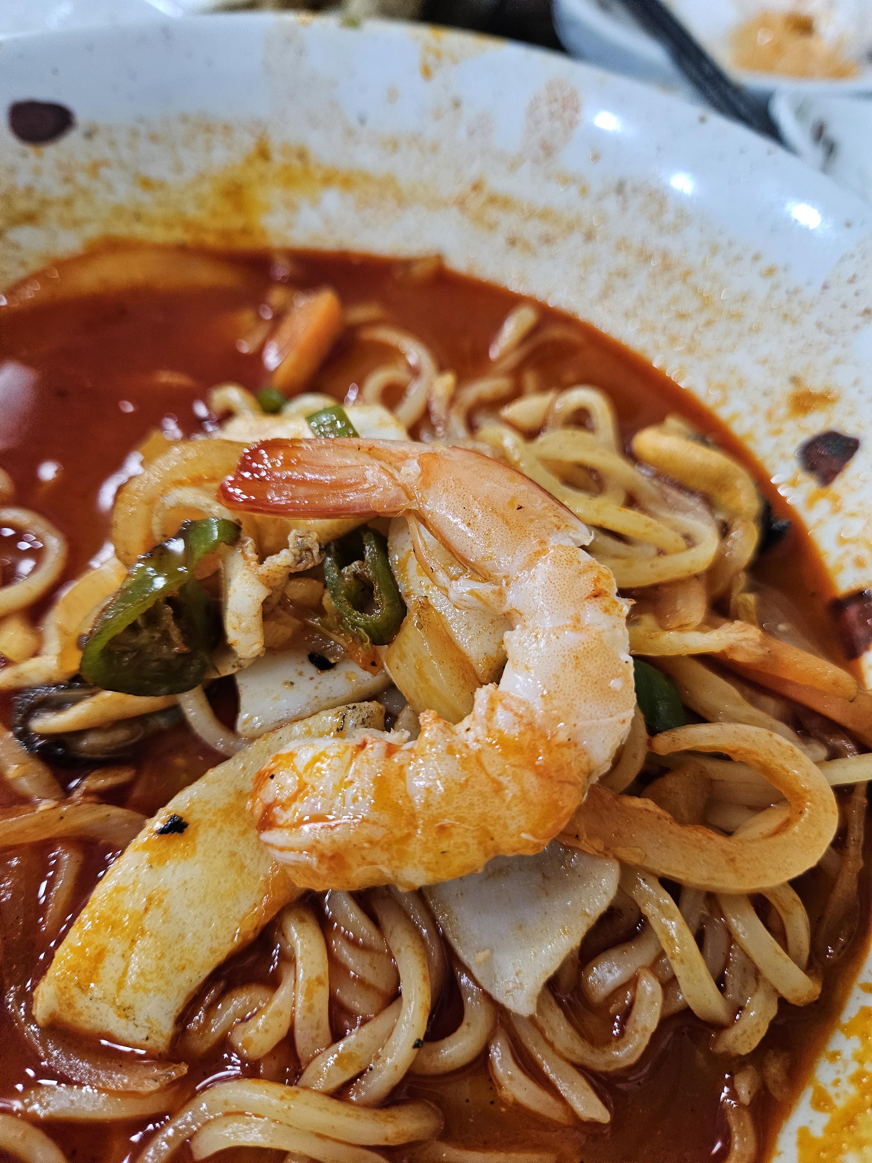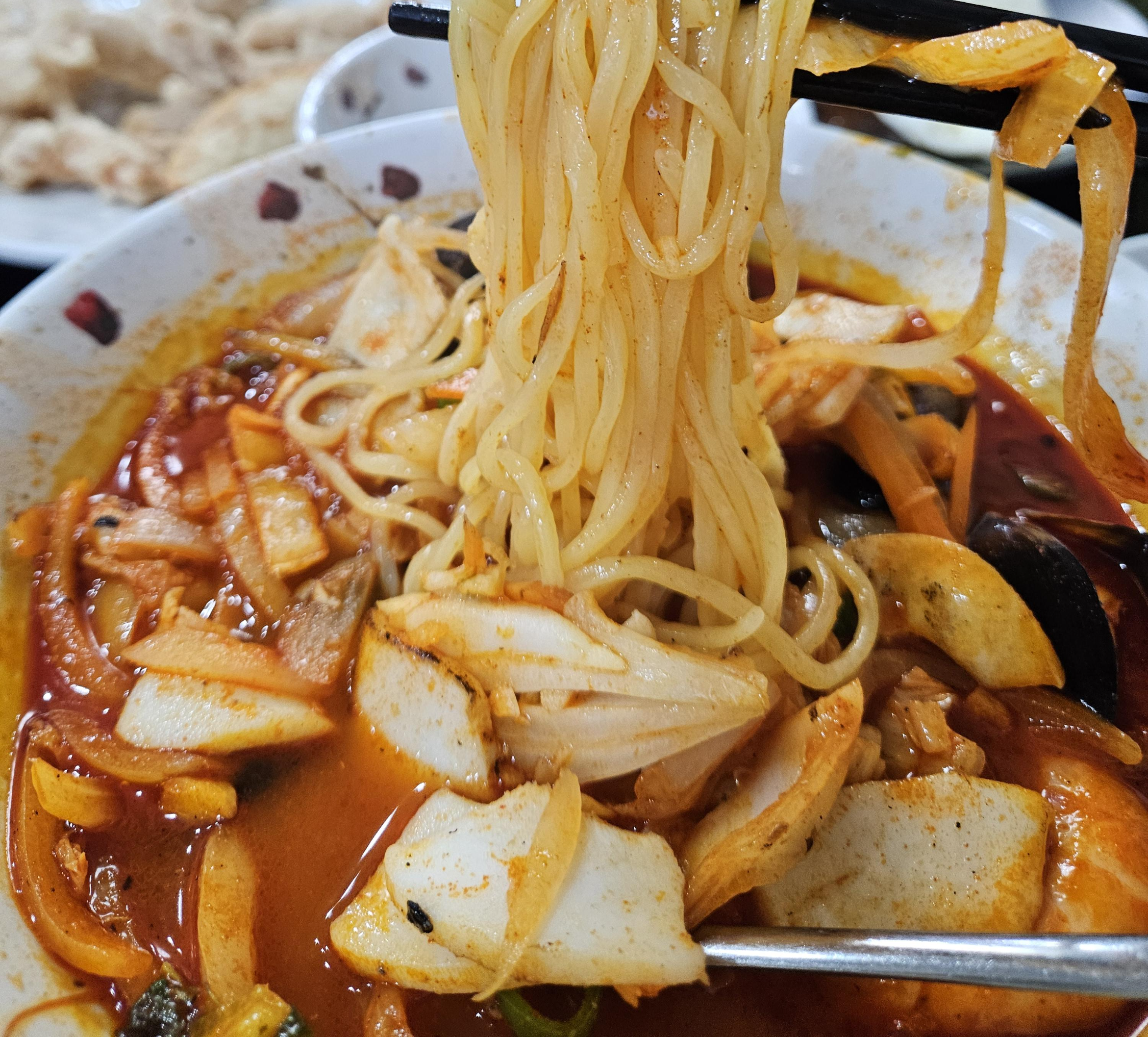 양파, 오징어, 홍합, 고추, 고기가 들어있고 면이 정말 많아서 곱빼기 시켰는 줄. 여자 혼자 먹자니 무조건 남길 만한 양인데 맛있어서 계속 먹다 보니 반 정도는 해결했다.