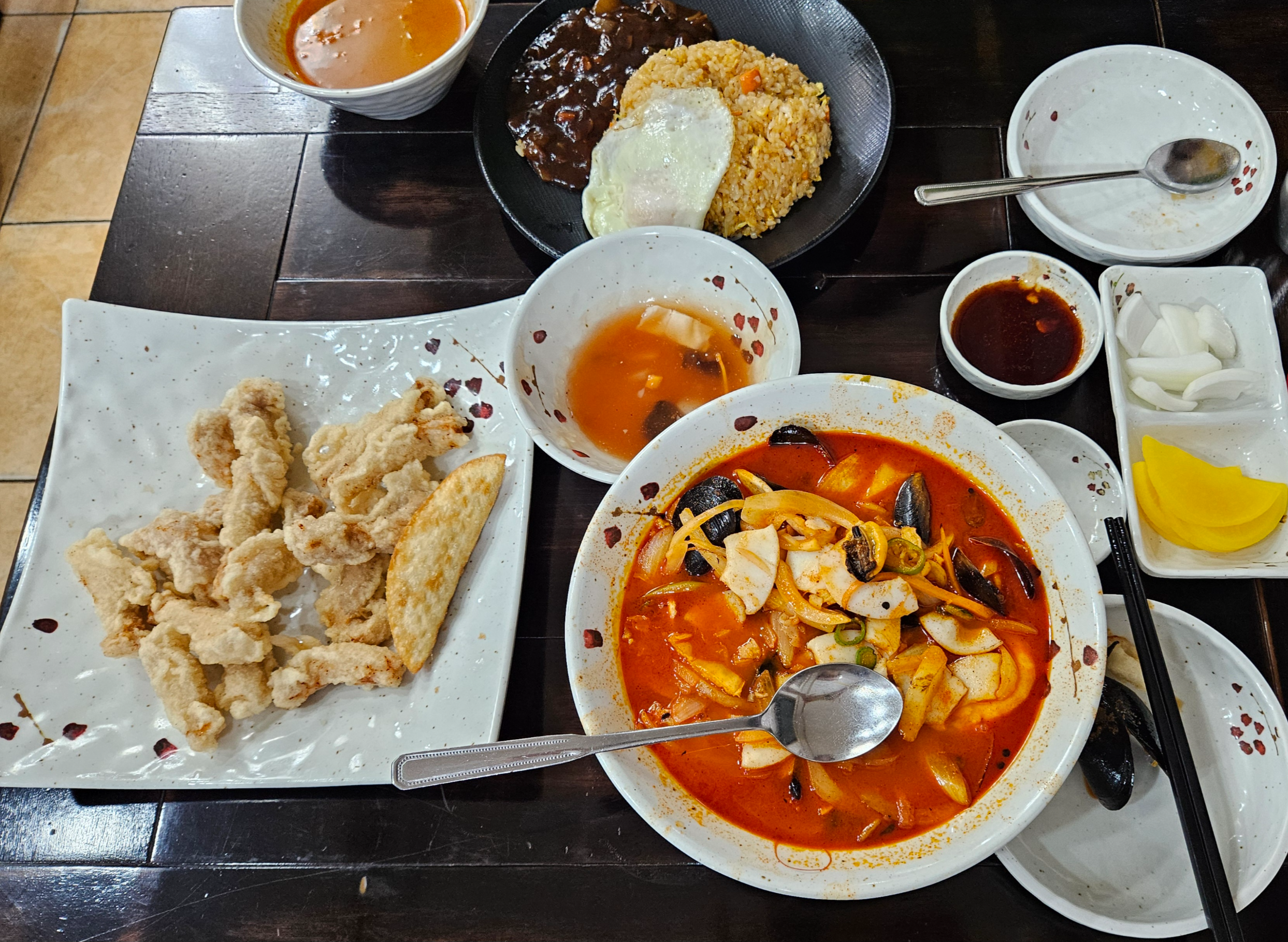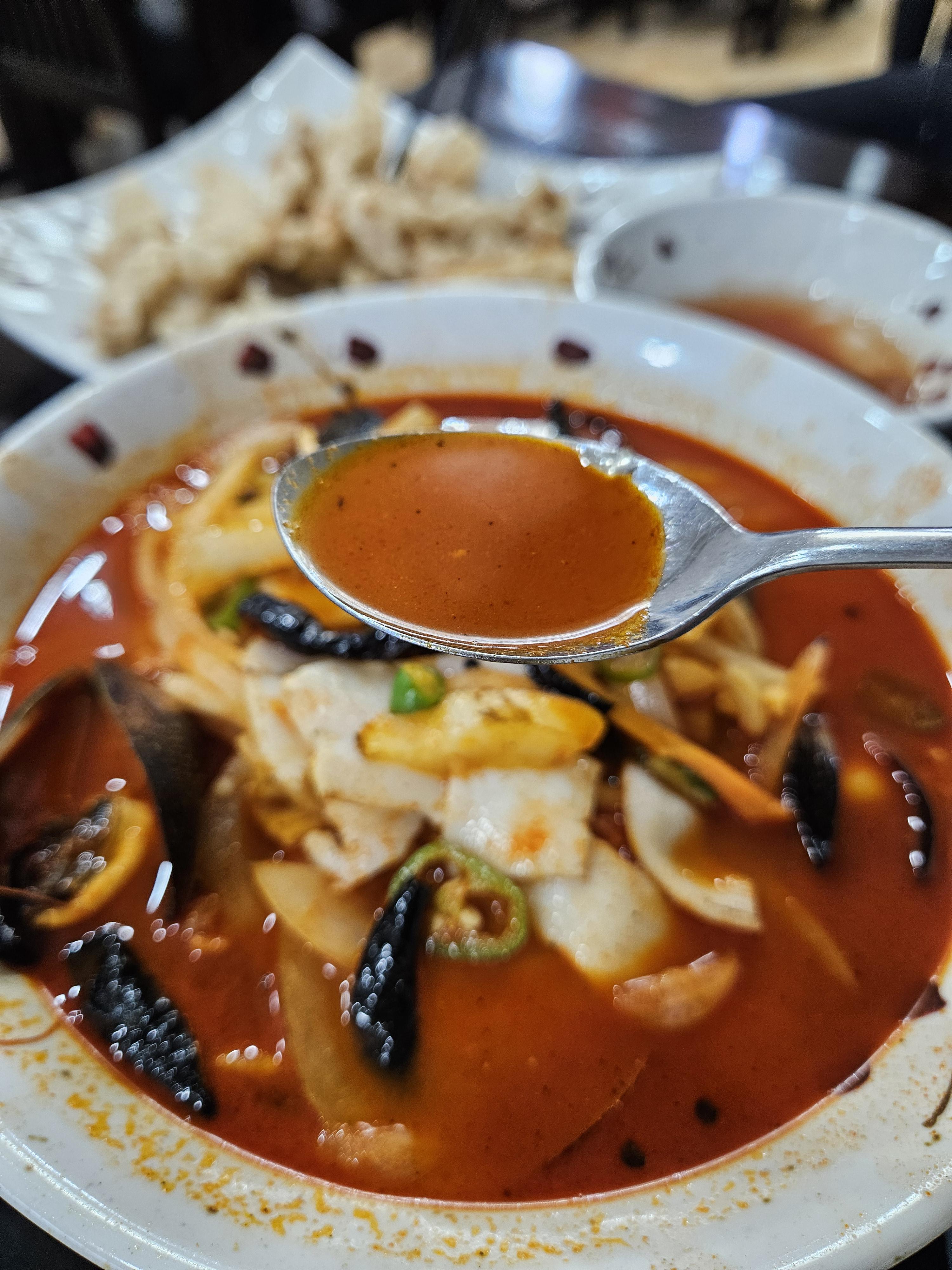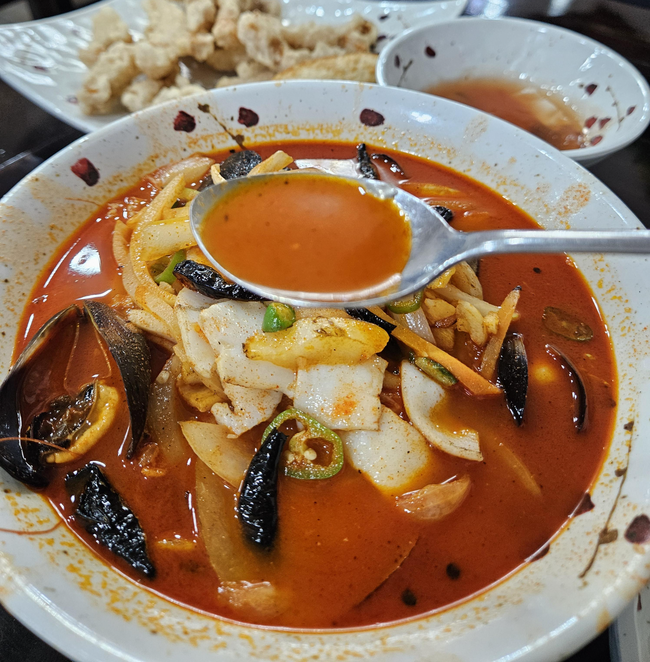 양파, 오징어, 홍합, 고추, 고기가 들어있고 면이 정말 많아서 곱빼기 시켰는 줄. 여자 혼자 먹자니 무조건 남길 만한 양인데 맛있어서 계속 먹다 보니 반 정도는 해결했다.