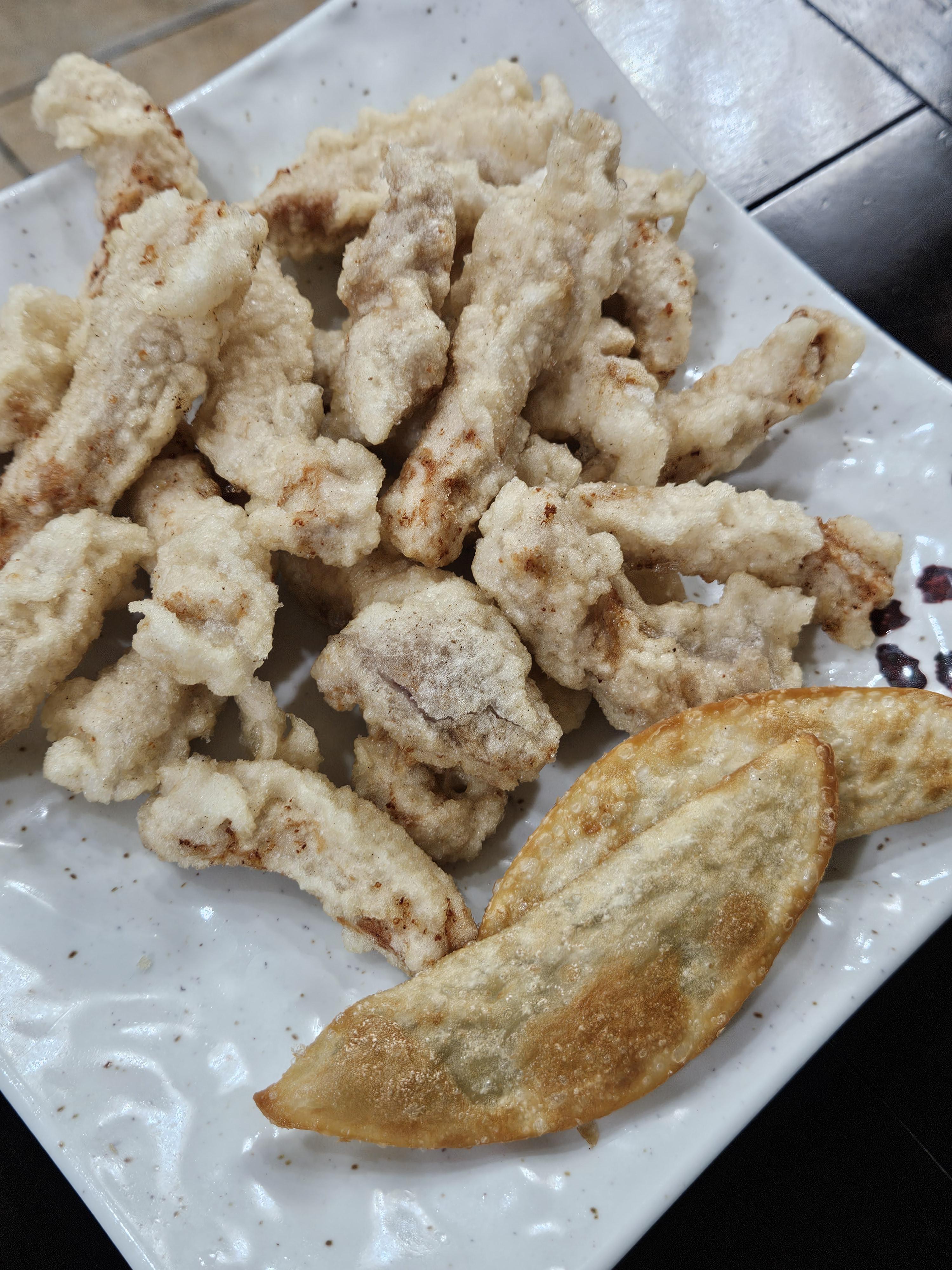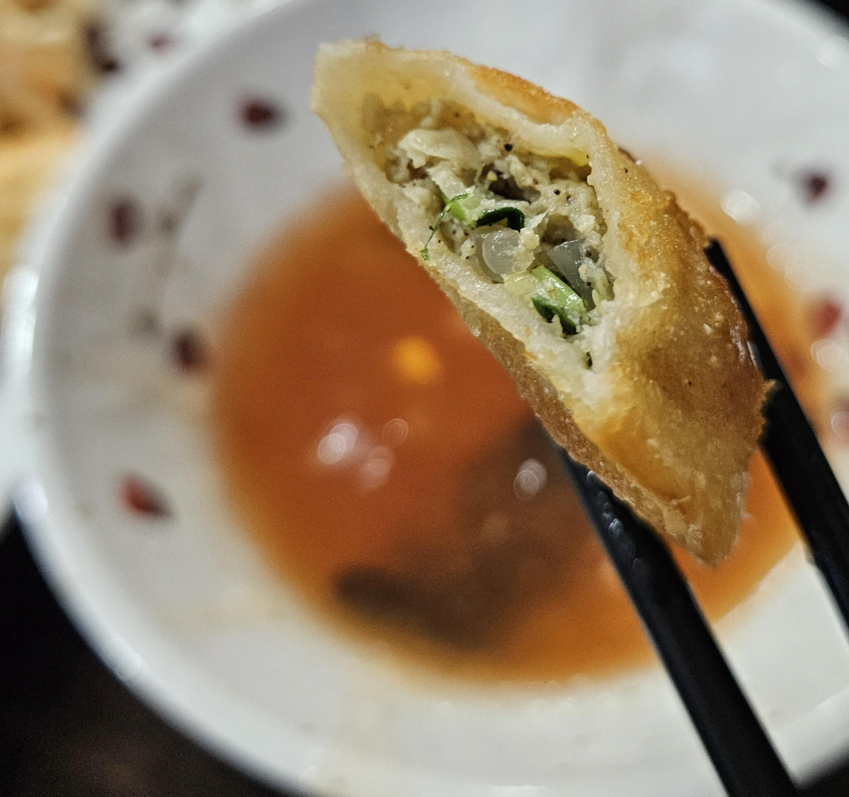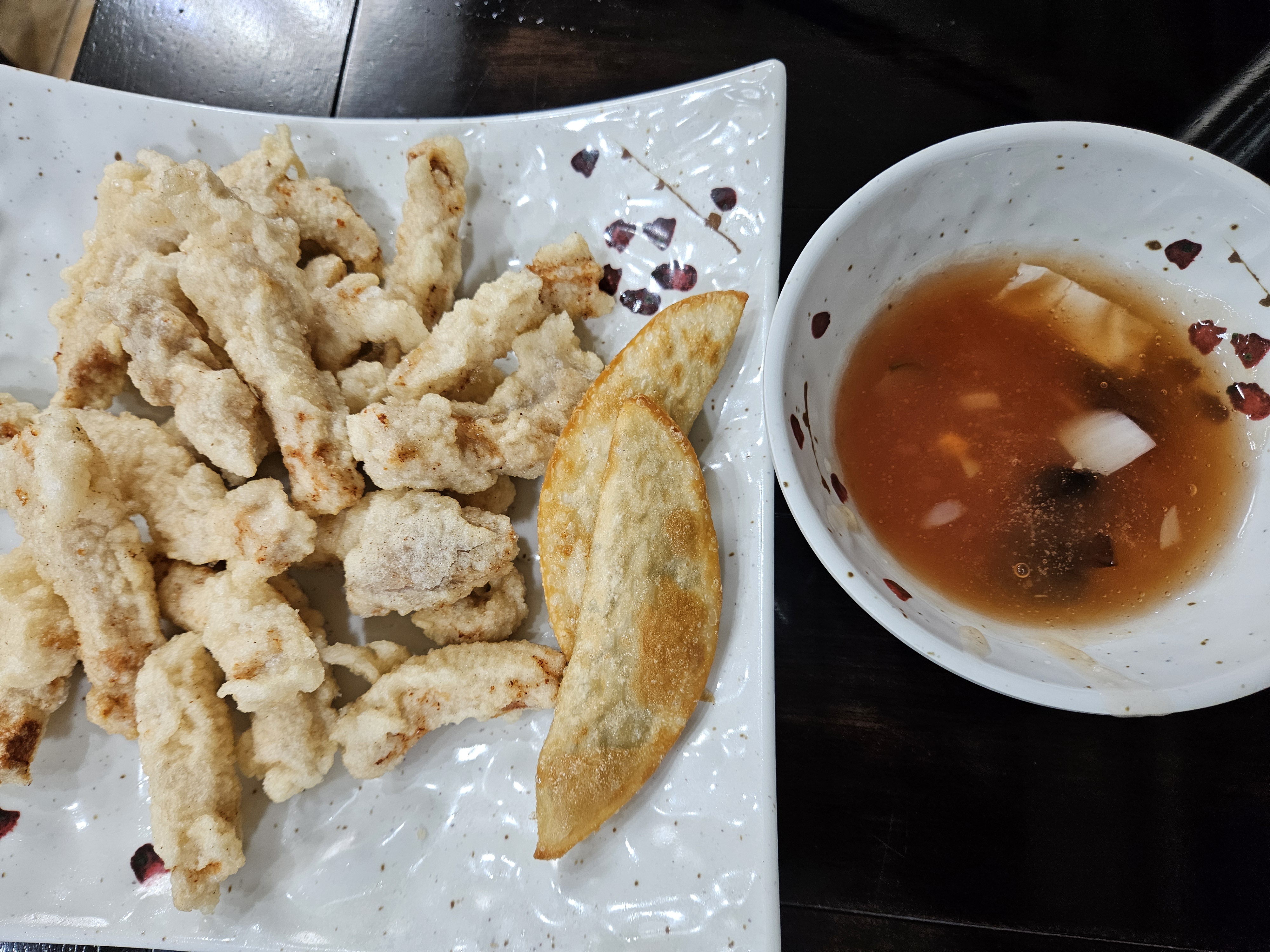사이드 메뉴 군만두는 5개 3천 원, 10개는 5천 원 가격이 참 착해서 주문해야 하나 하고 있을 때 사장님이 갓 튀긴 만두 2개 맛보고 있으라며 갖다 주셨음 ㅎㅎ 고기만두인데 큼지막하네 ~