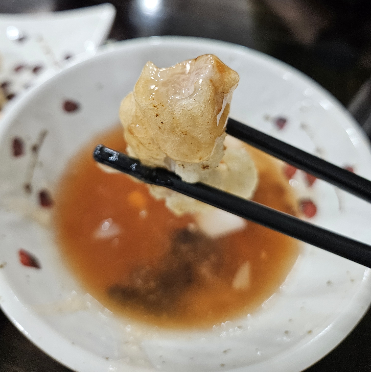 탕수육이 먼저 제공됐음. 찍먹 스타일로 손가락 굵기에 큼지막한 등심을 얇은 찹쌀반죽에 튀겨낸 듯싶다. 고기는 부드럽고 잡내도 없었다. 갓 튀긴 고기튀김 자체만으로도 맛있음. 반죽옷이 두껍지 않은 것도 마음에 들고 식간장에 살짝 찍어 먹어도 굿~