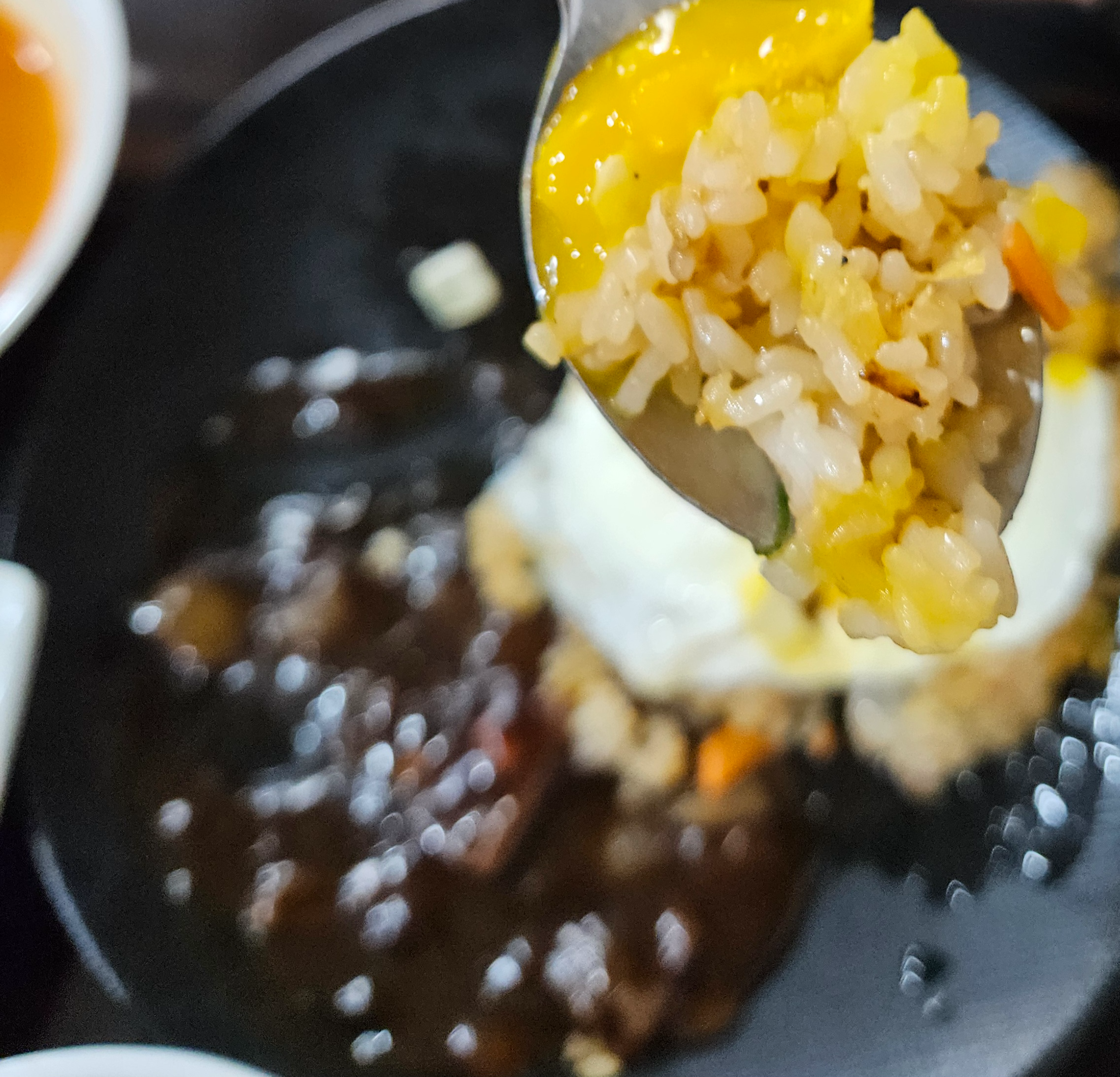 볶은밥과 계란 노른자 반숙 터뜨려 한 술 뜨고 짜장도 좀 떠서 같이 먹으면 맛있음. 먹다 느끼할 때 짬뽕국물 먹으면서 식사하다보면 한 그릇 뚝딱하나 봄 ㅎㅎ