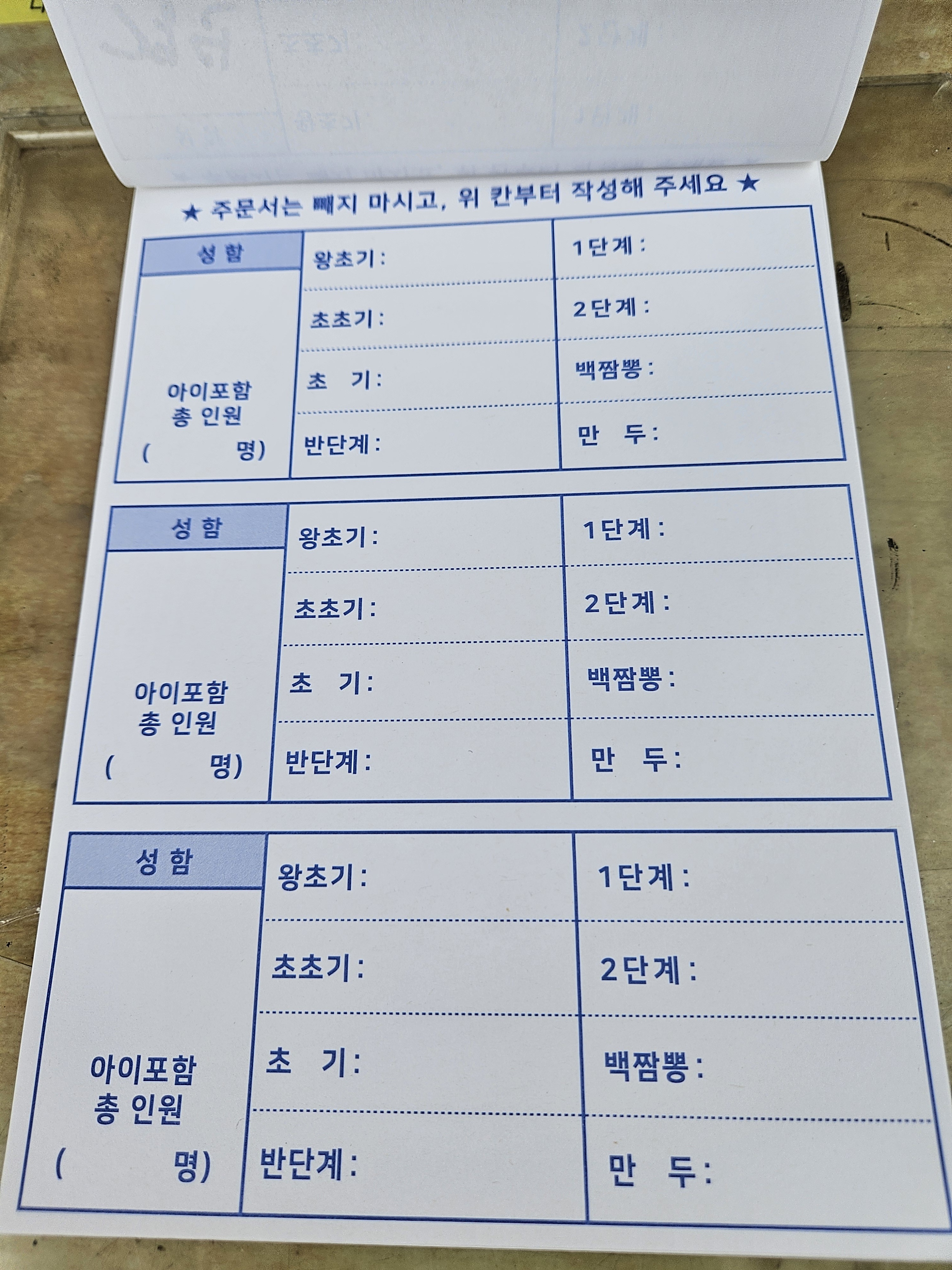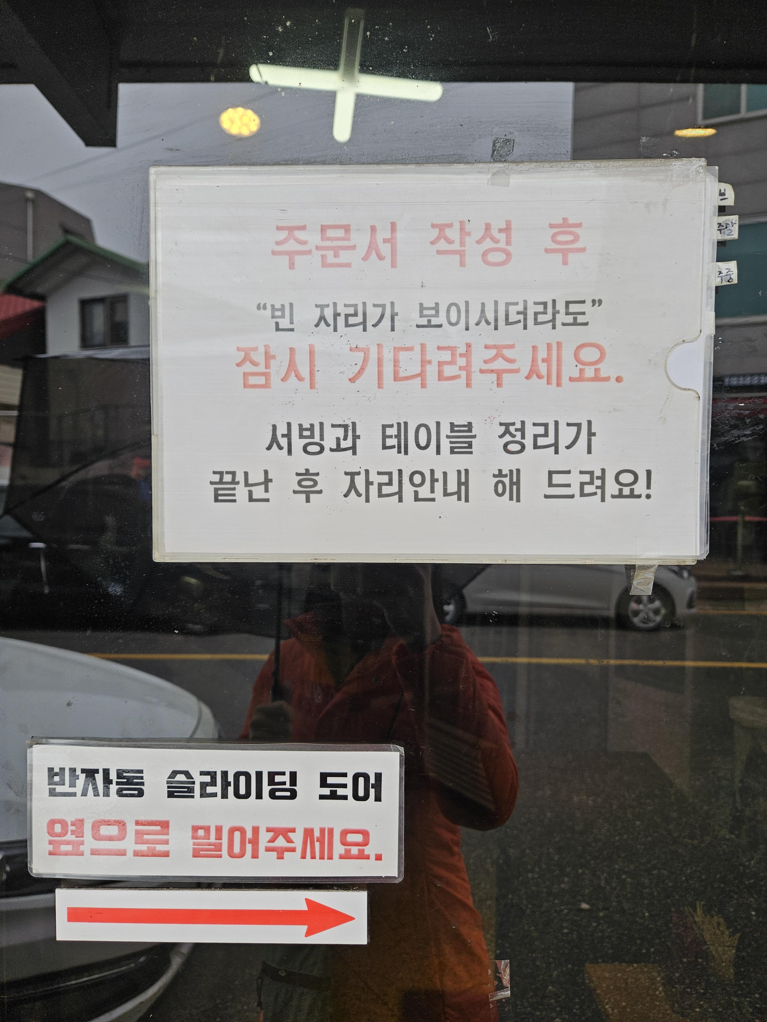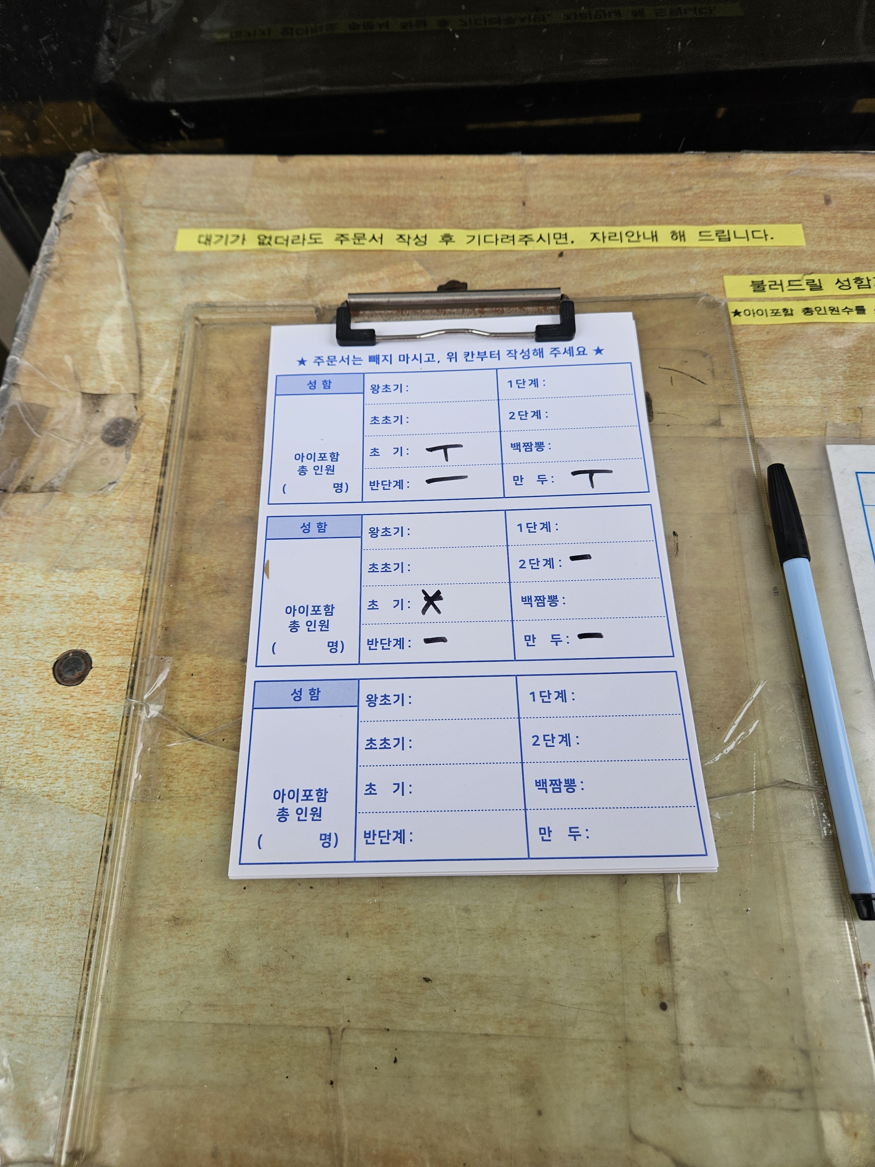 입구 오른쪽에 주문서가 놓여있는데 대기가 없어도 작성 후 기다리면 자리안내 해준다고 하더라.
