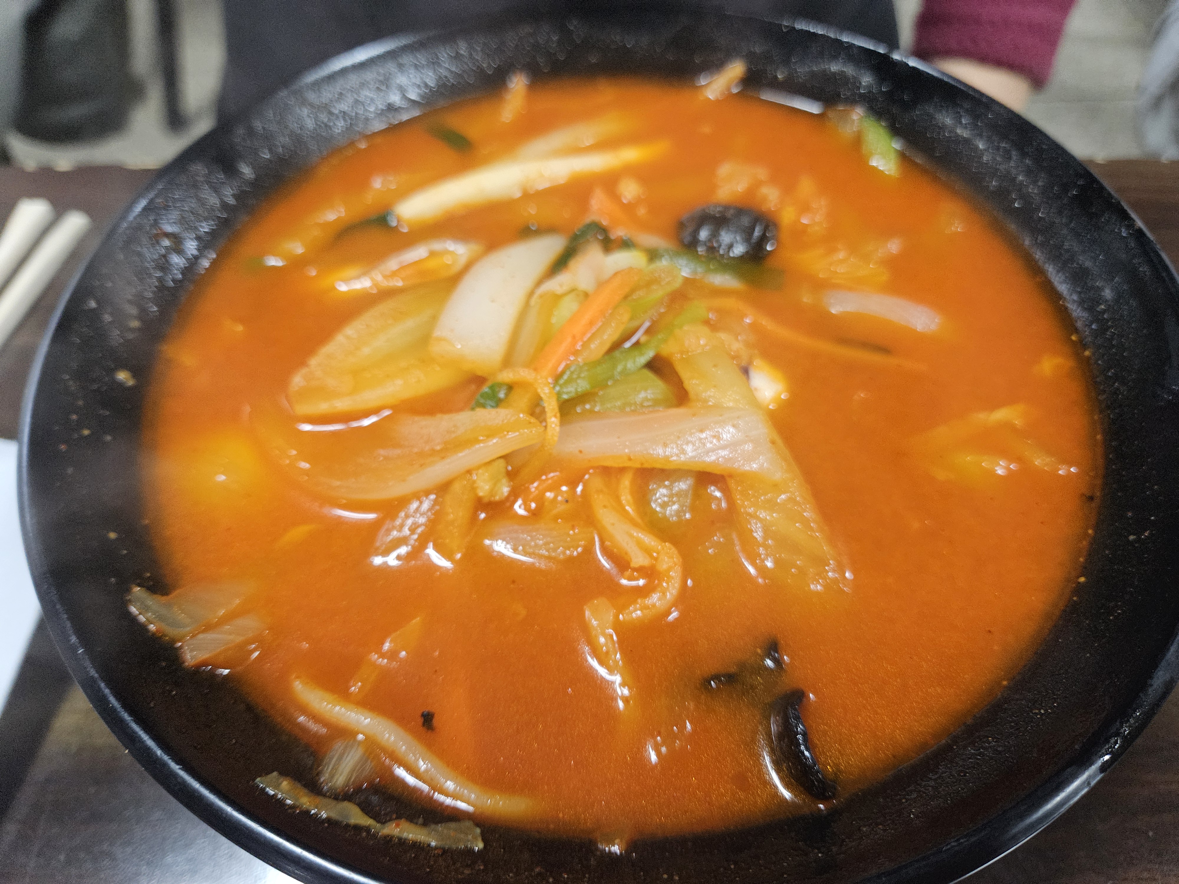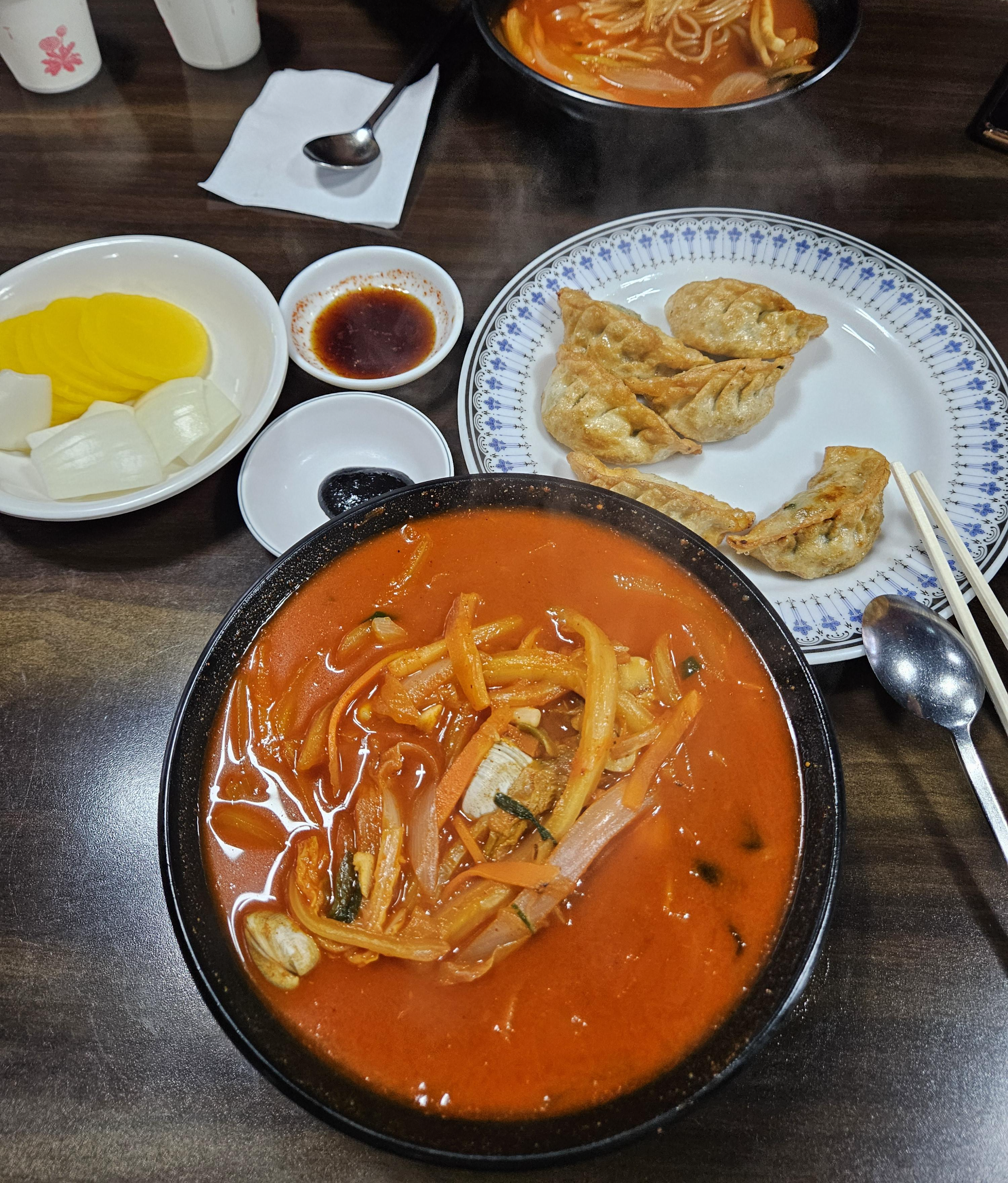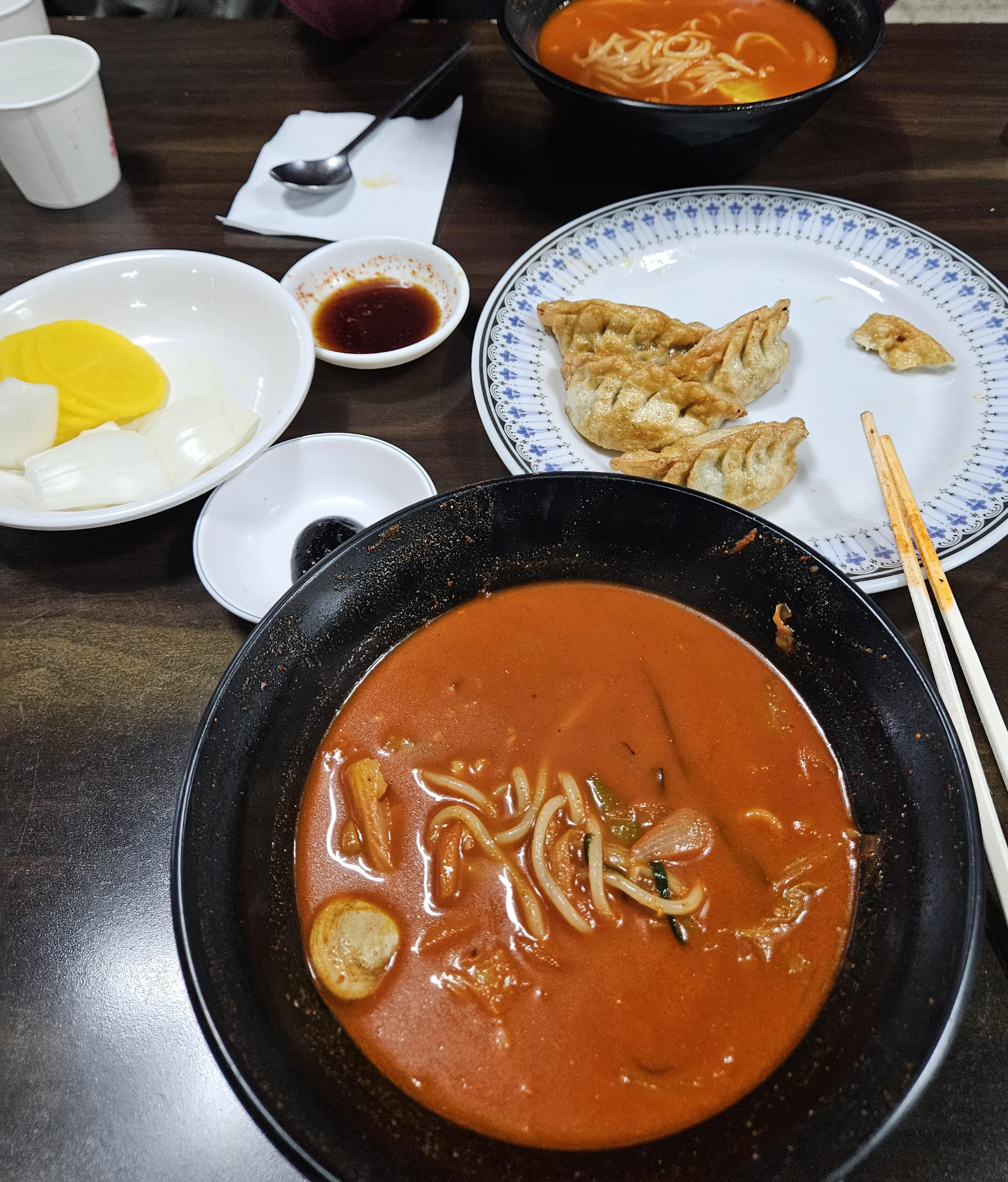 짬뽕은 채소(양파, 배추, 당근, 파, 버섯) 약간의 해물이 들어있었고 고기는 없었던 것 같음. 고기짬뽕은 아닌데 고춧가루 때문에 그 정도 농도는 나오는 듯.