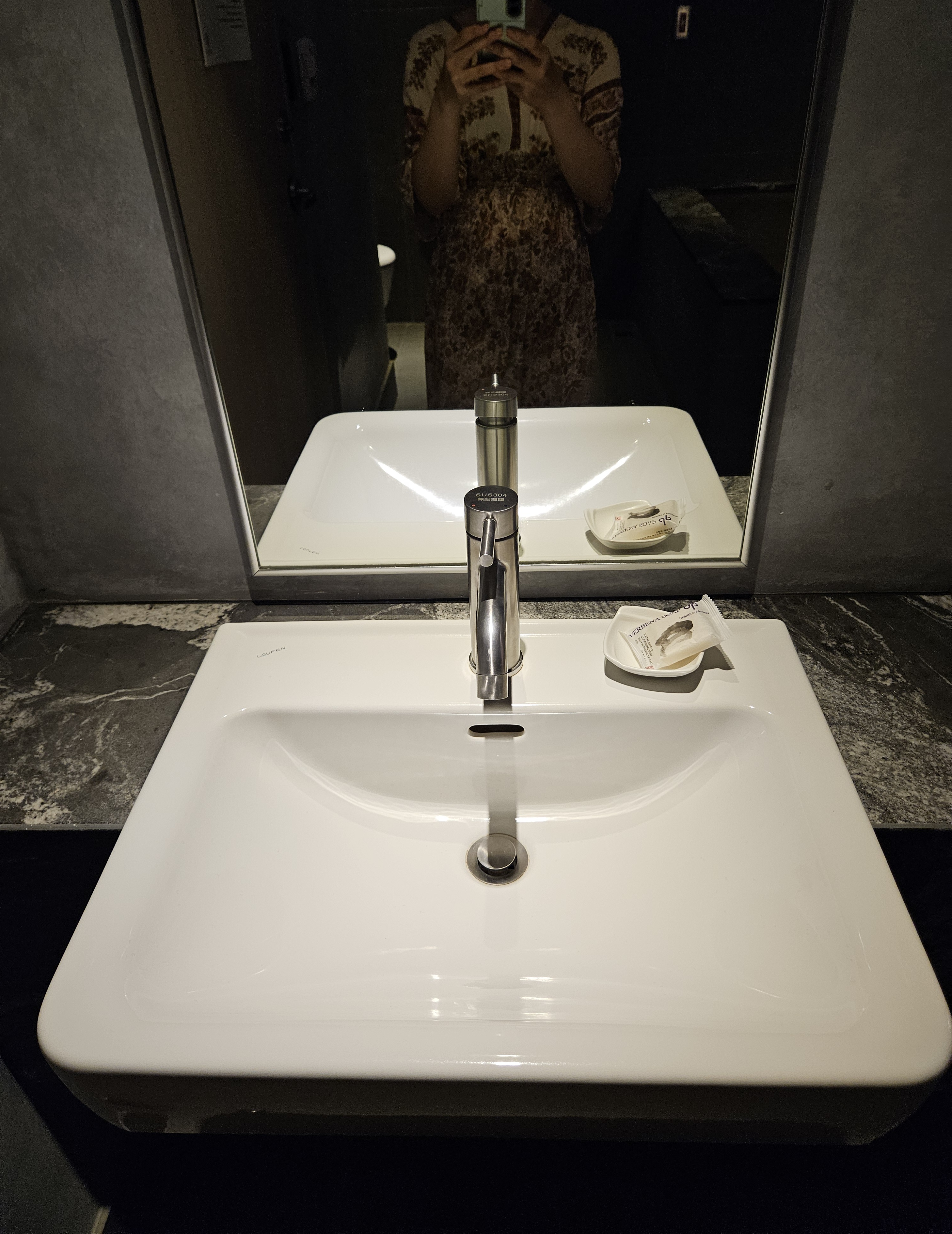 왼쪽에 거울이 있고, 비누, 어메니티, 물, 헤어드라이어가 비치되어 있었고 배스타월 2개가 준비되어 있다.