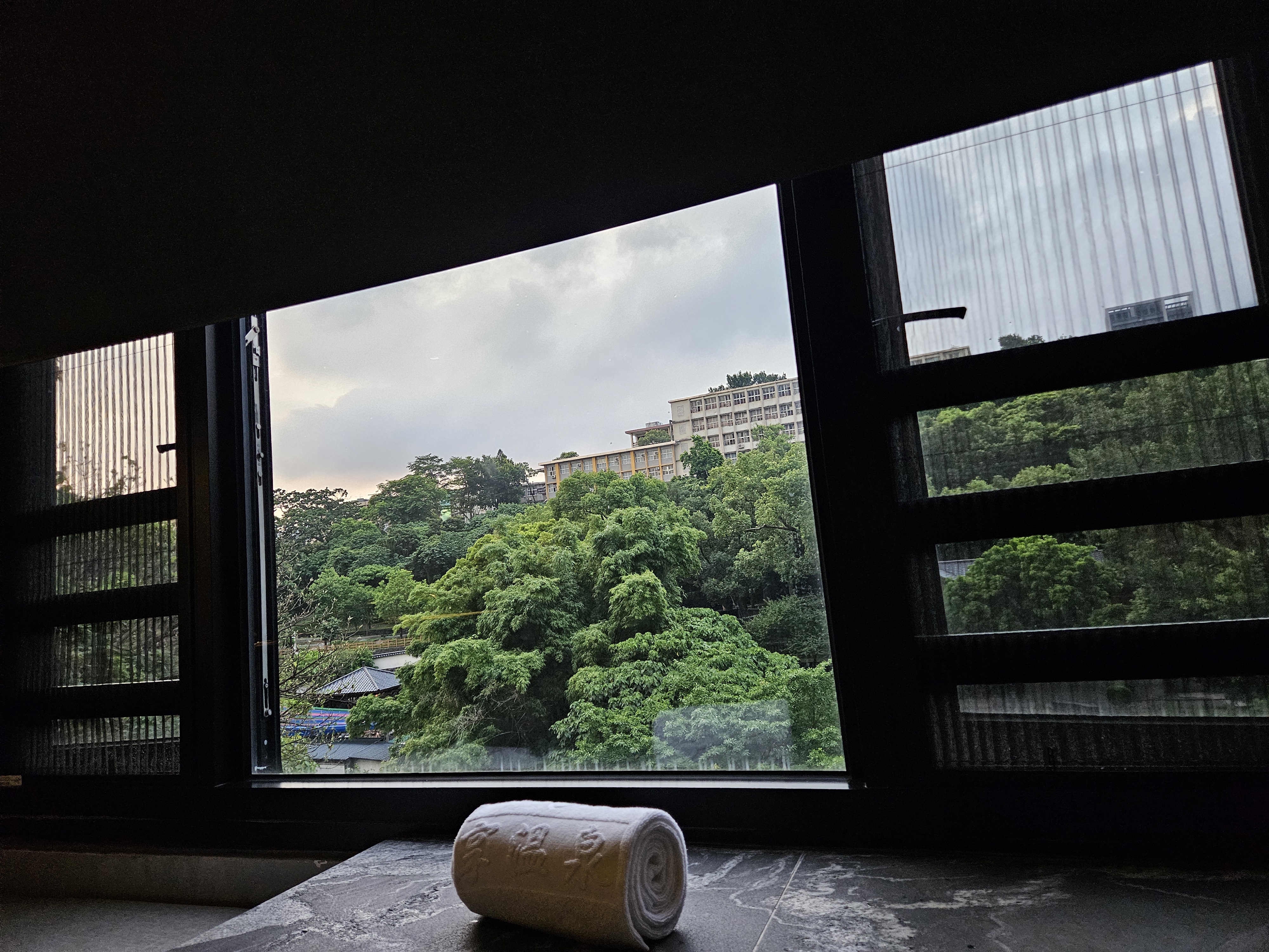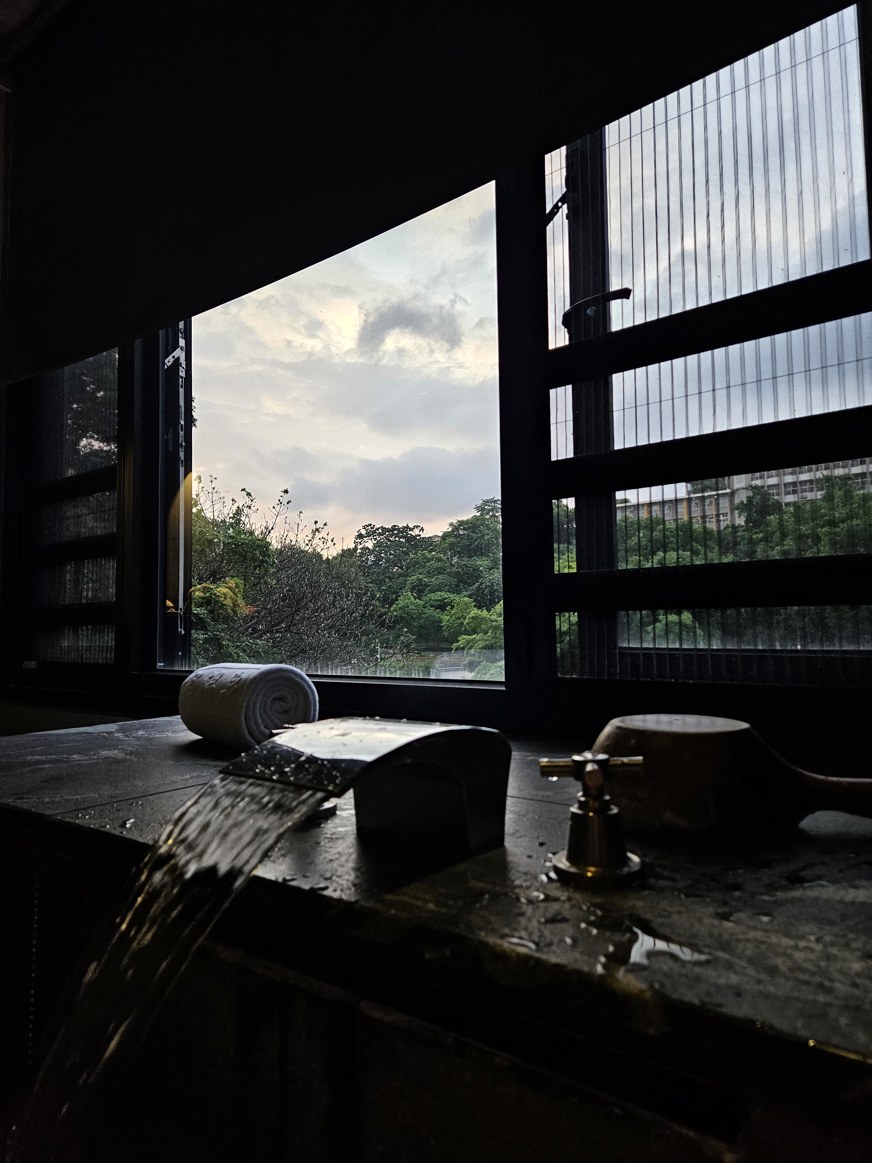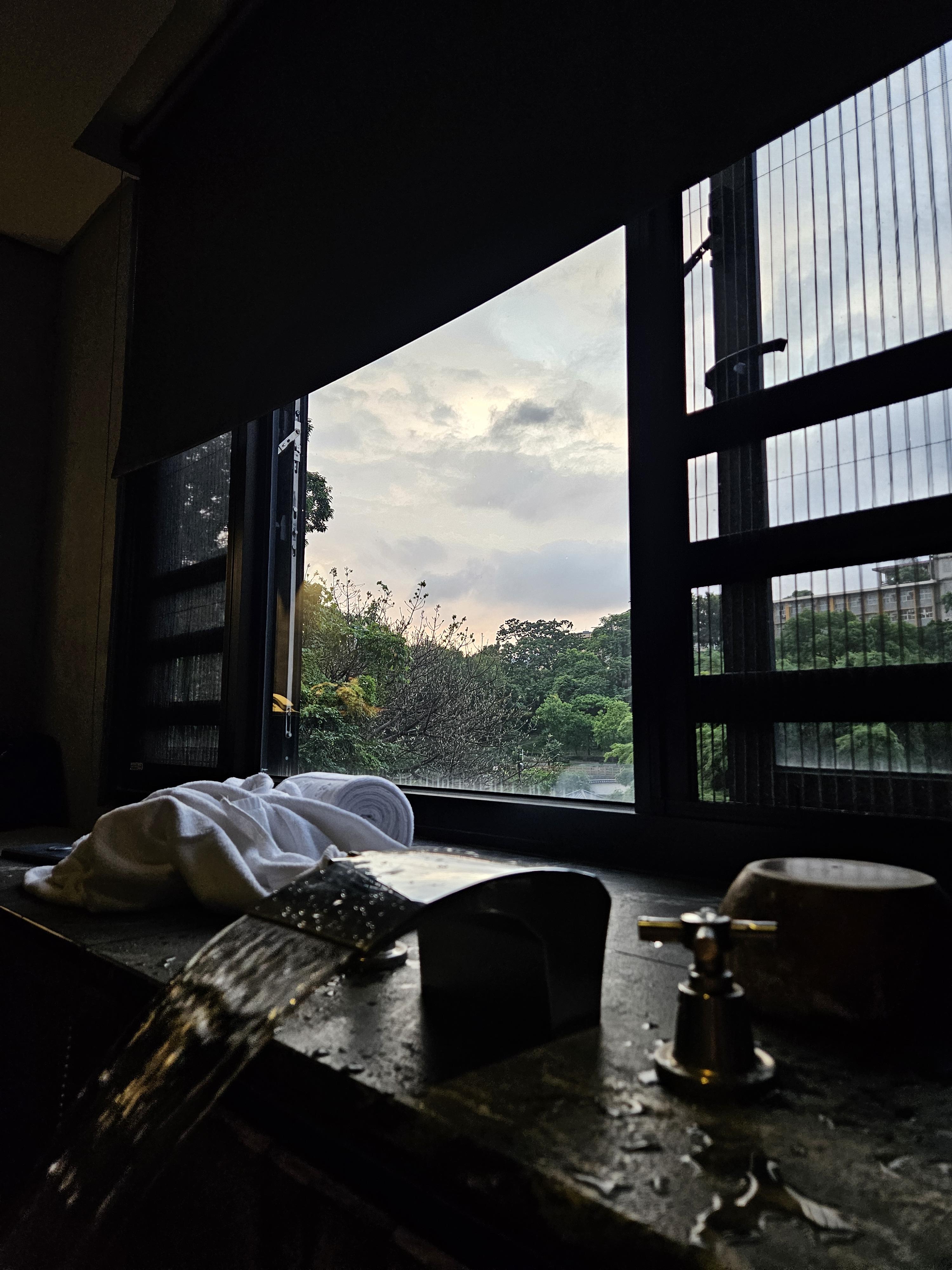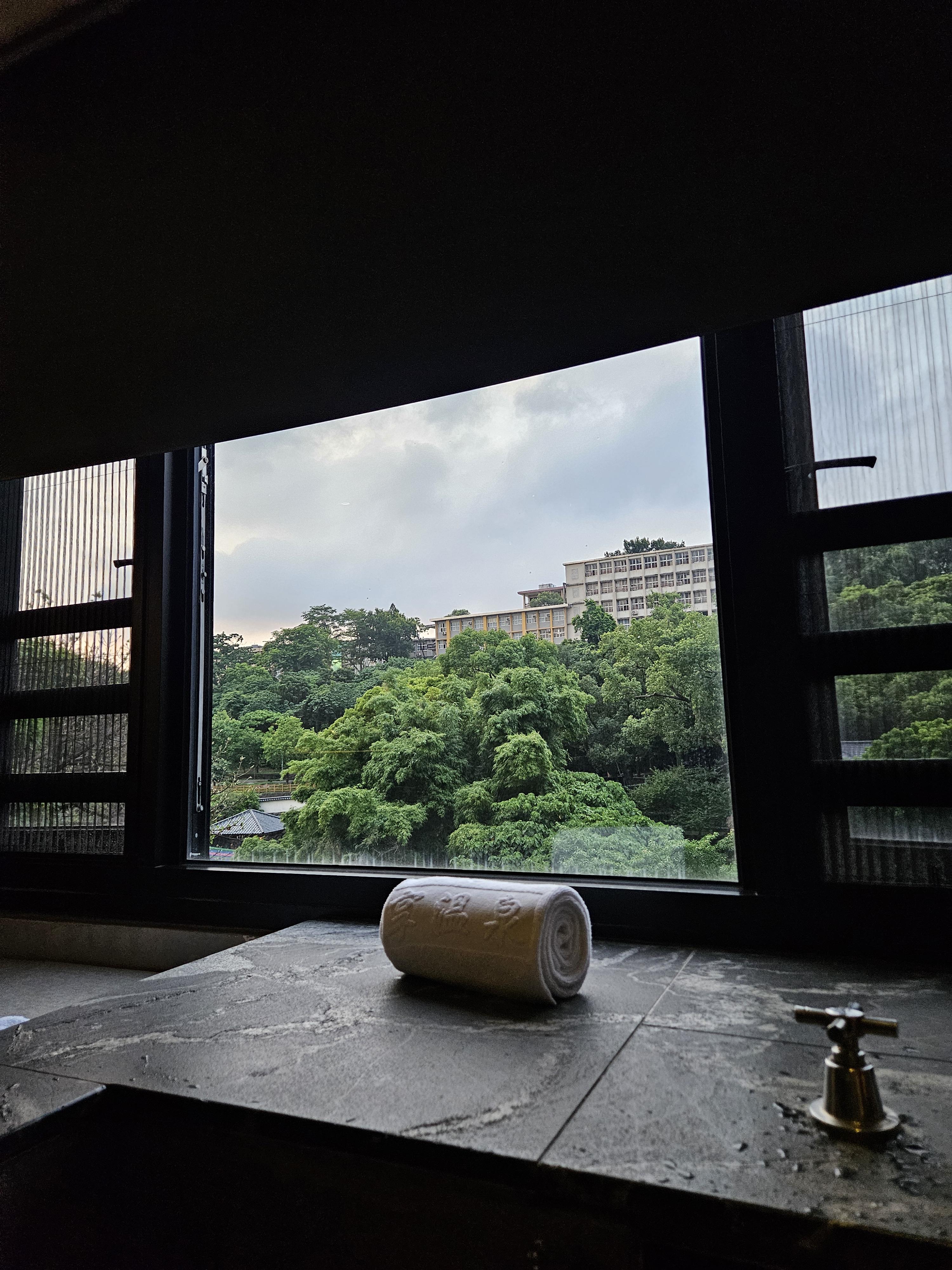 뜨거운 물에 계속 있으니 더워서 찬물 받아 냉수에 몸 담그고 있으니 시원해서 나오기 싫더라. 창 밖보니 건너편에 학교가 있는지 학교와 울창한 나무 뷰가 고즈넉한 풍경을 자아내서 절로 힐링되는 순간이었다.