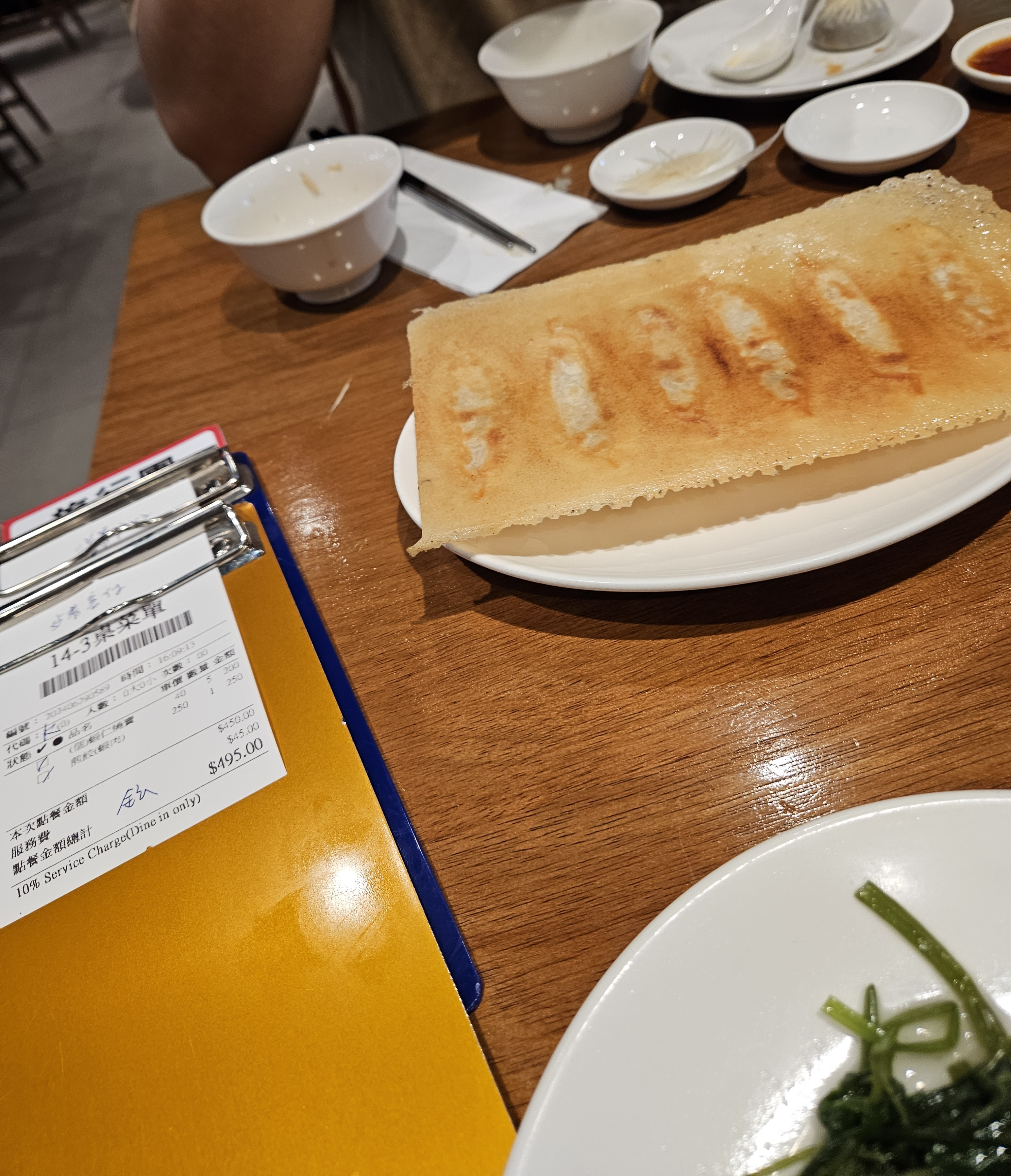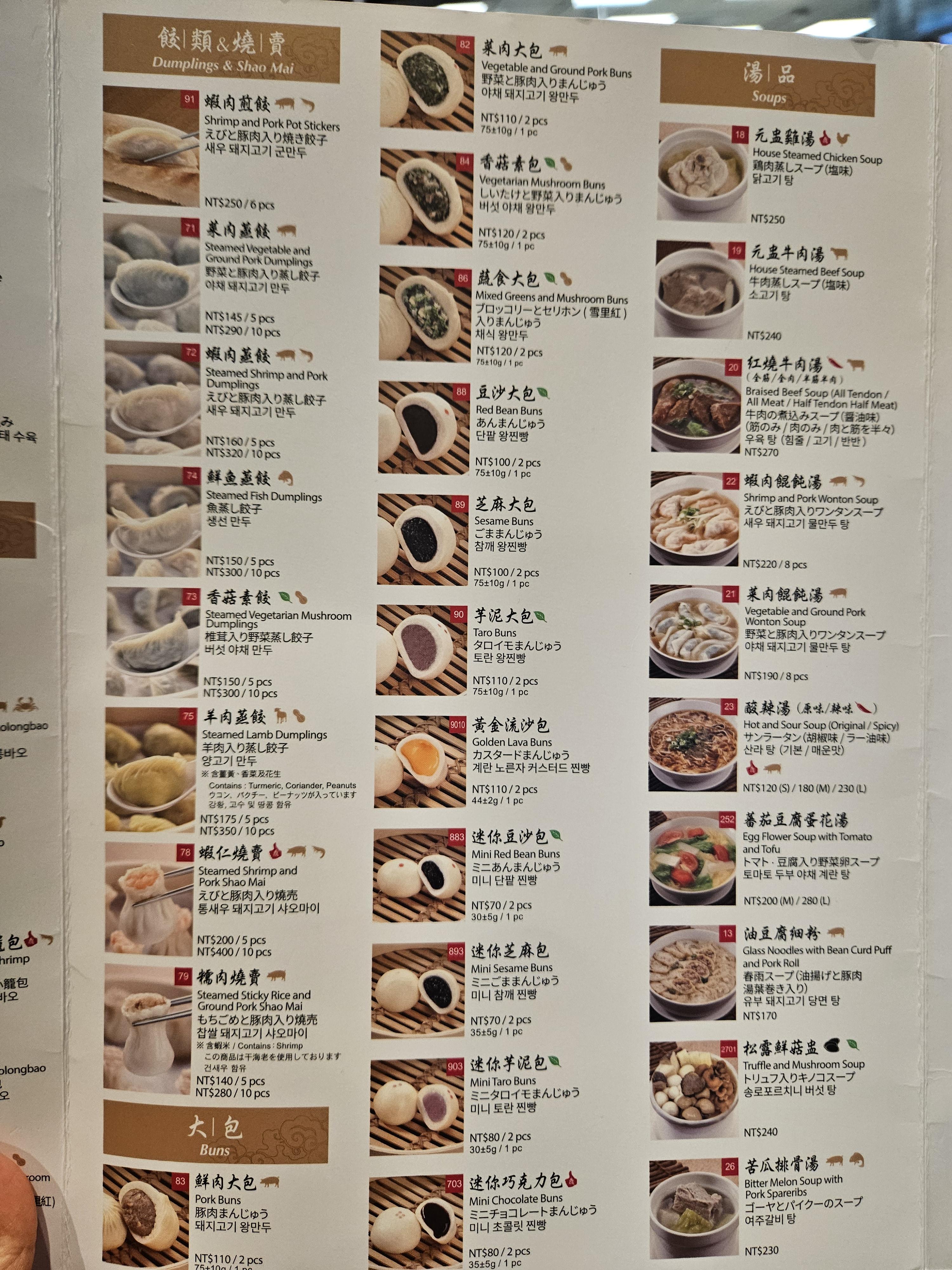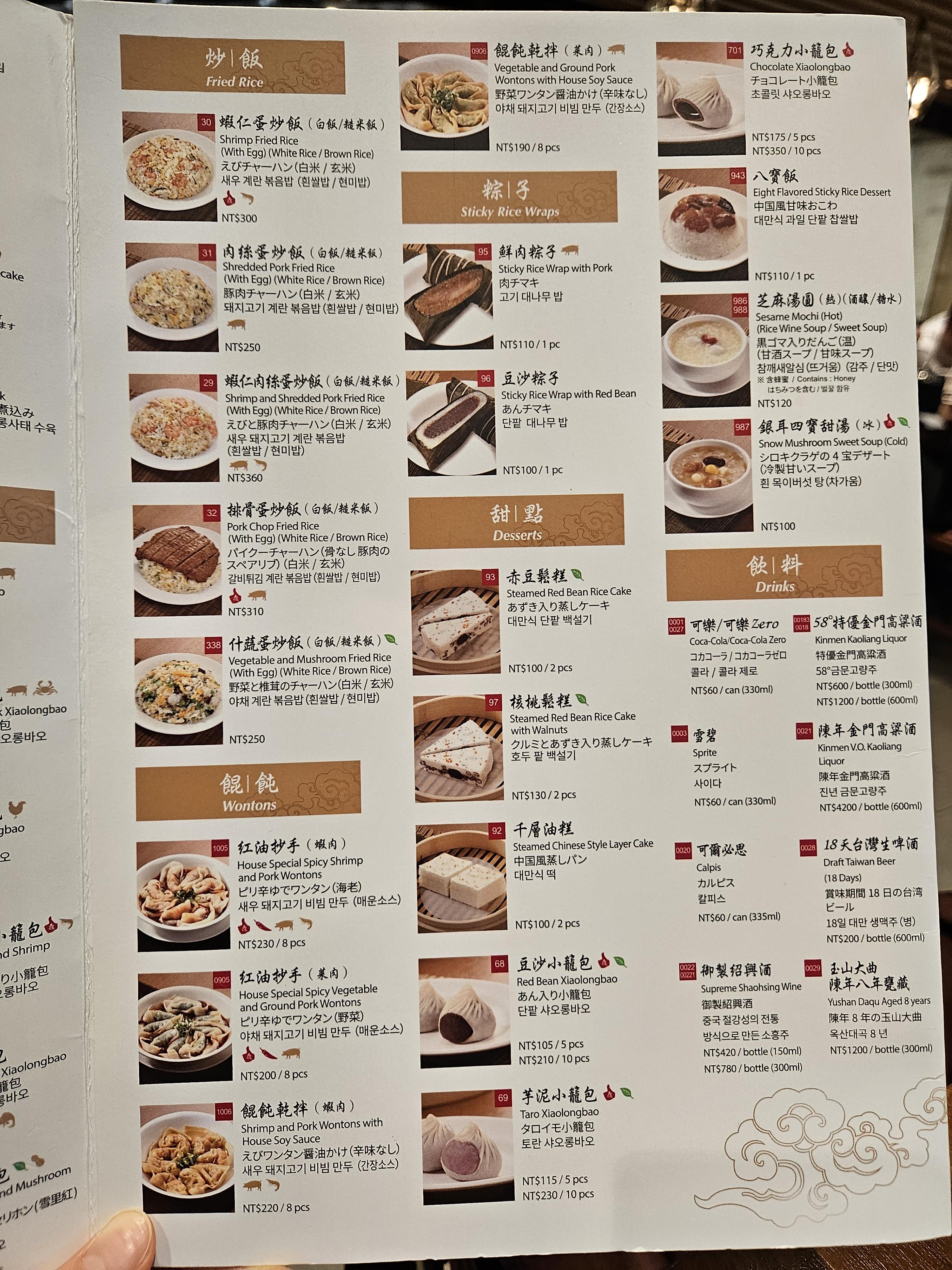 이렇게만 먹어도 배불렀지만 먹는 김에 통새우 돼지고기 샤오마이 5 pcs (NT$ 200), 군만두 6 pcs (NT$ 250) 추가 주문했다. 10% 부가세(NT$ 45) 별도라 추가금 NT$ 495 나가면서 카운터에서 계산함.