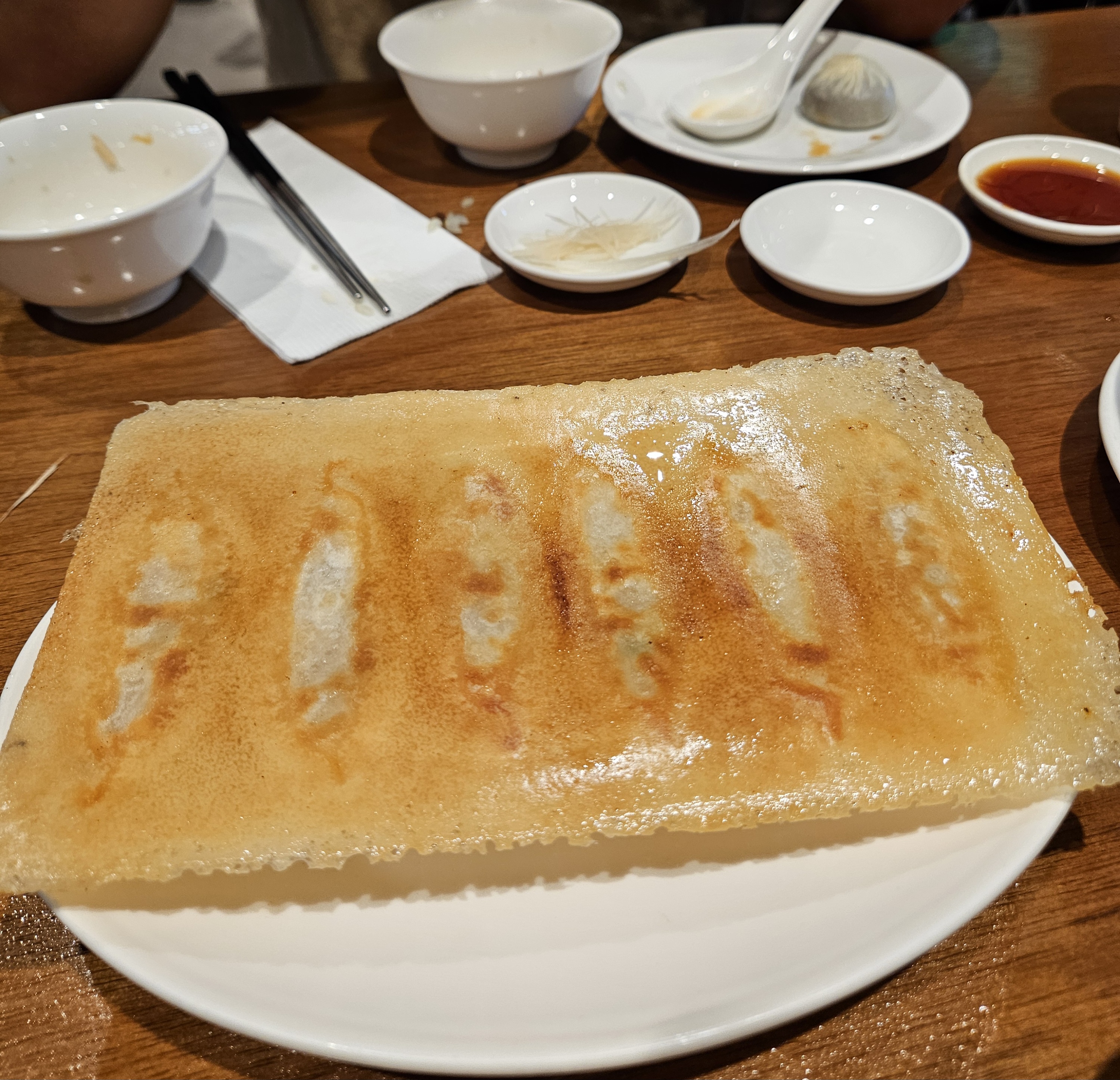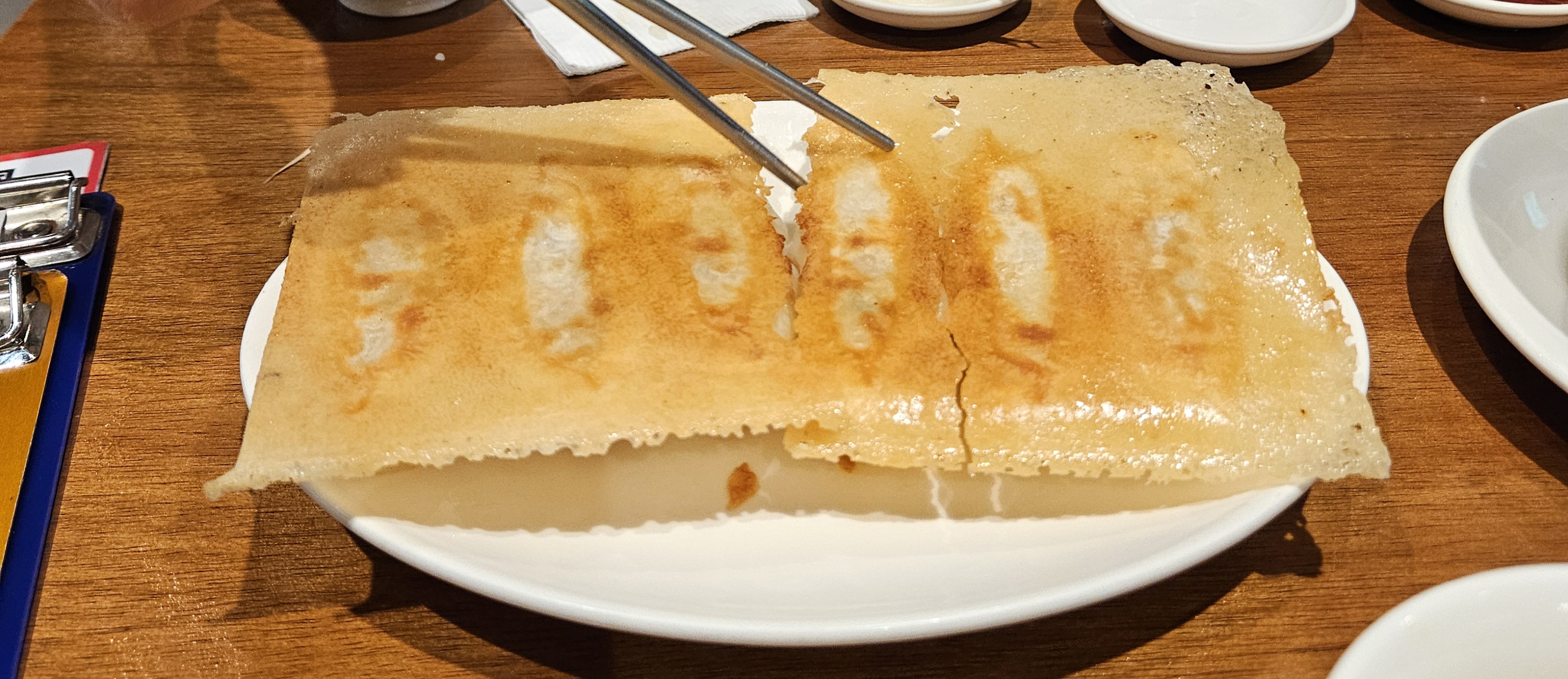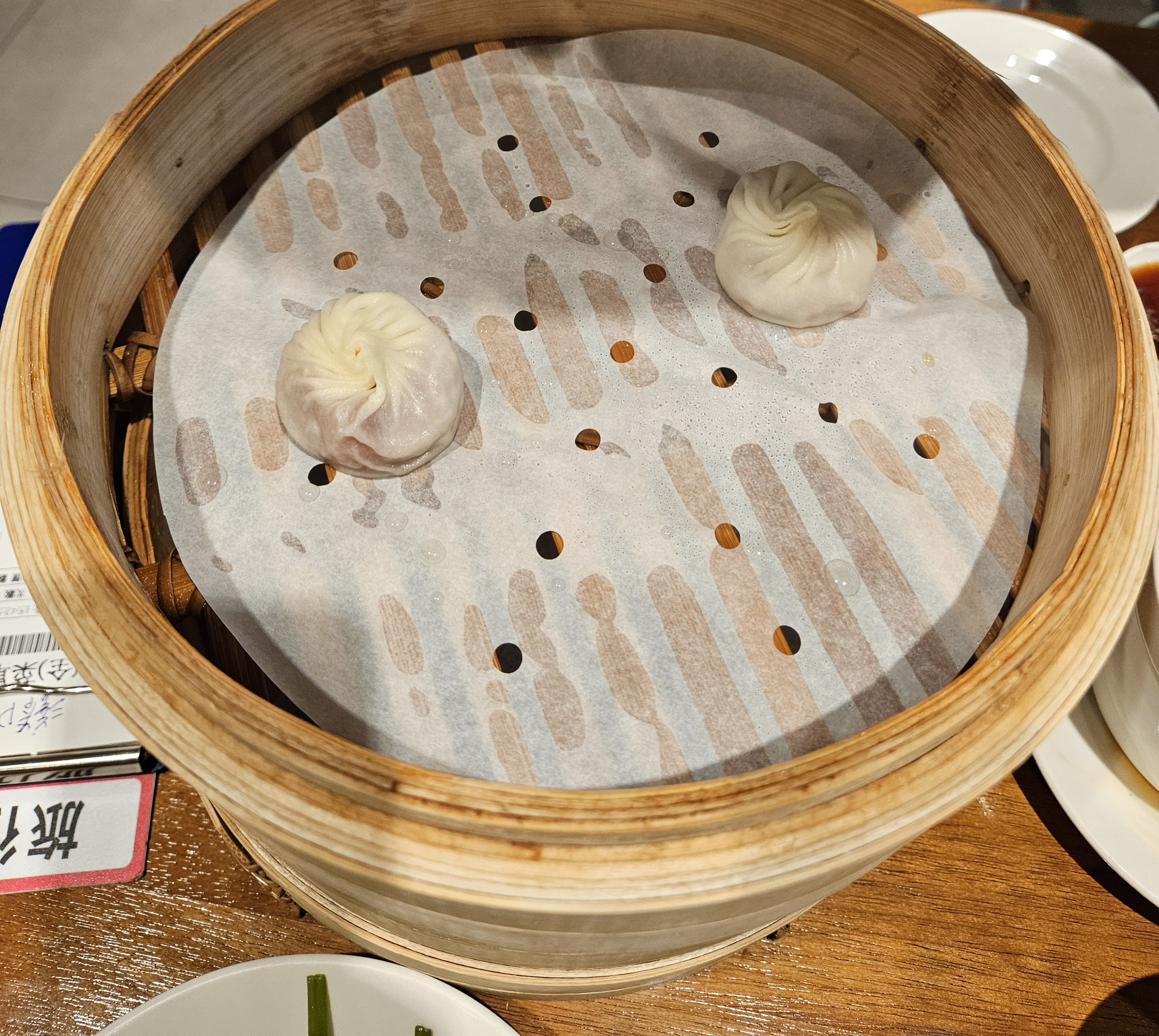이렇게만 먹어도 배불렀지만 먹는 김에 통새우 돼지고기 샤오마이 5 pcs (NT$ 200), 군만두 6 pcs (NT$ 250) 추가 주문했다. 10% 부가세(NT$ 45) 별도라 추가금 NT$ 495 나가면서 카운터에서 계산함.