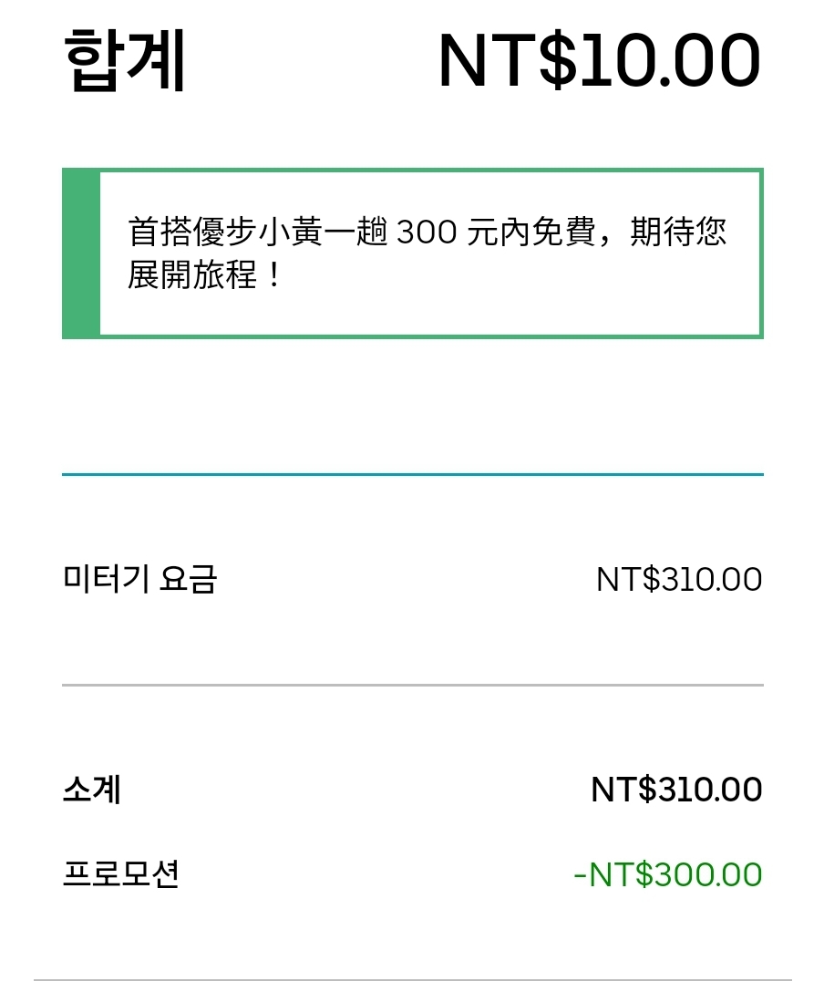 대만 도착 후 시먼딩에 체크인하고 비가 와서 택시로 타이베이 101까지 왔는데 미터 요금은 310 TWD, 우버 프로모션 혜택 받아 300 TWD 차감돼서 10 TWD만 추가결제했다.