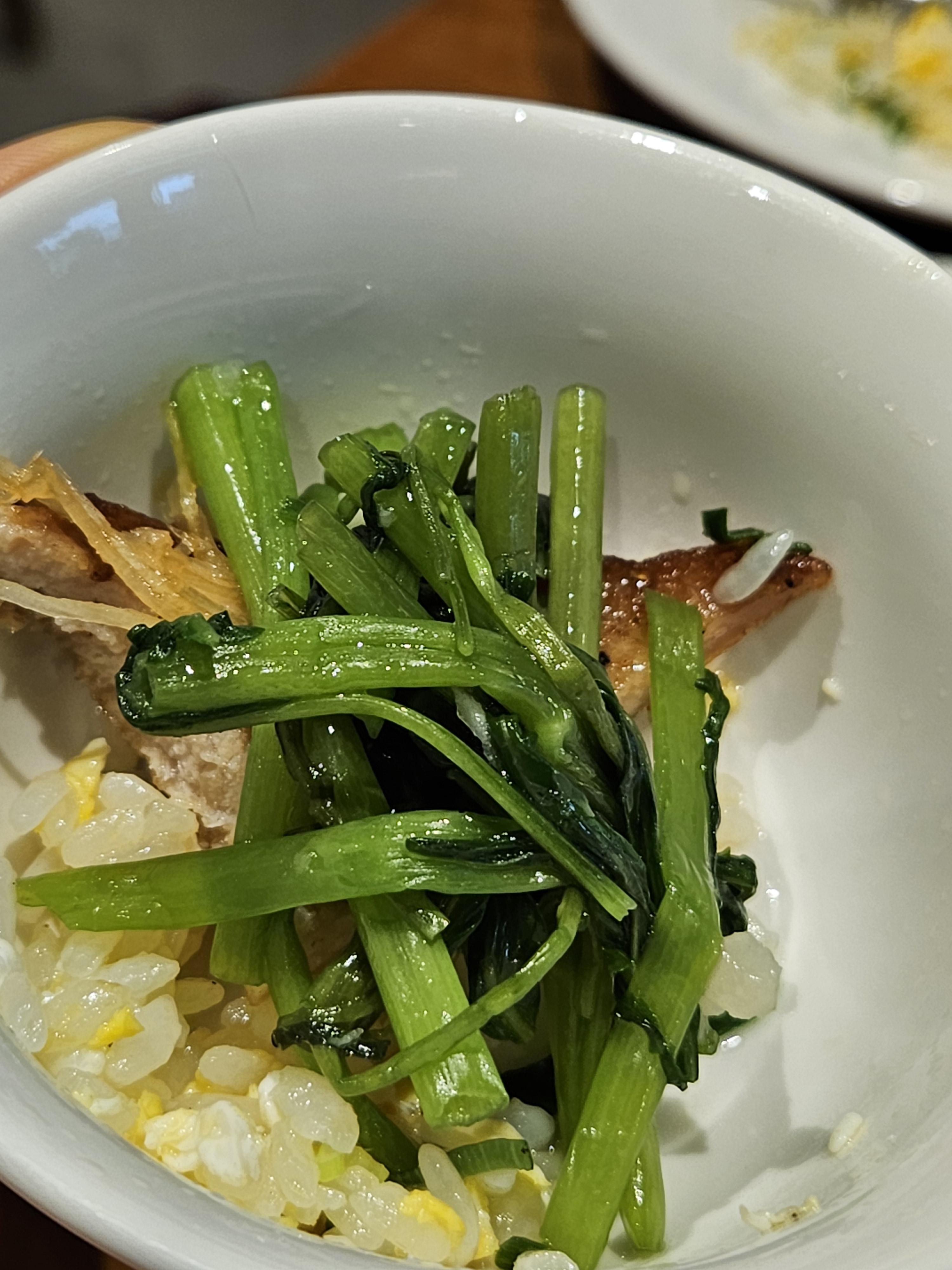 아삭한 공심채볶음에 두툼한 돼지고기, 계란볶음밥 같이 먹으면 꿀맛. 느끼할 때 생강채도 곁들여 먹으면 개운하다. 생강 좋아해서 테이블에 무한으로 먹을 수 있게 비치해 두면 좋겠음. 많이 먹는데 계속 달라하니 귀찮더라.