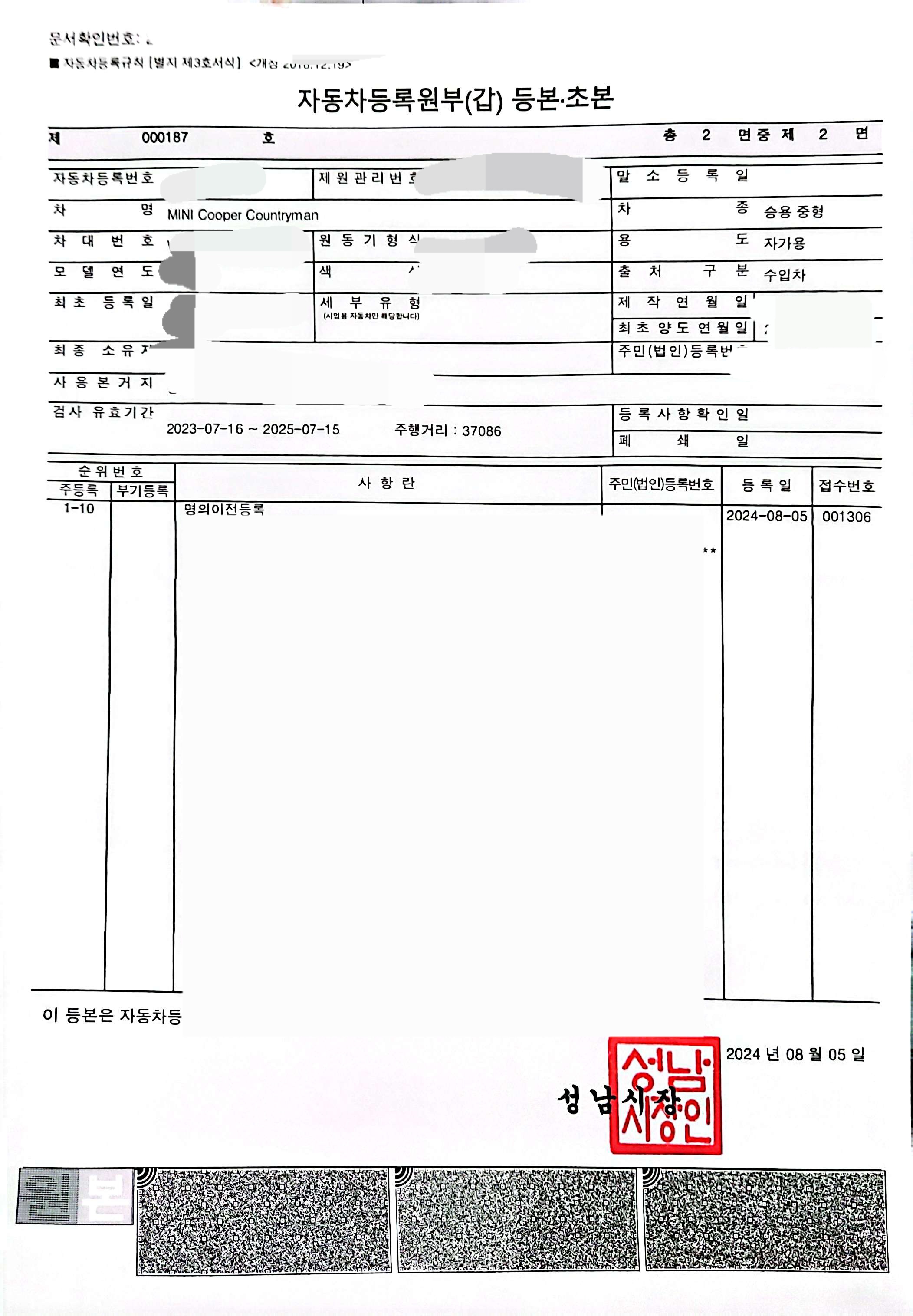자동차 등록증 년 월 일이 밀려 인쇄됐지만 자동차등록원부 등,초반에 명의이전 등록일이 금일 날짜로 잘 신고되어 있어 자동차등록증은 재발부 받지 않을 생각.