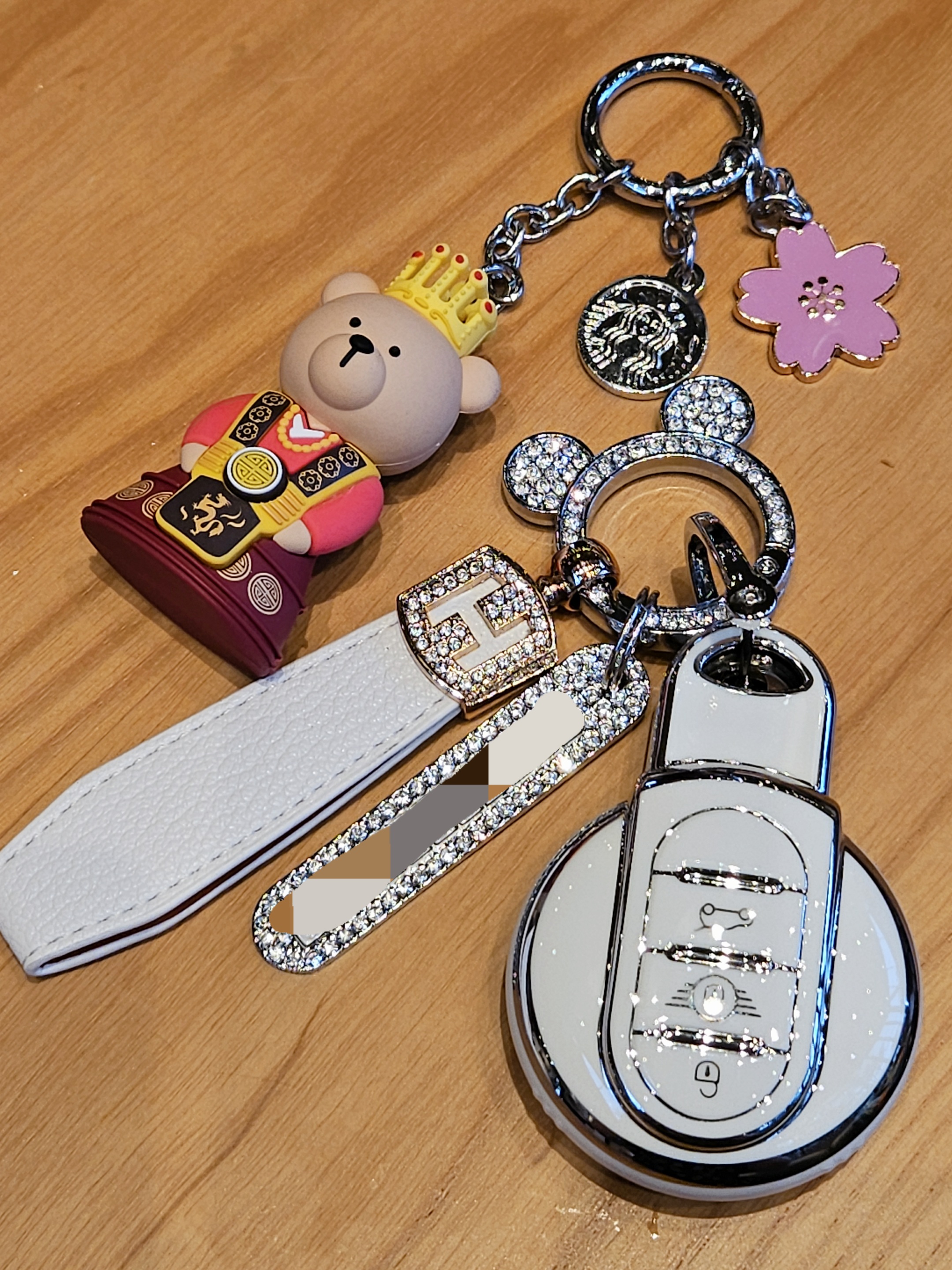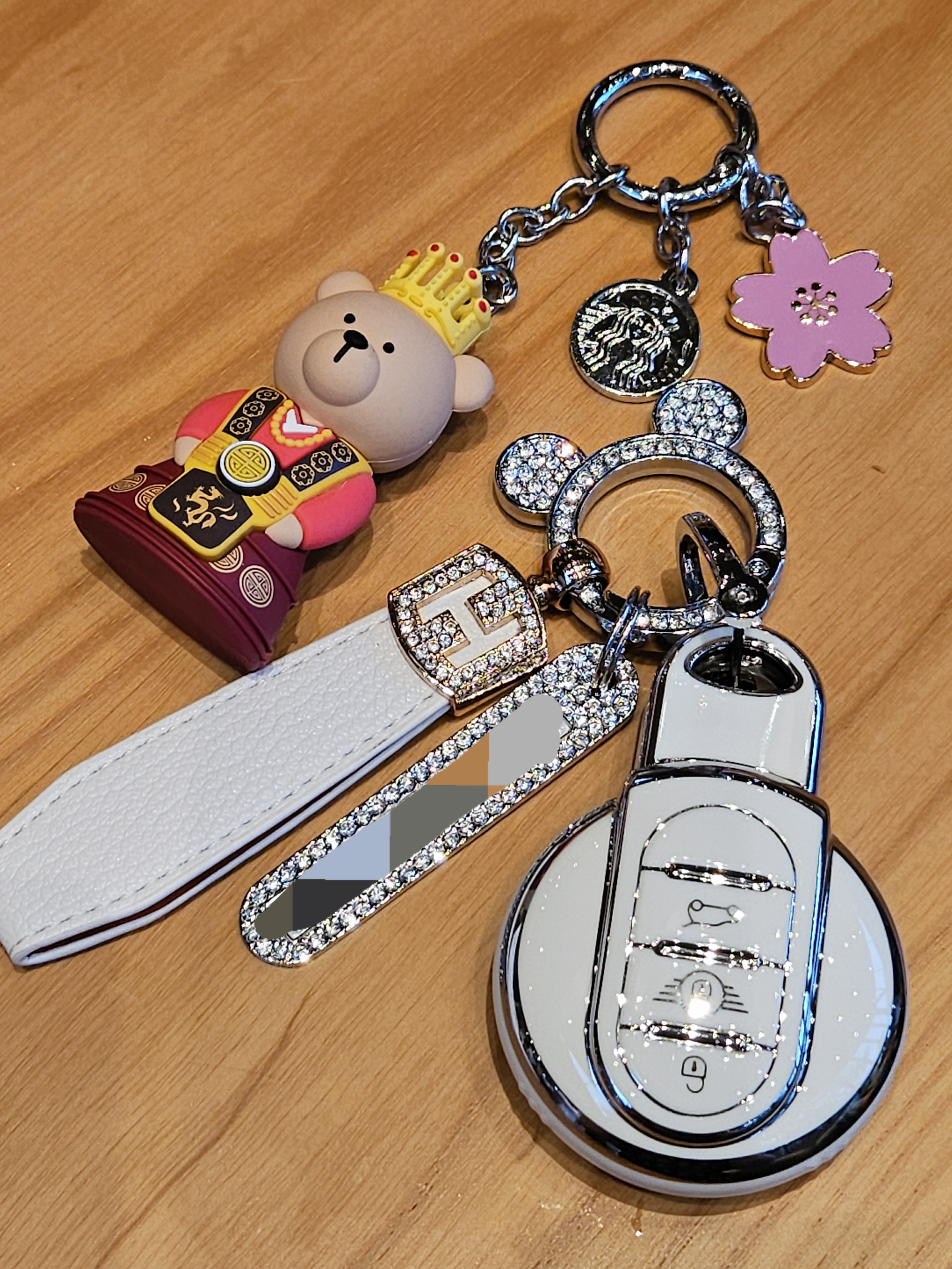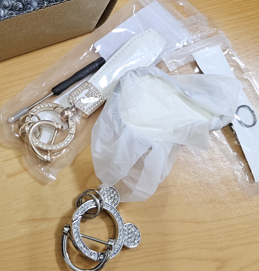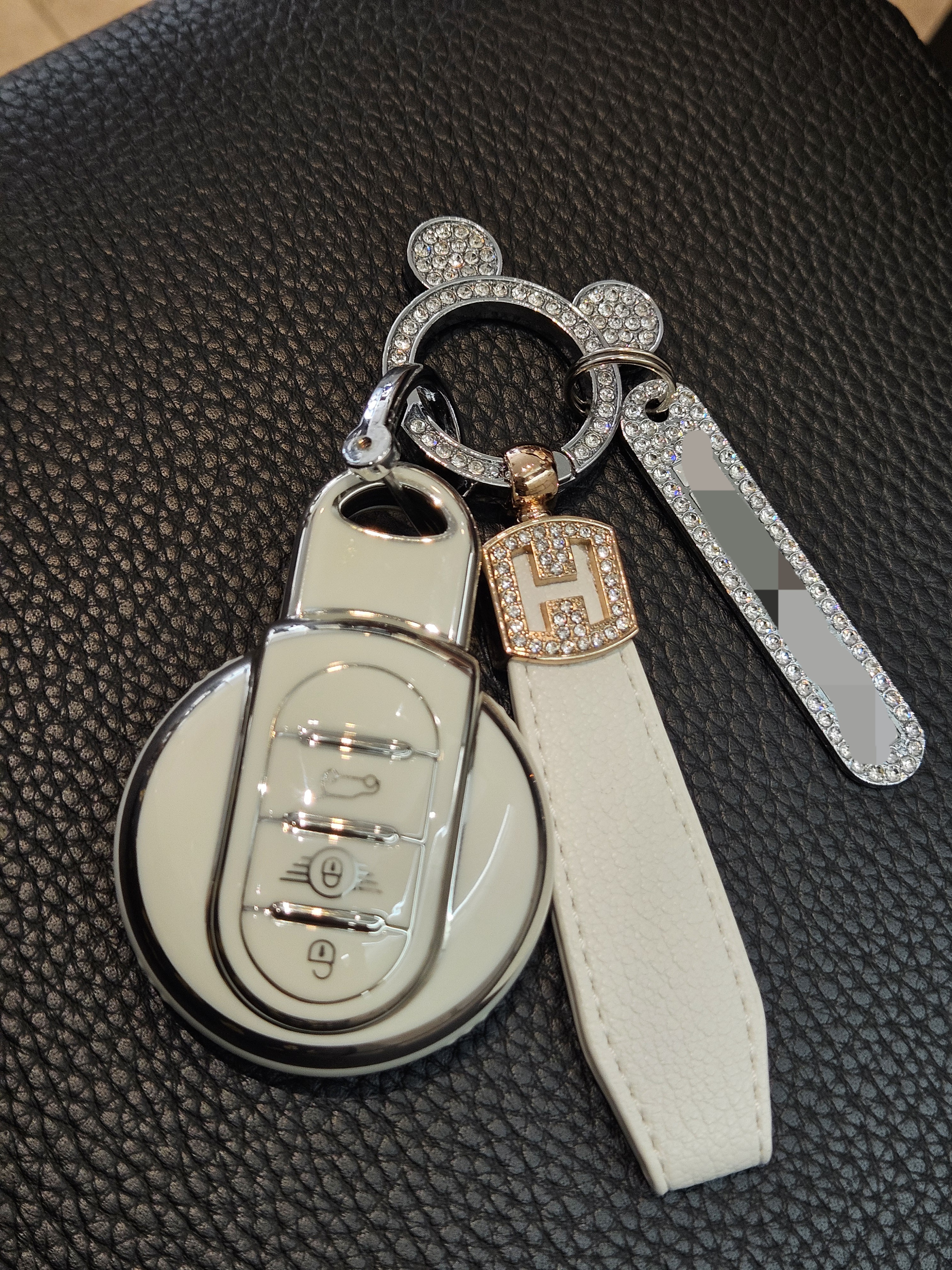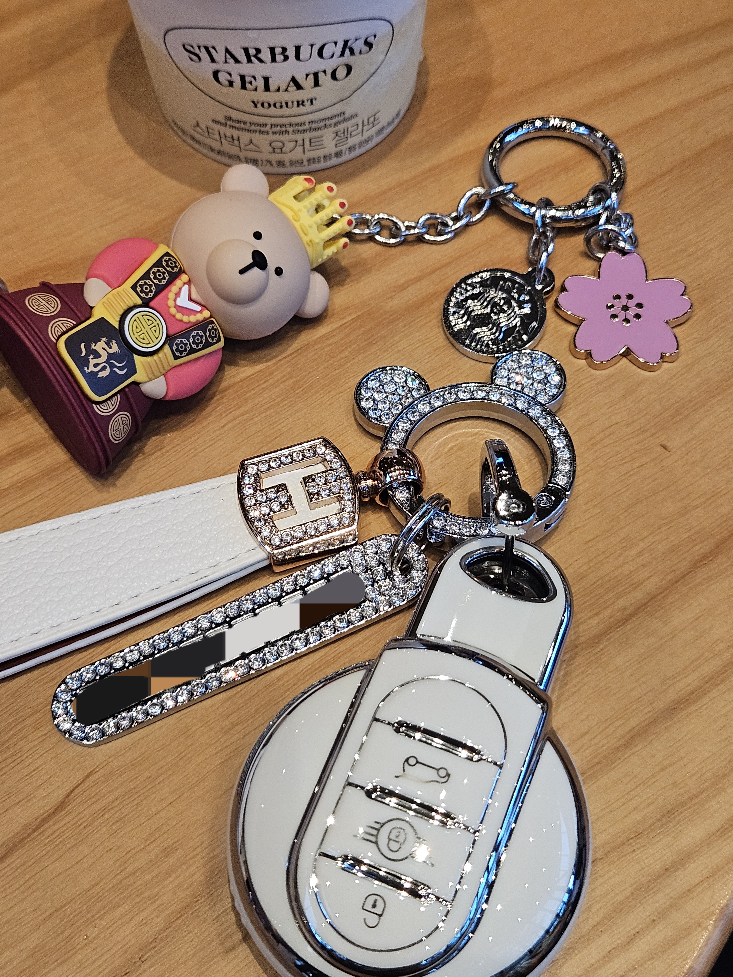너무 저렴해 보이지 않고 색상도 밝은데 큐빅도 박혀있어 화려하니 좋네? 미키마우스 키링에 분실 대비를 의한 전화번호까지 붙이고, 손잡이로 쓸만한 줄까지 주렁주렁 달아서 좀 무겁긴 하지만 ㅋㅋ 미니쿠퍼 주인 부심 생기는 비주얼 🤭
