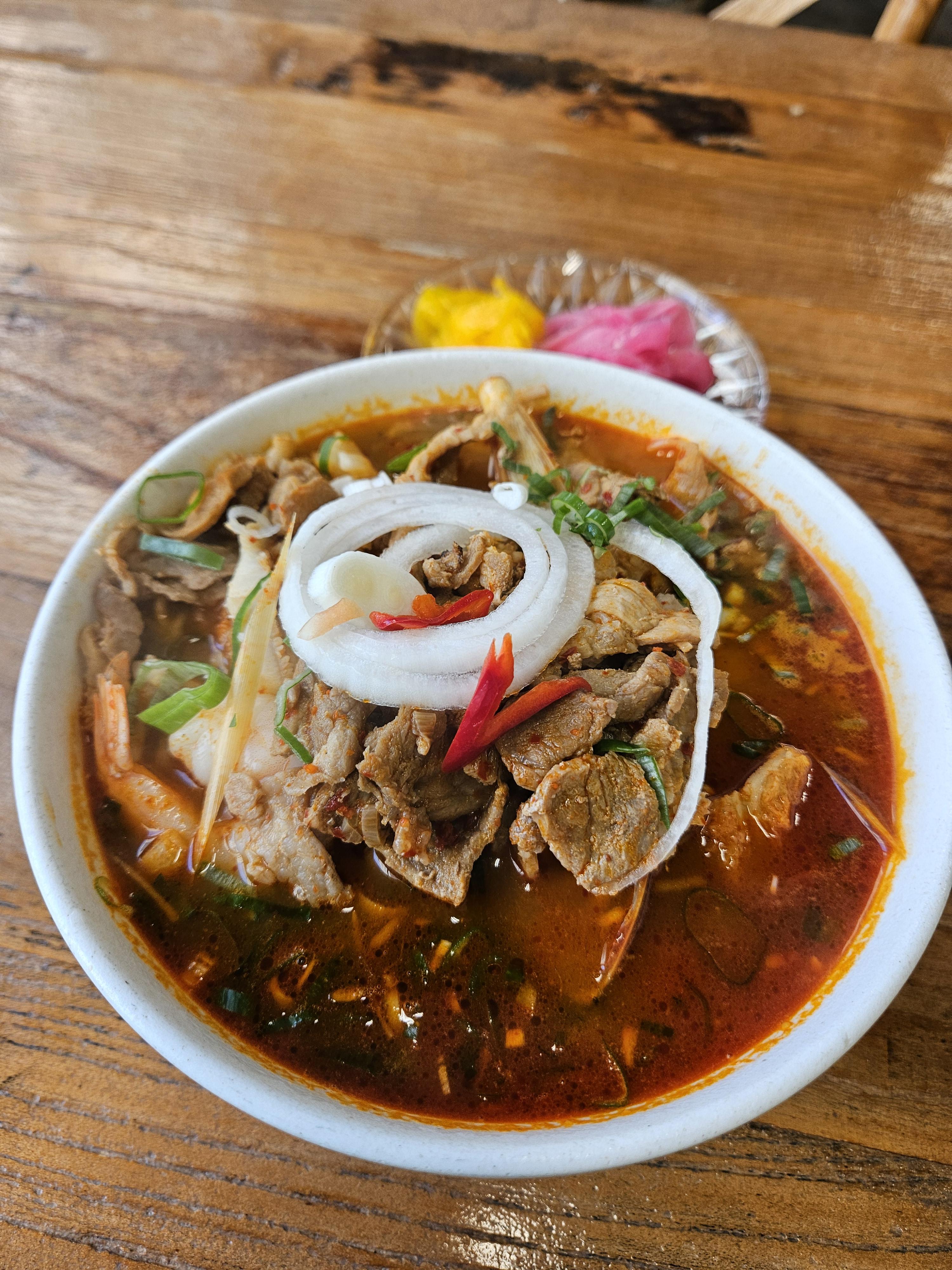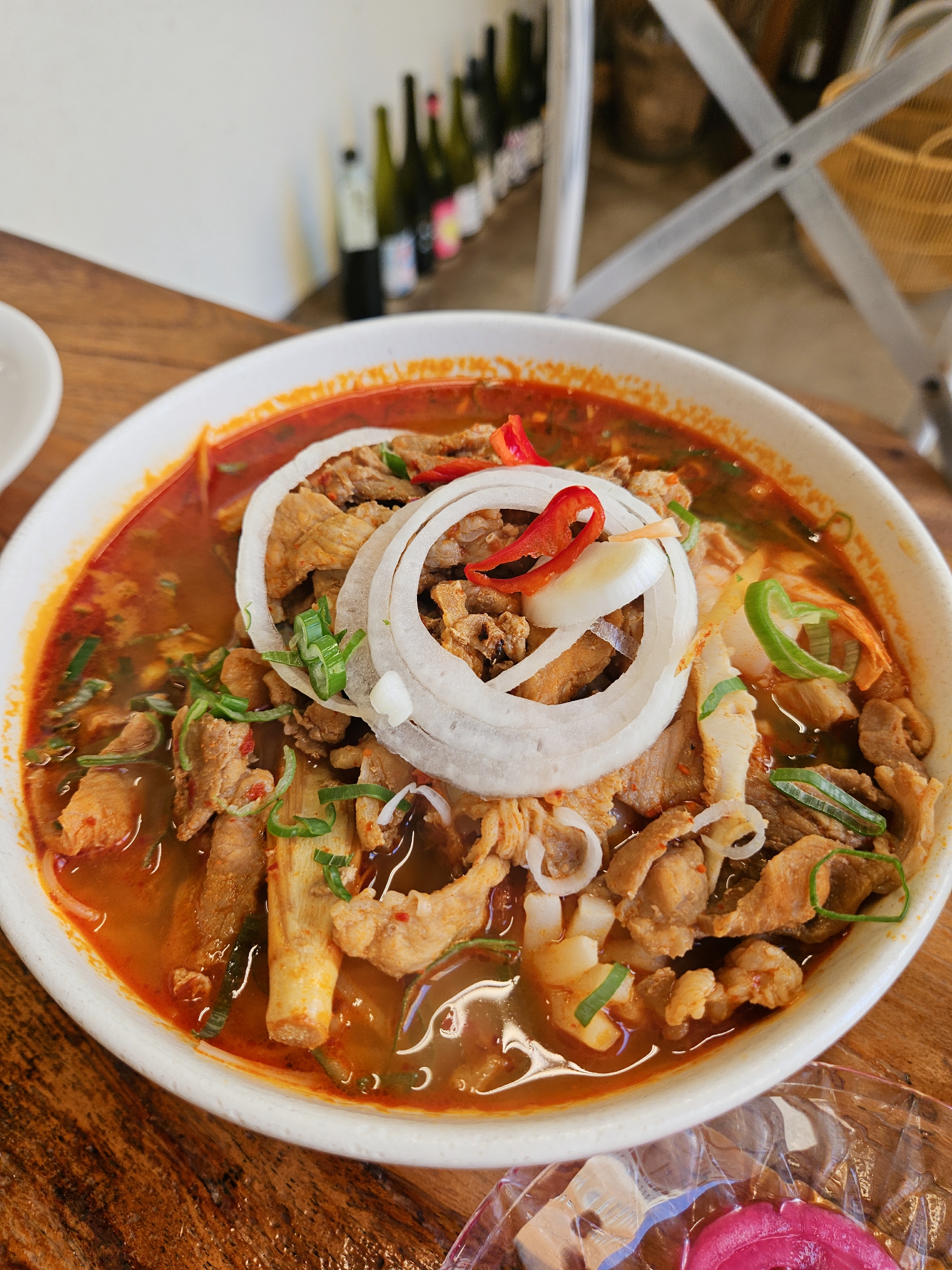 테이블에 쓰리라차, 해선장 소스 비치되어 있고 기본 찬은 유자에 절인? 얇은 단무지, 비트물에 절인 양파 피클이 제공되며 매운 고추와 고수 필요시 직원한테 요청하면 돼서 팍팍 넣고 먹는 스타일이라 요청드림. 매운 쌀국수도 더 맵게 해달라고 했지만 ㅋㅋ 이렇게 말해도 늘 매운맛이 고픈 자 🌶