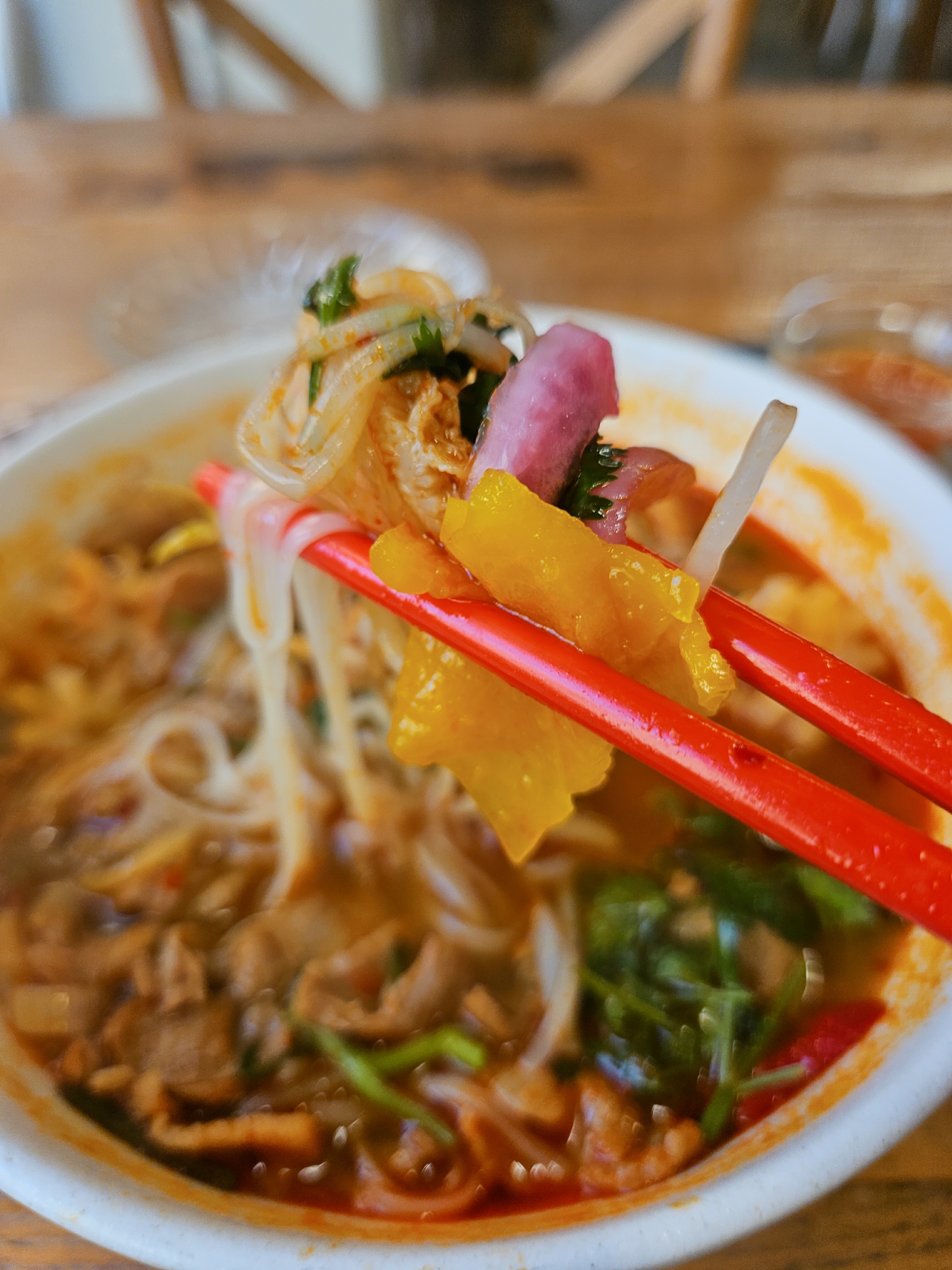 기본도 칼칼하지만 더 맵게 요청하니 입에선 더 매워도 되겠다 싶지만 땀샘은 폭발했다. 레몬 그라스, 파, 양파, 땡초, 숙주 가득 들어있고 쌀국수 면은 적당히 익어서 고기랑 채소 곁들여 먹으면 현지보다 더 맛있는 쌀국수를 맛볼 수 있음.