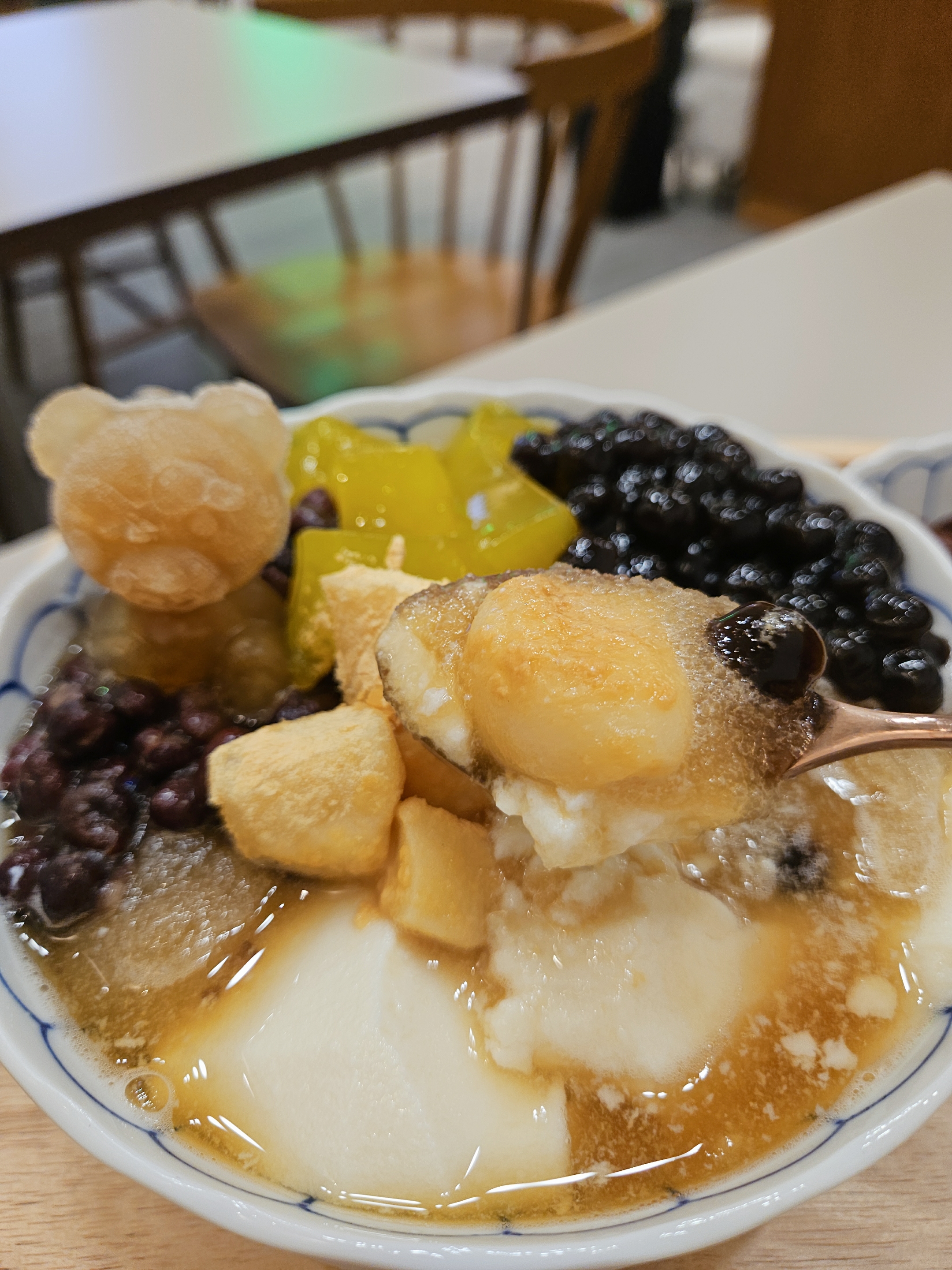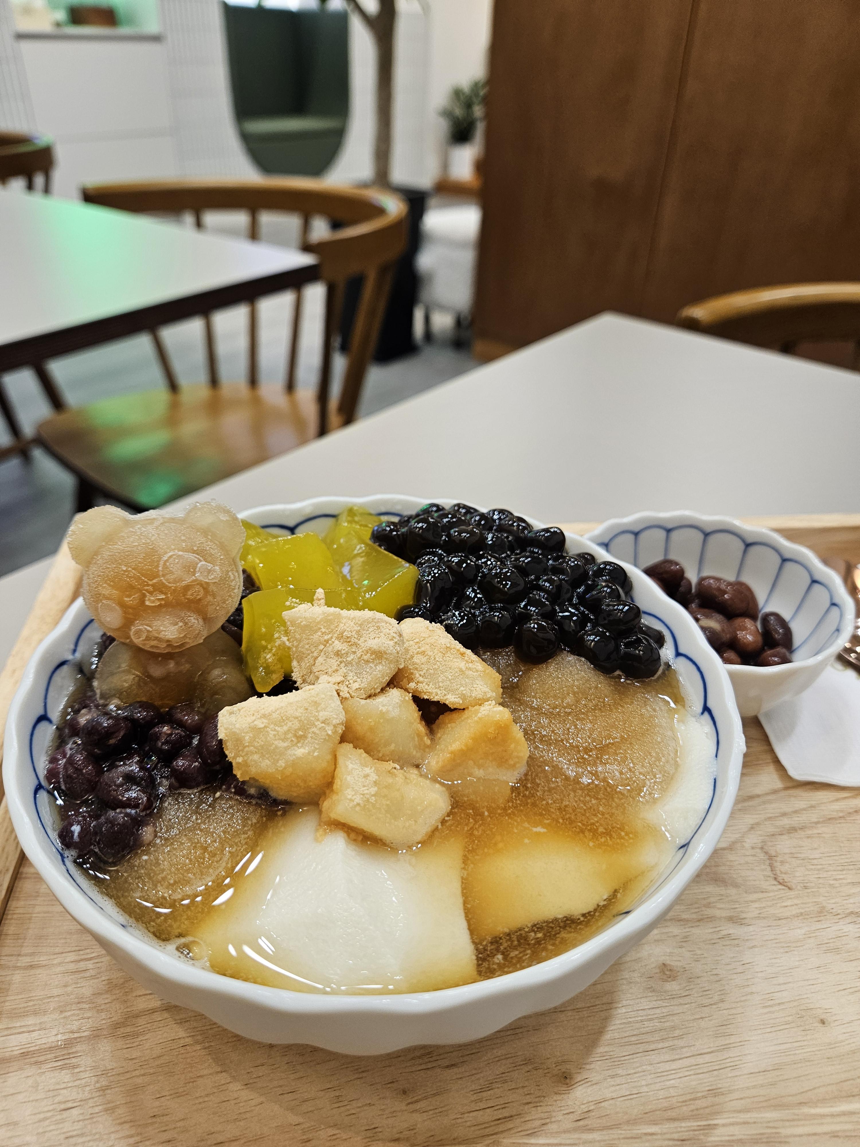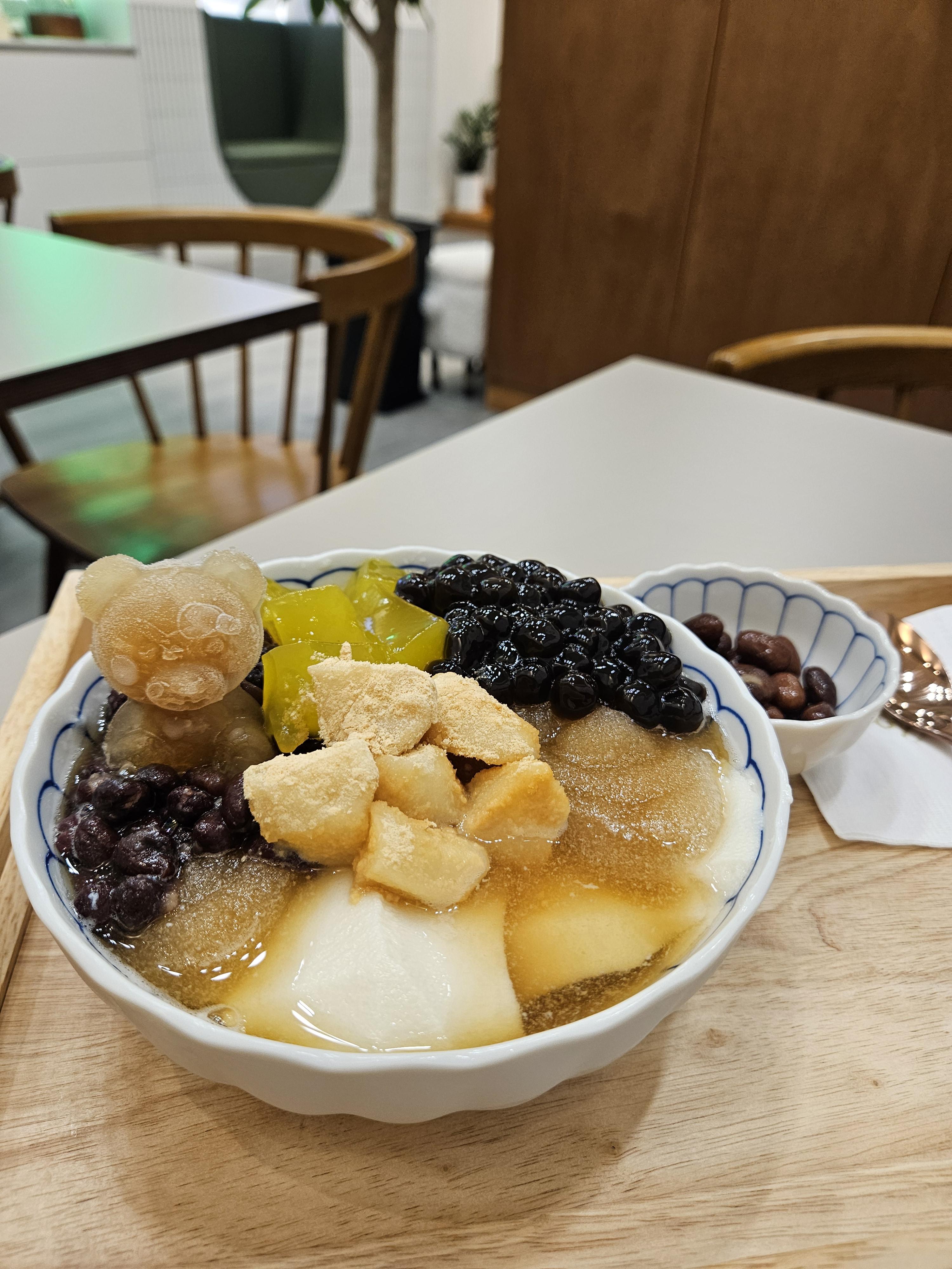 너무 행복한 플레이팅 살얼음 흑당 국물 베이스에 연두부보다 밀도 높은 부드러움 자랑하는 대두, 적당히 달콤한 팥과 호랑이콩, 타피오카펄, 치자젤리, 인절미 식감도 쫄깃한 게 시원하고 다양한 식감과 맛을 느낄 수 있는 종합 선물 세트 같은 디저트!