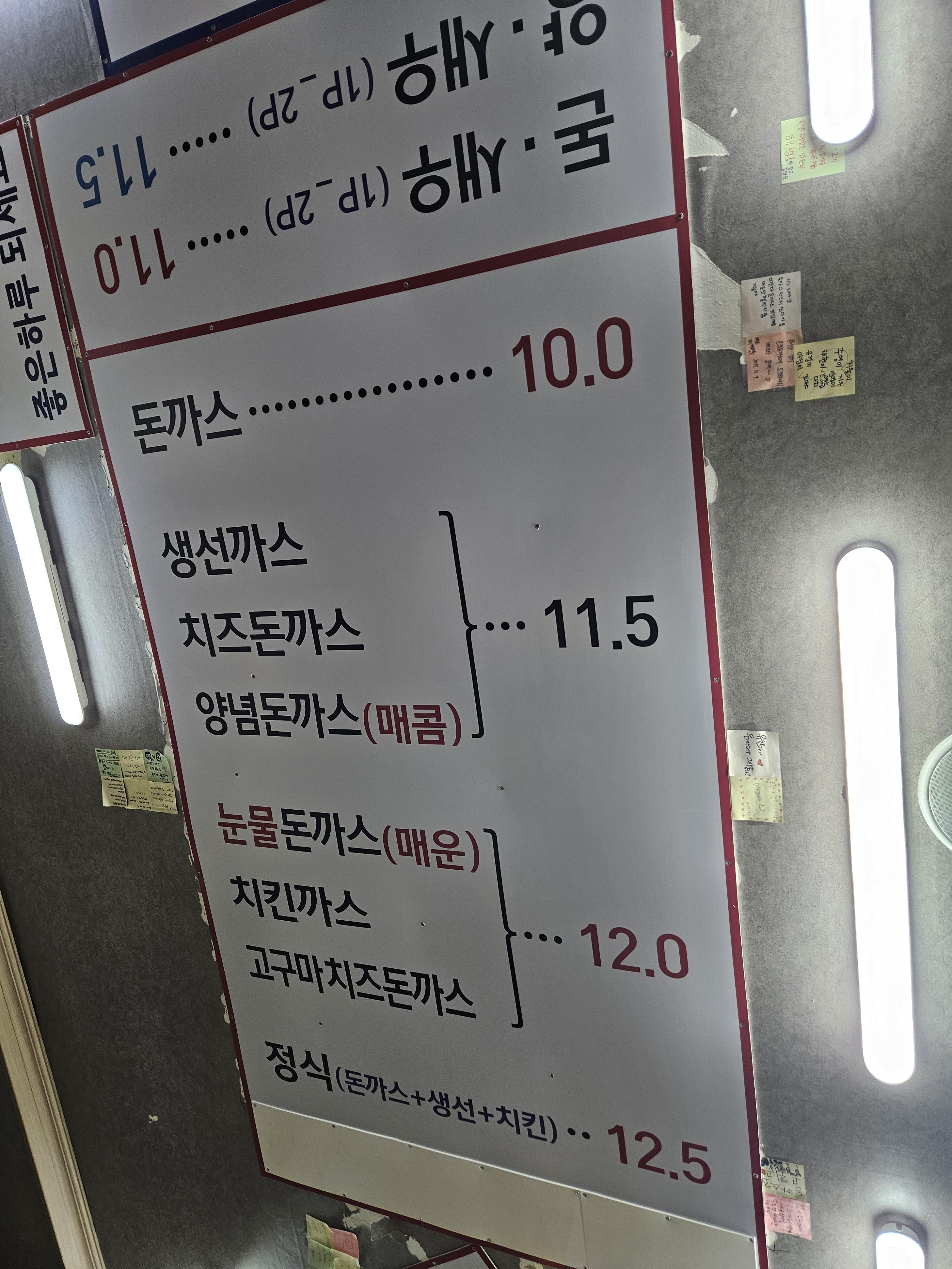 돈+새우(1p-2p), 양념+새우(1p-2p), 매콤한 양념 돈가스, 더 매운 눈물 돈가스 그리고 정식(돈가스+생선+치킨) 메뉴가 있다.