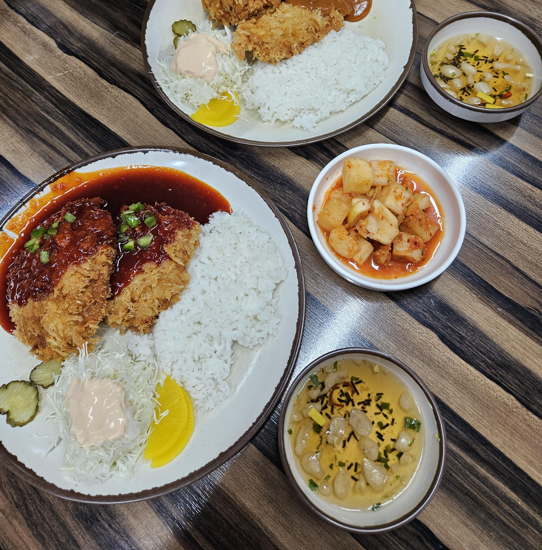 일반 사이즈 돈가스는 2장씩 나오고 양배추 채에 캐요네즈, 피클, 단무지, 밥을 담아 접시에 하나씩 주심.