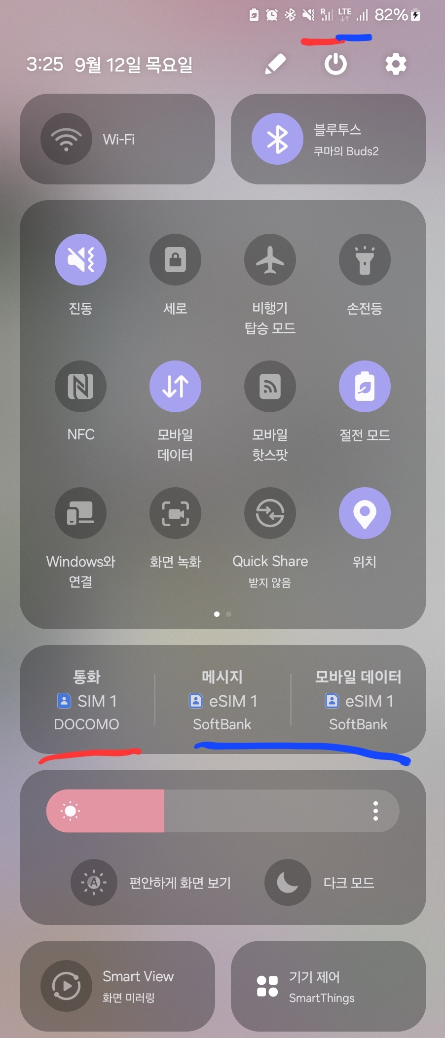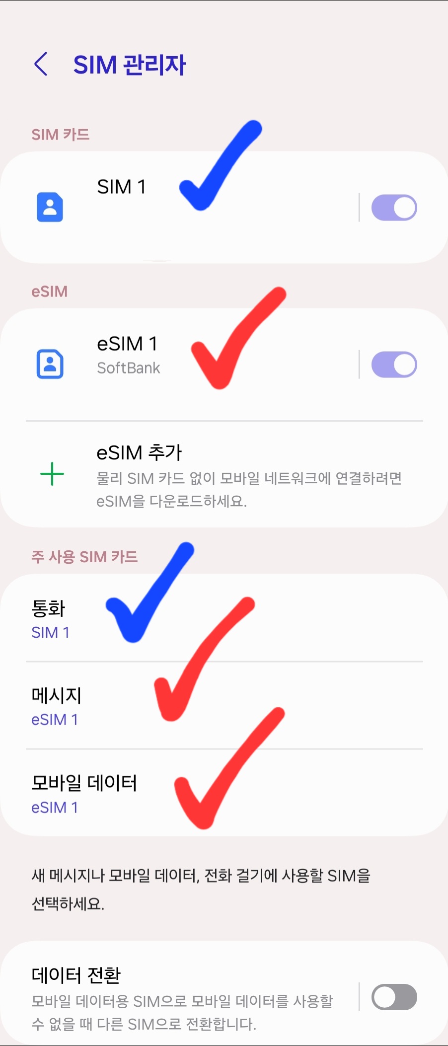 한국에서 오는 전화 확인이 필요해서 통화는 원래 유심, 메시지랑 모바일데이터는 이심으로 설정했다.