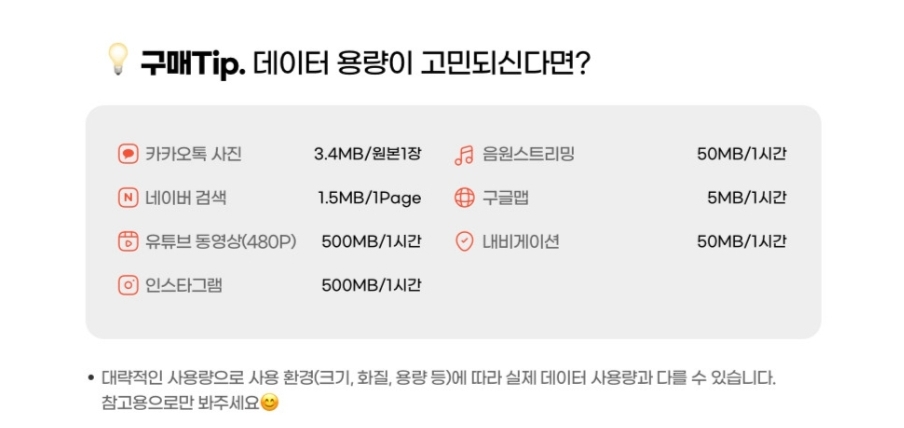 판매처에서 제시한 대략적인 데이터 사용량 참고해서 잘 생각해서 구입하는 걸 권장함.