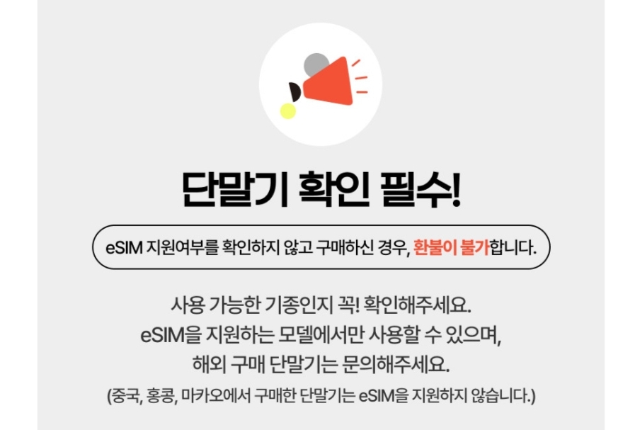 대개 E-sim 판매처에서 지원 단말기 리스트 상세정보를 제공하니 단말기 지원 여부 확인 후 구입해야 함.