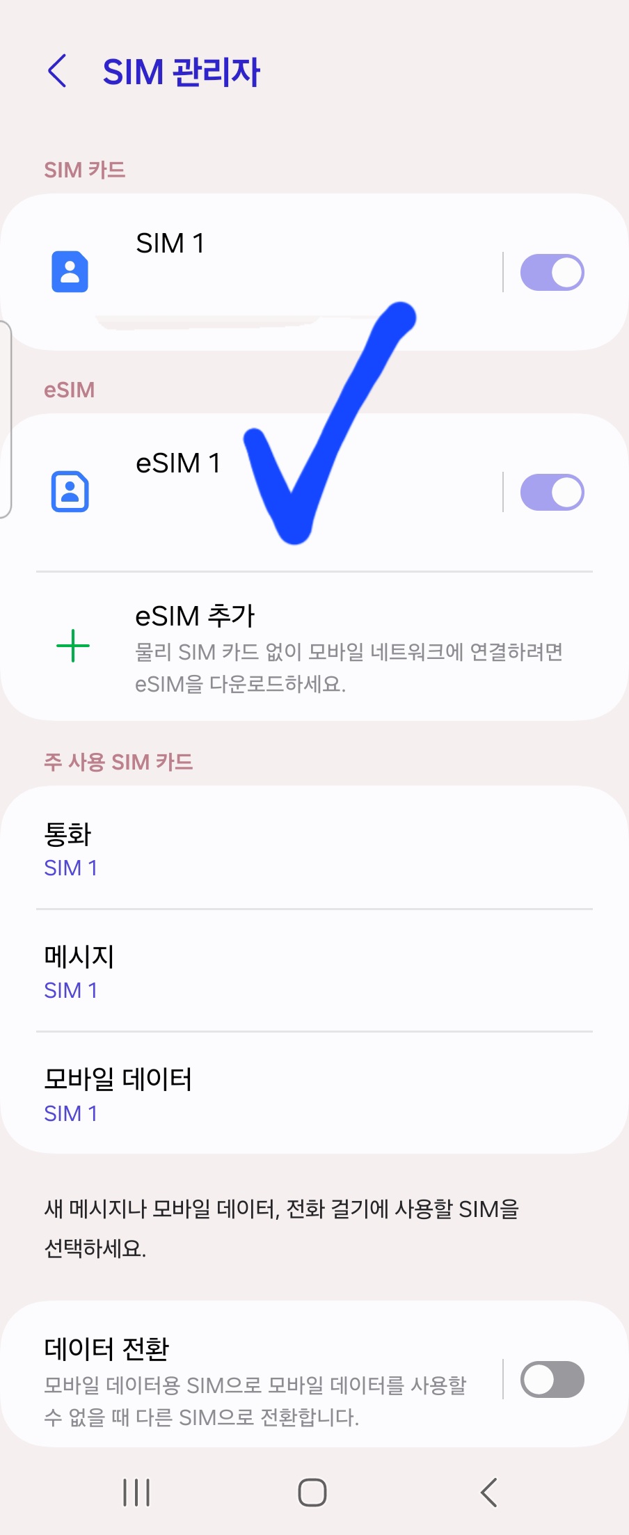 아무것도 없던 E-sim이 활성화되었다.