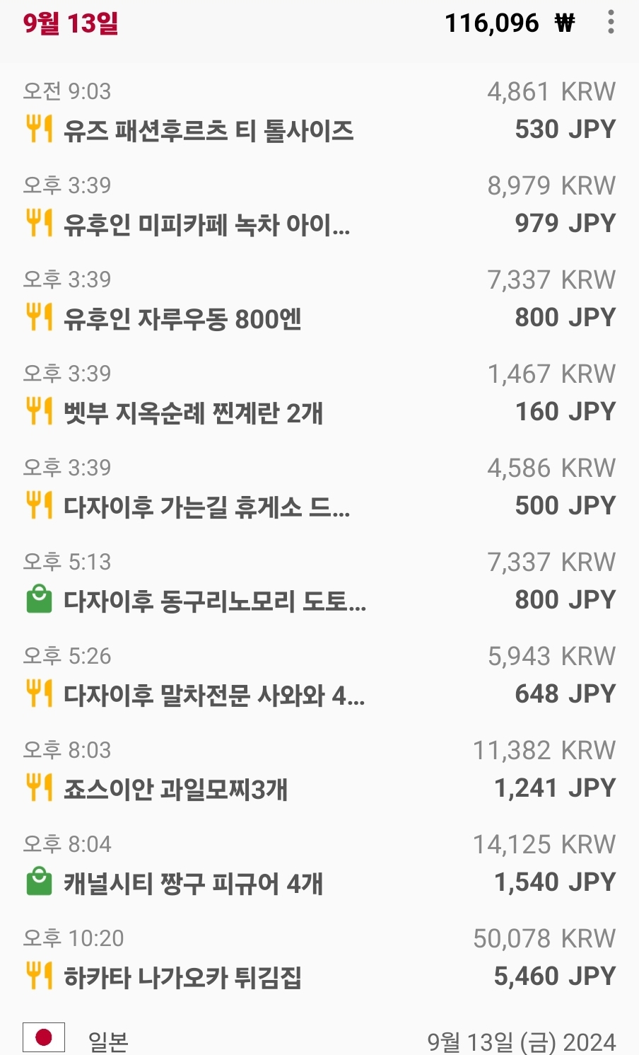 1일차 17,261엔 + 2일차 4,942엔 + 3일차 12,658엔 + 4일차 5,821엔 = 엔화 40,682엔