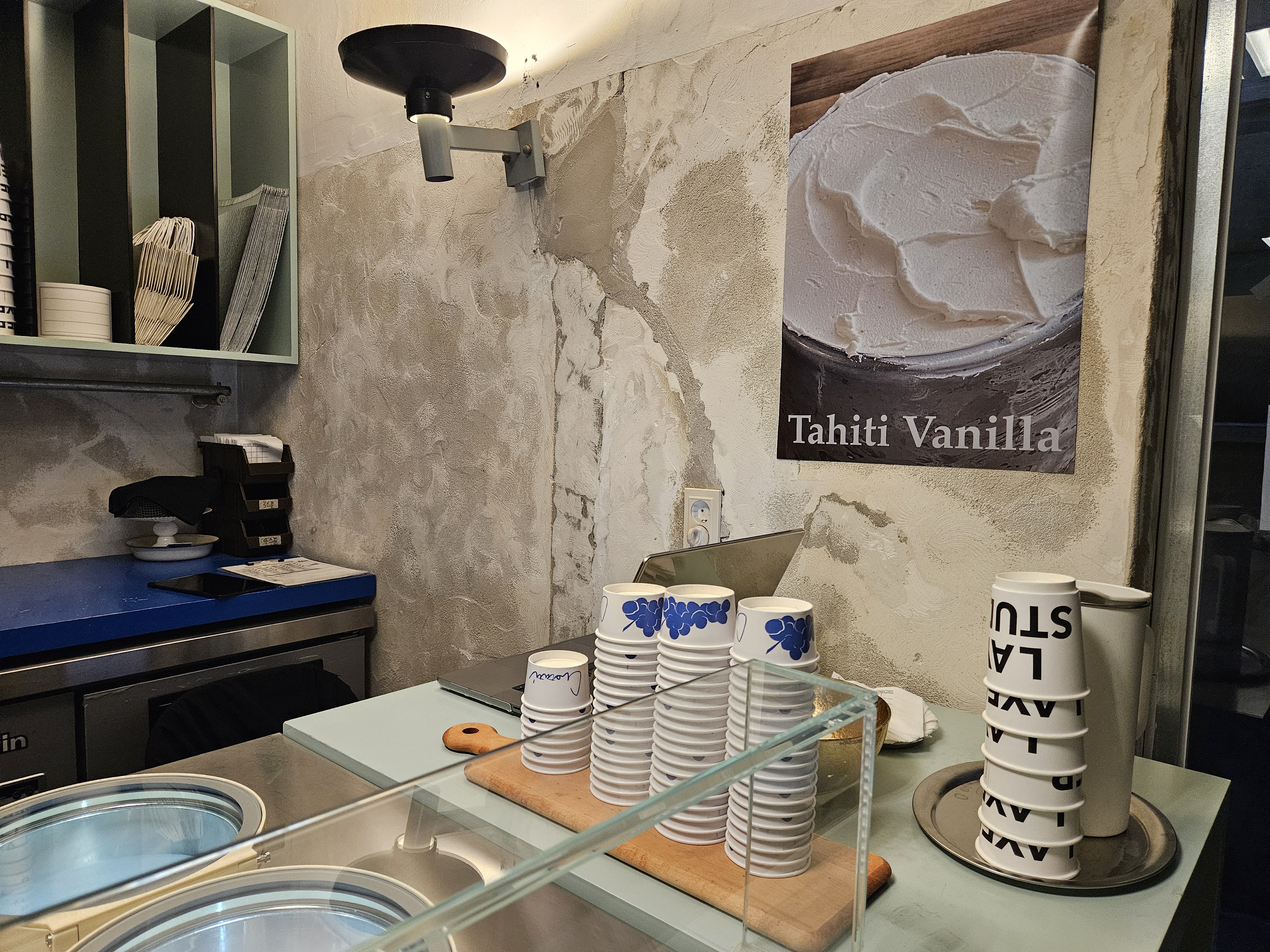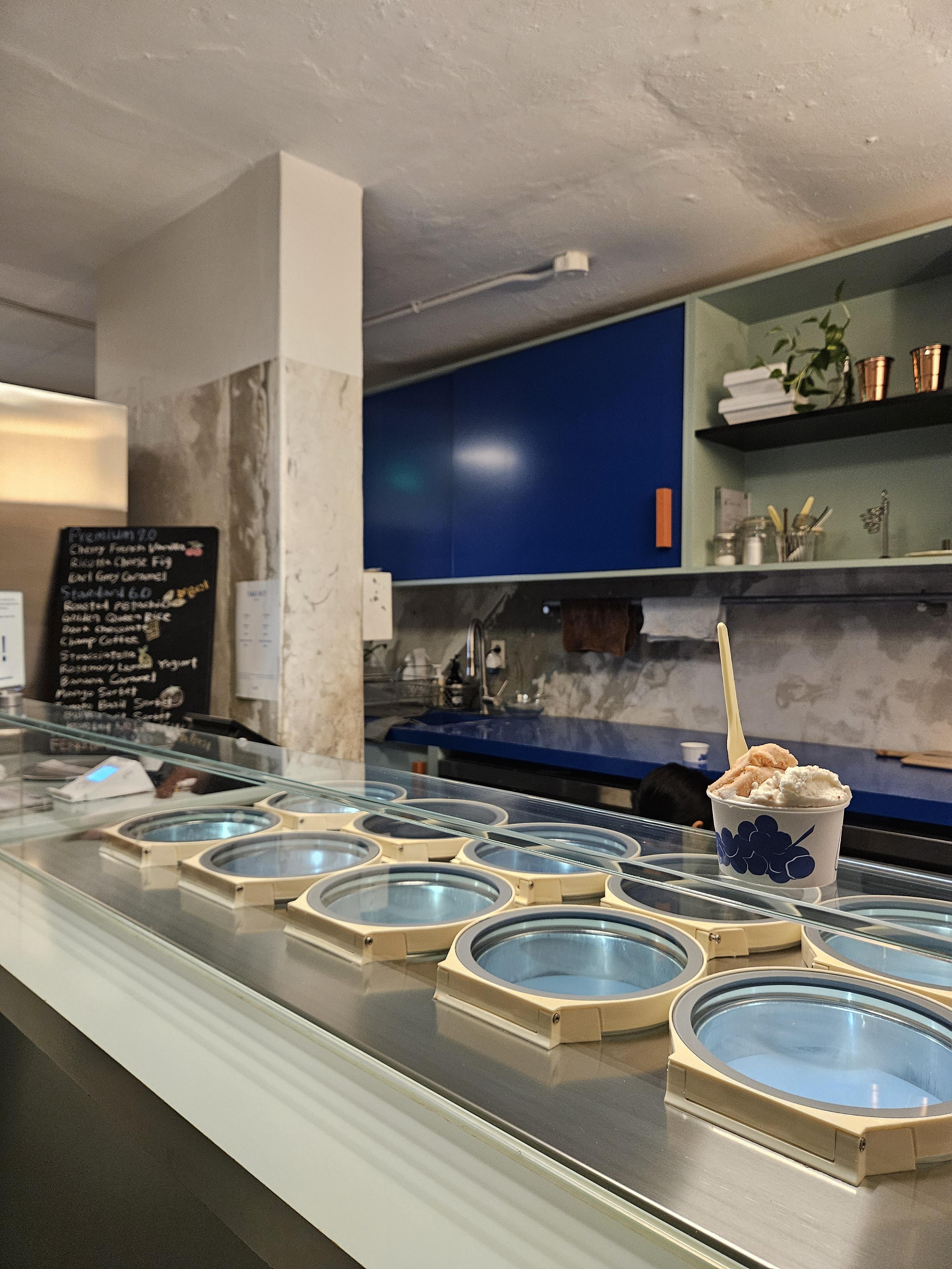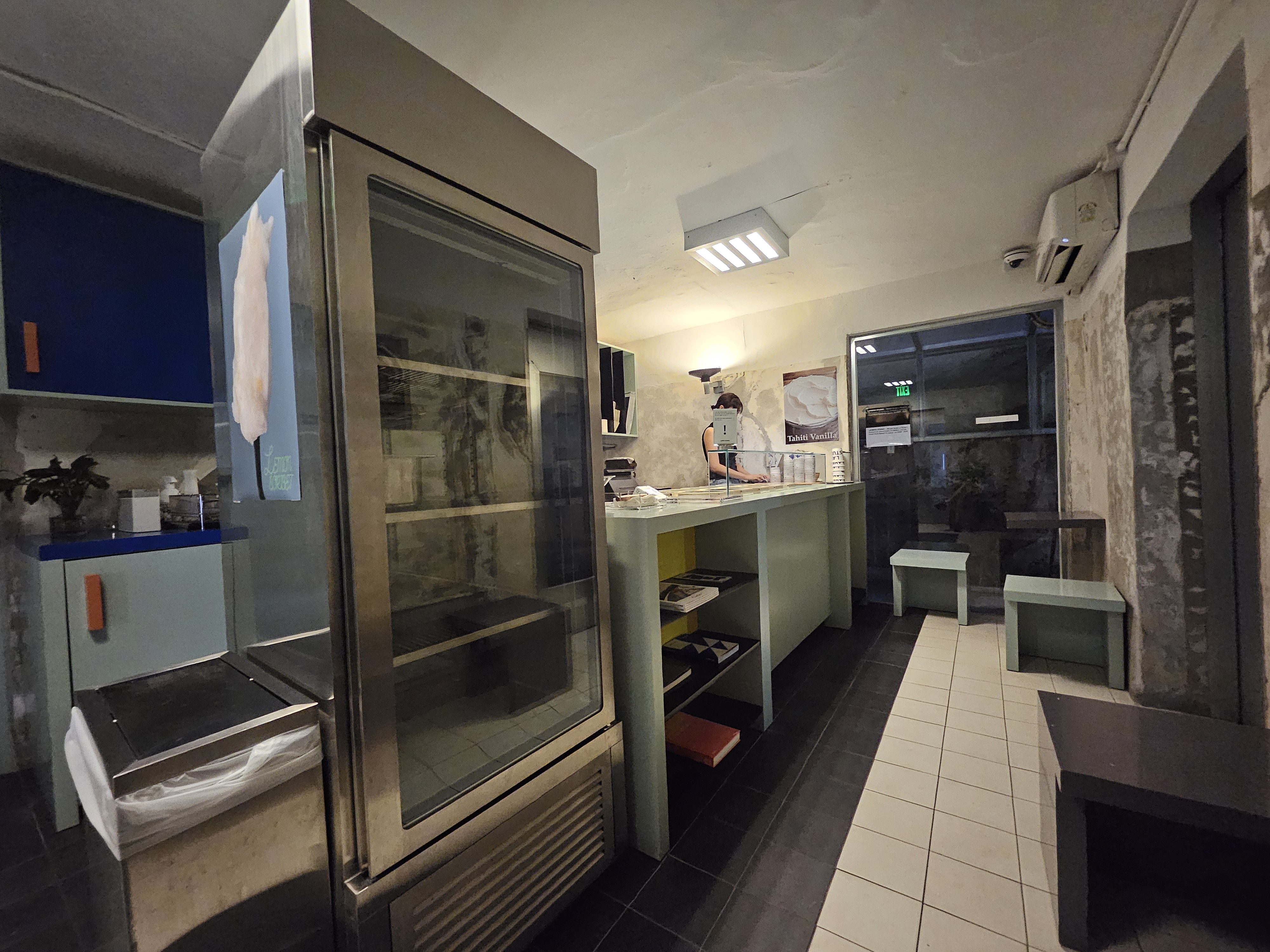 카페와 젤라또는 다른 집이라 젤라또 먹으려면 1층 매장 안이나 밖에 벤치에서 먹을 수 있음. 날이 더워 안에 자리 잡았는데 매장은 협소하고 좌석도 많지 않지만 힙한 분위기에 젤라또 종류도 흔하지 않아 마음에 들더라.